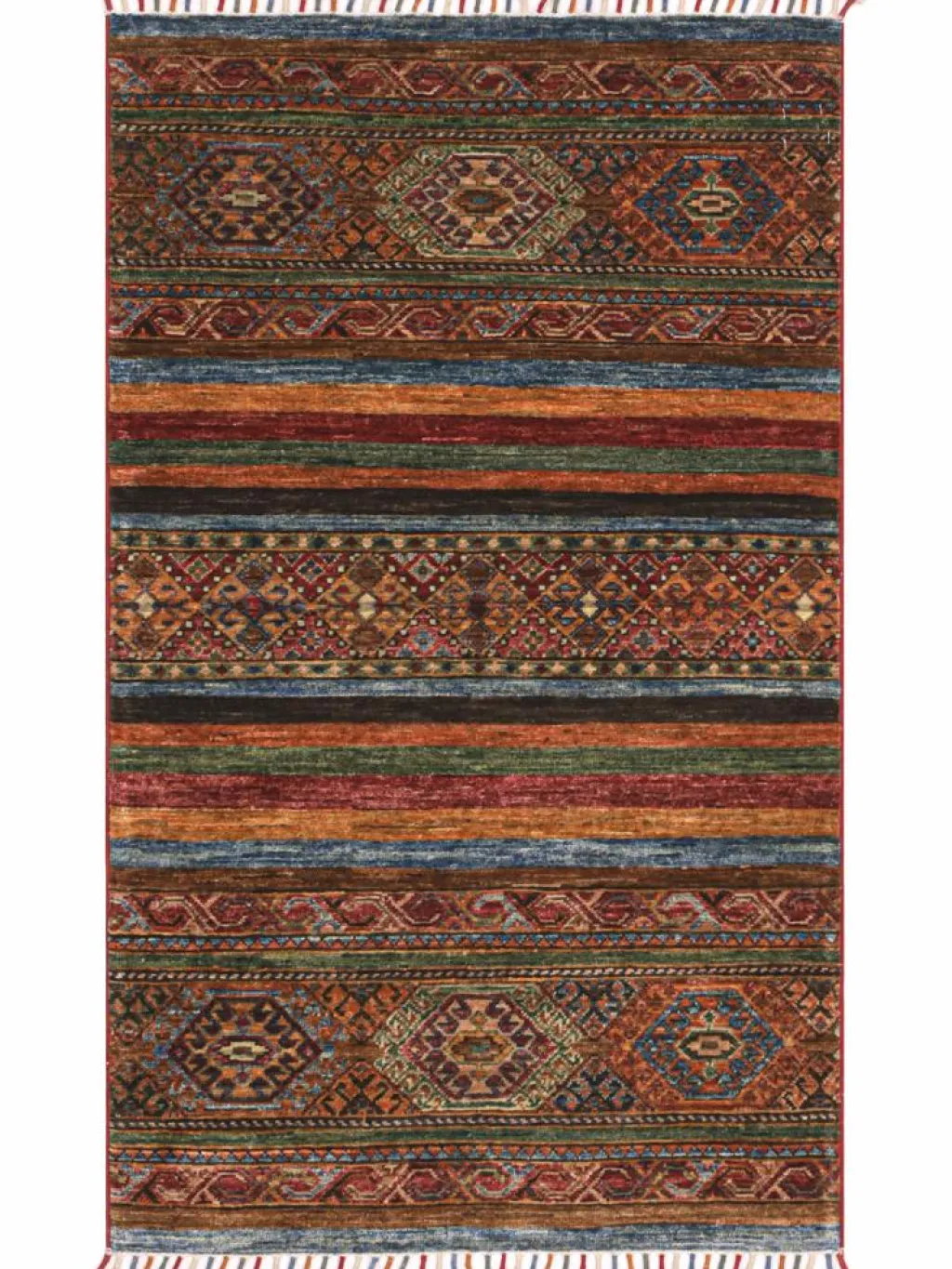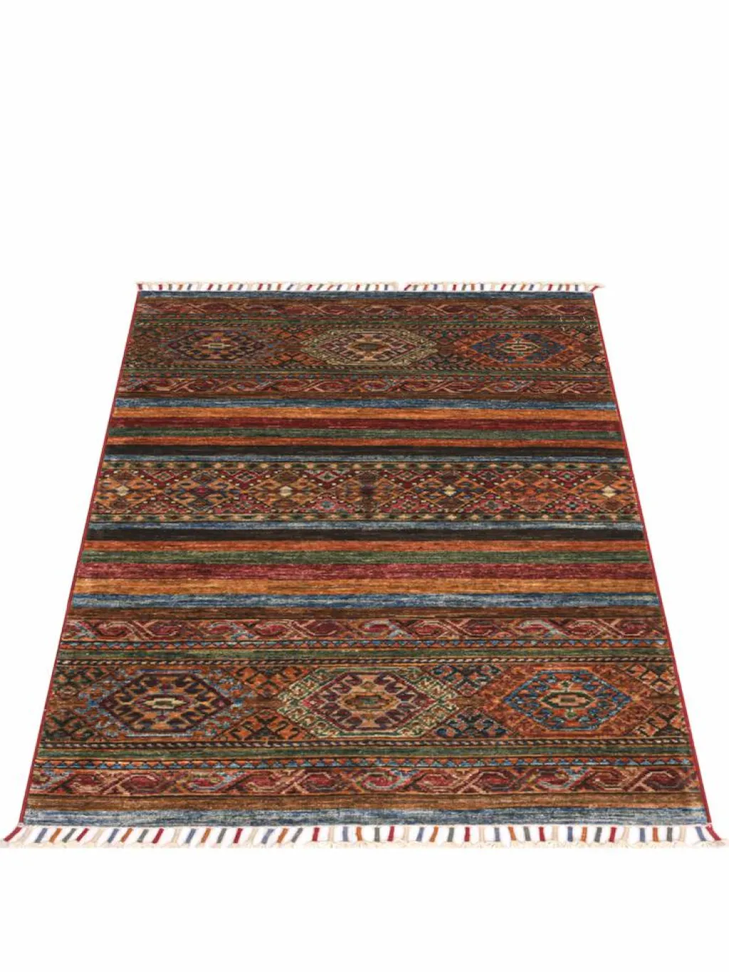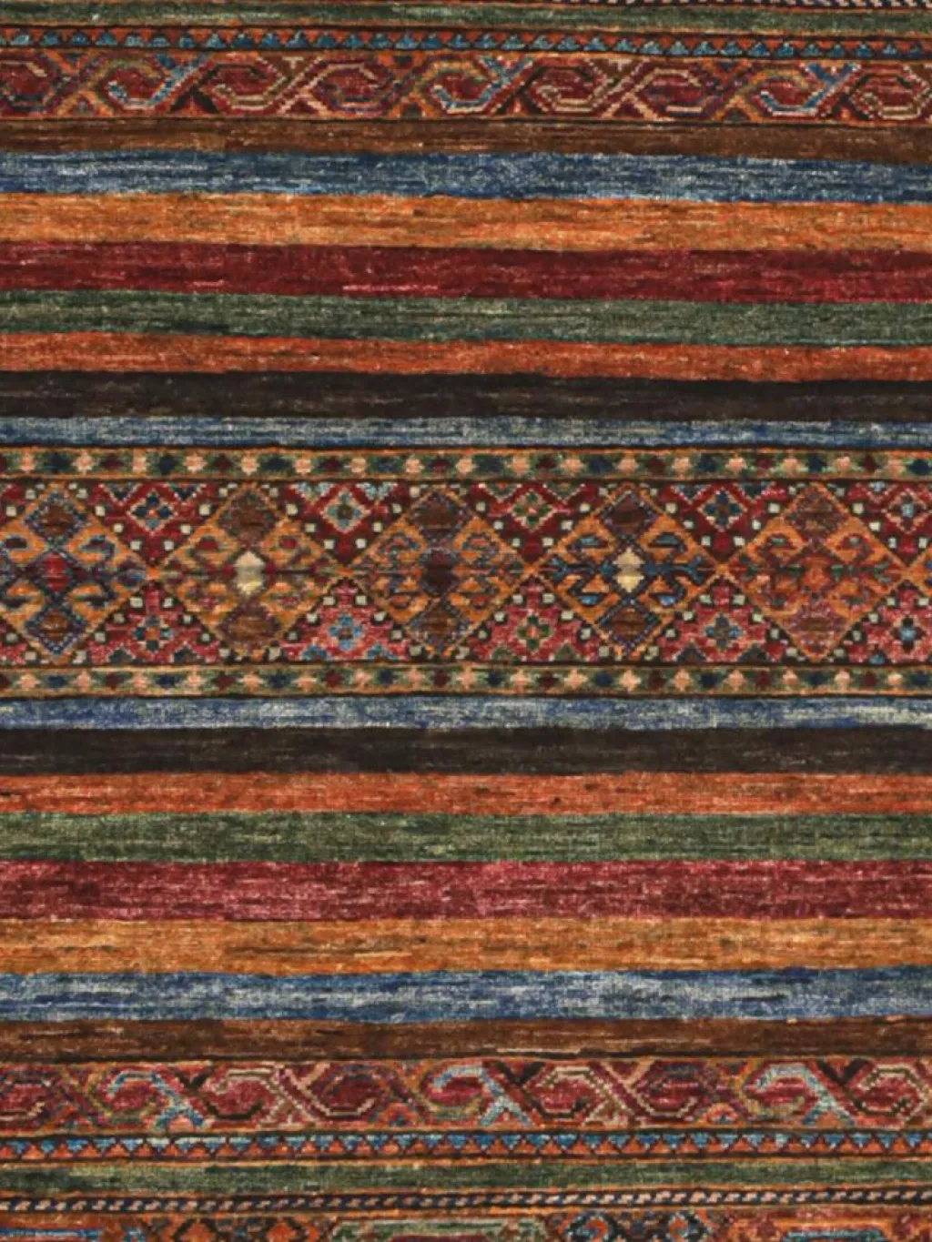 -Muster sind bunte Längsstreifen mit vielen verschiedenen Motiven gefüllt. Durch den flachen und festen Flor ist der Teppich unempfindlich gegenüber den Belastungen des Alltags. – Das Besondere an diesemOrientteppich