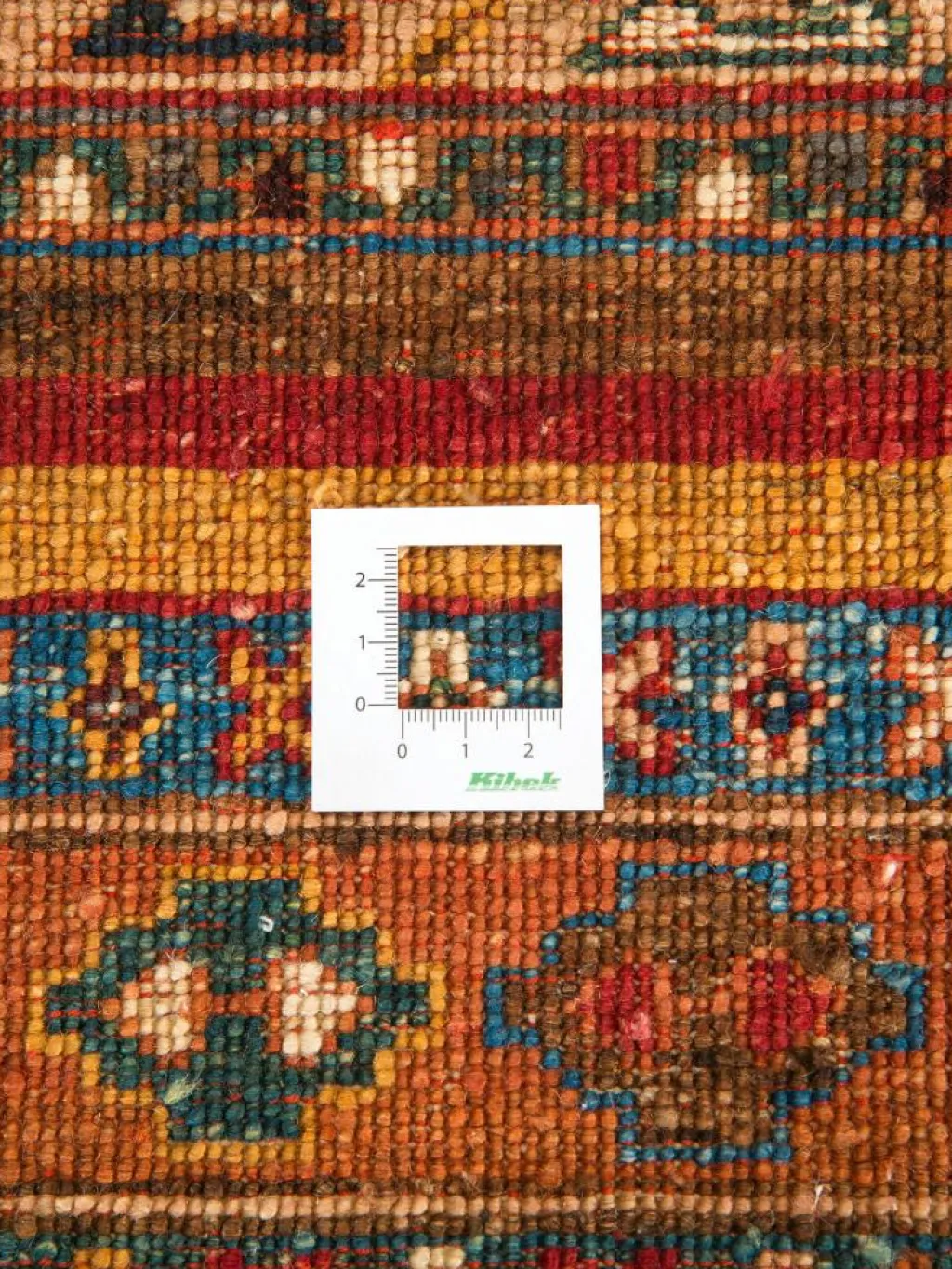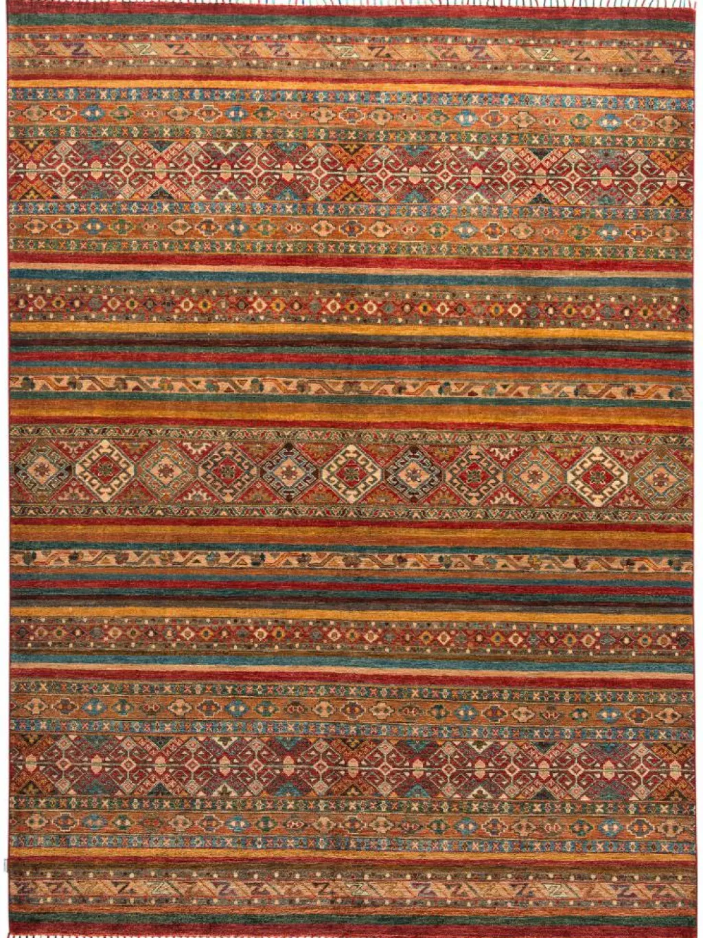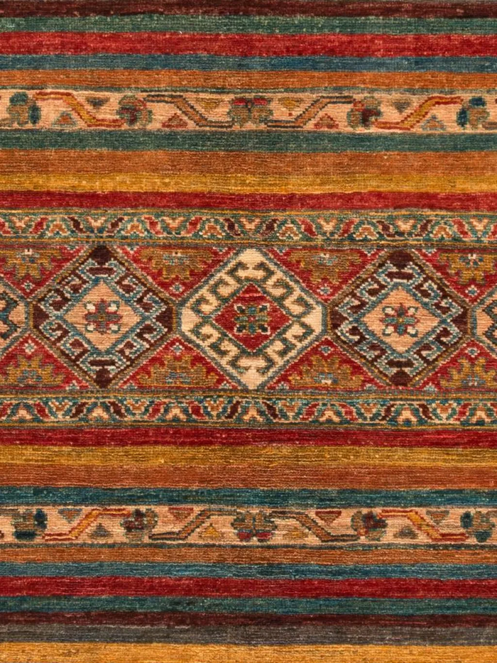 -Muster sind bunte Längsstreifen mit vielen verschiedenen Motiven gefüllt. Durch den flachen und festen Flor ist der Teppich unempfindlich gegenüber den Belastungen des Alltags.- Das Besondere an diesemOrientteppich