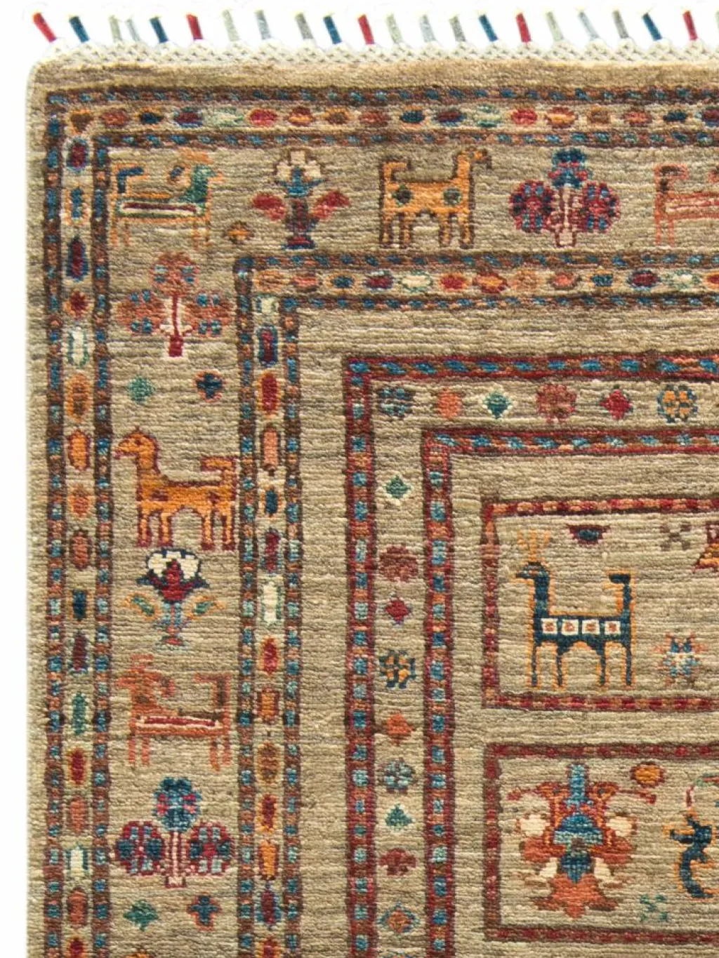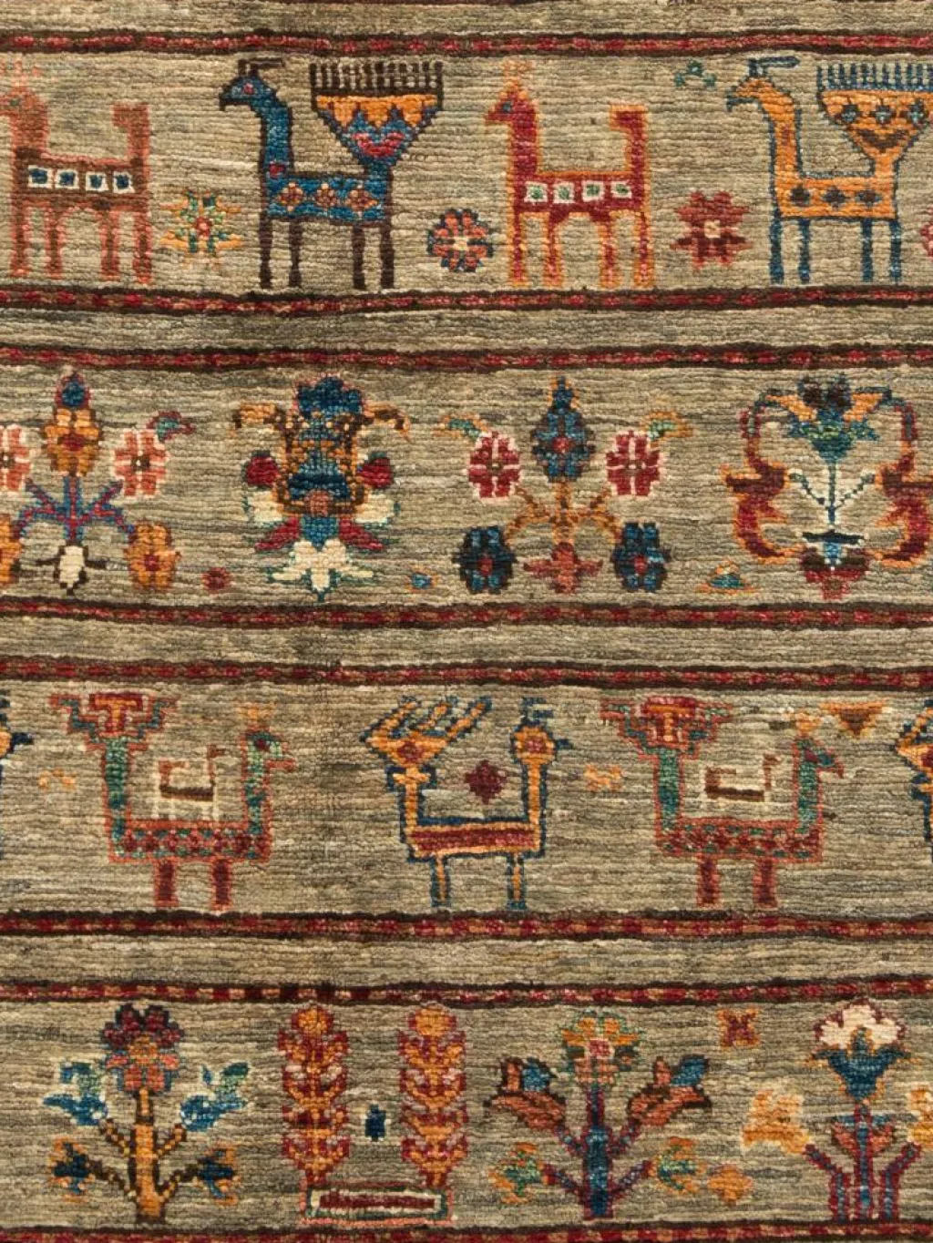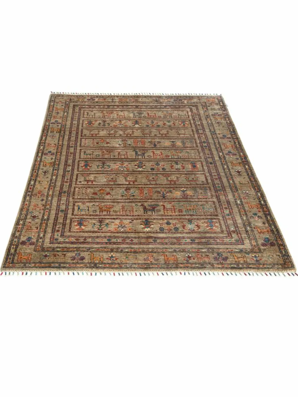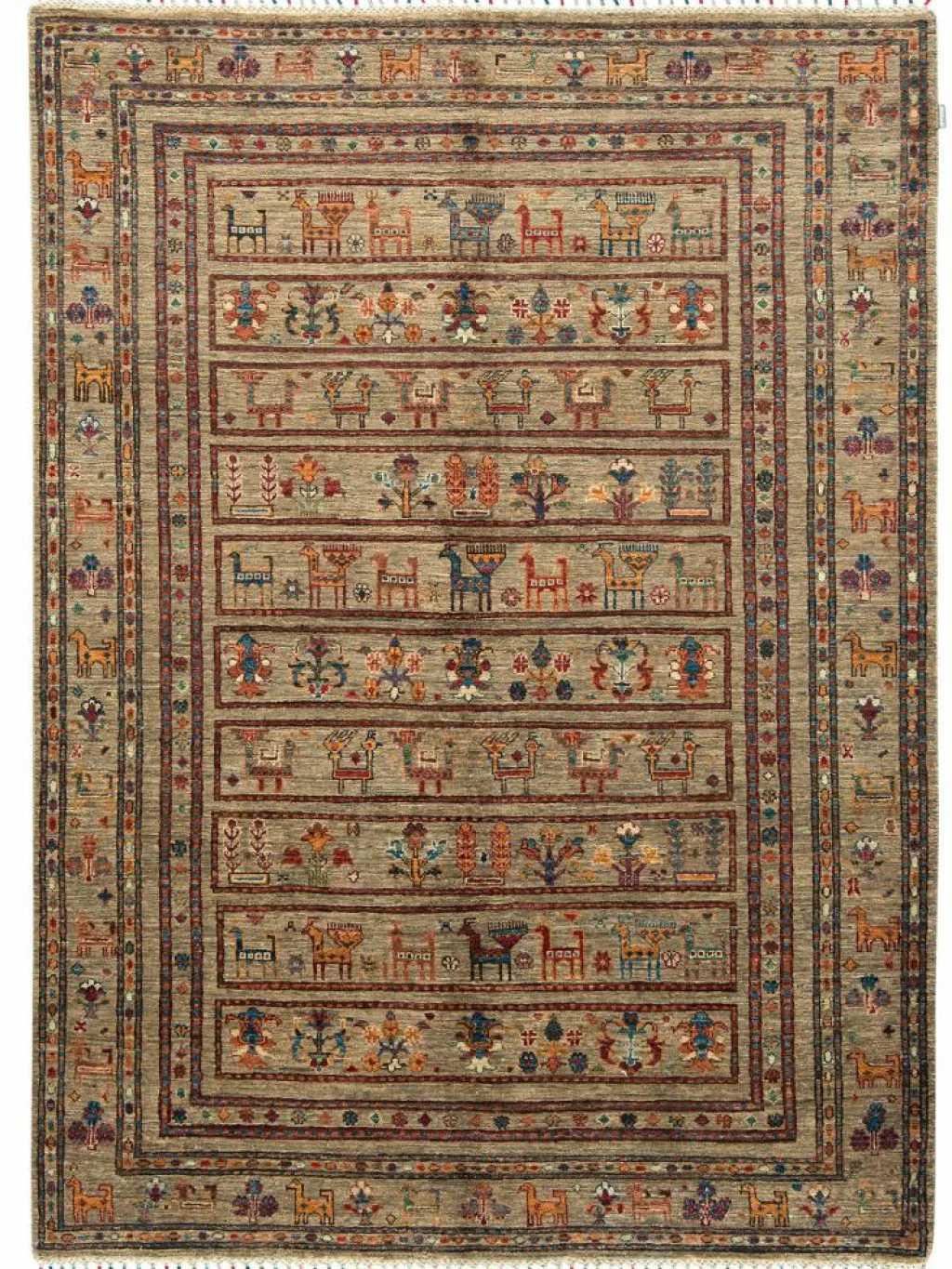 -Muster sind bunte Längsstreifen mit vielen verschiedenen Motiven gefüllt. Durch den flachen und festen Flor ist der Teppich unempfindlich gegenüber den Belastungen des Alltags.- Das Besondere an diesemOrientteppich