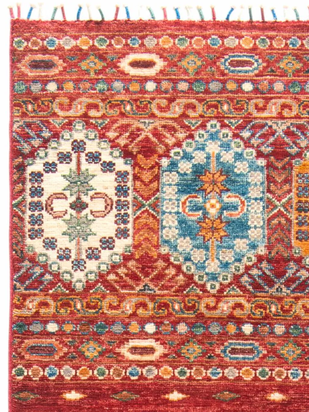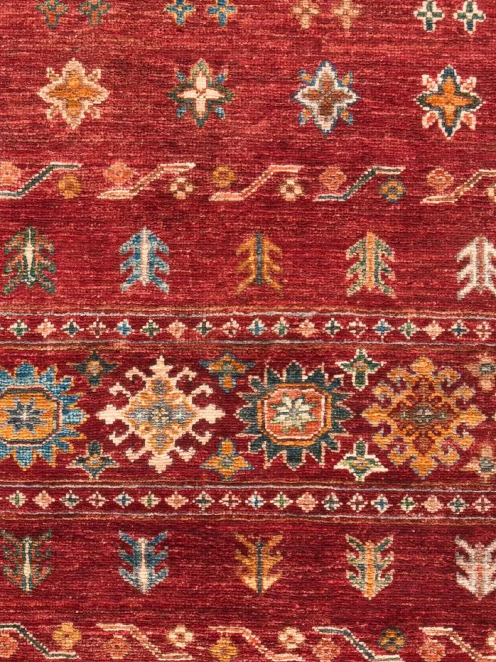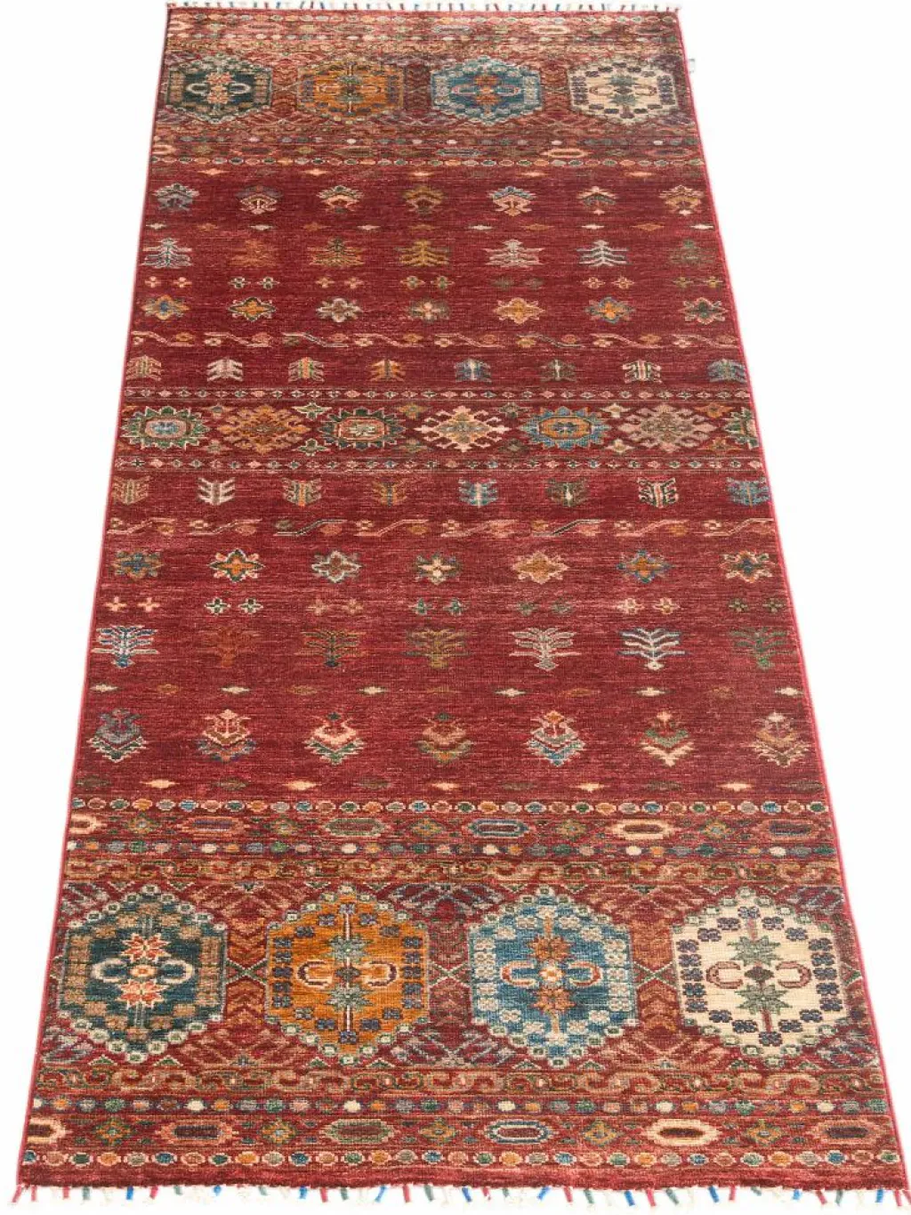 -Muster sind bunte Längsstreifen mit vielen verschiedenen Motiven gefüllt. Durch den flachen und festen Flor ist der Teppich unempfindlich gegenüber den Belastungen des Alltags.- Das Besondere an diesemOrientteppich