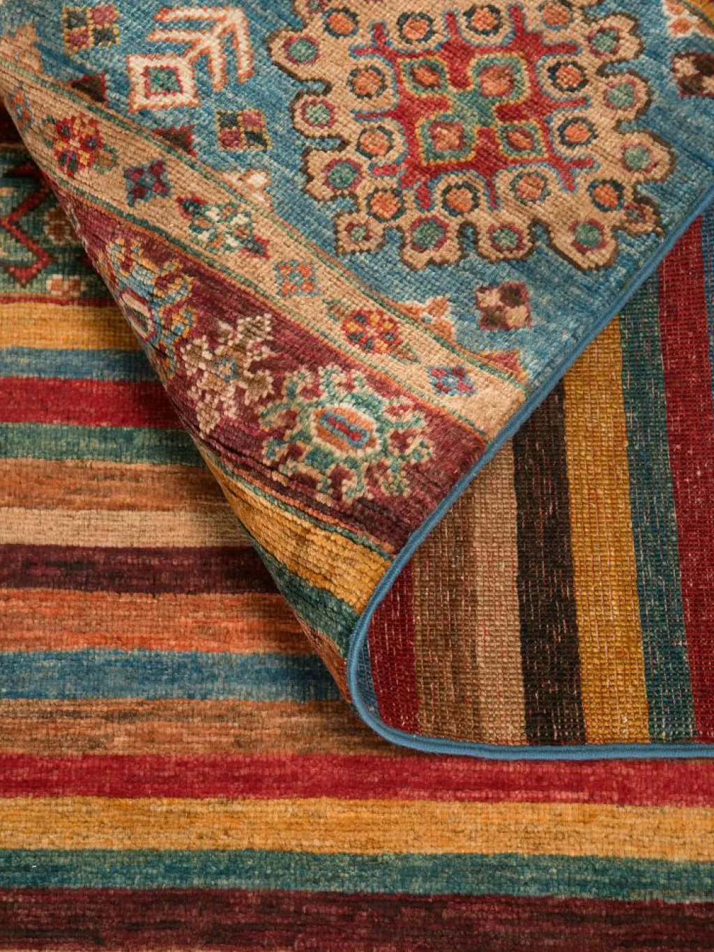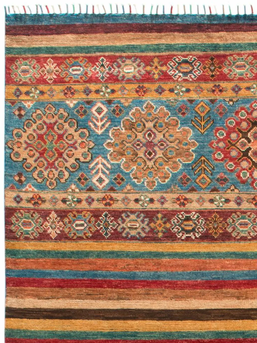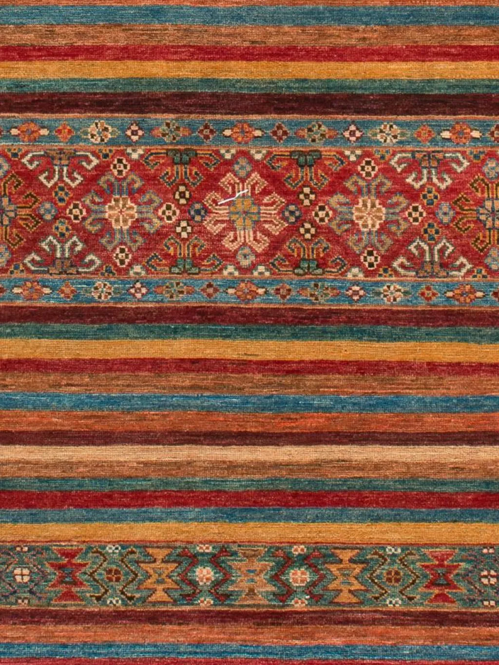 -Muster sind bunte Längsstreifen mit vielen verschiedenen Motiven gefüllt. Durch den flachen und festen Flor ist der Teppich unempfindlich gegenüber den Belastungen des Alltags.- Das Besondere an diesemOrientteppich
