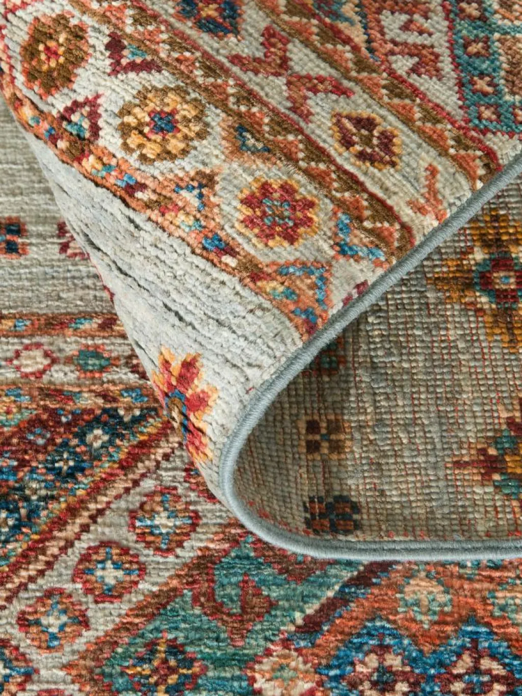 mit bunten Fäden zusammen gebunden. Durch den flachen und festen Flor ist der Teppich unempfindlich gegenüber den Belastungen des Alltags.| Gesamthöhe: | ca. 6 mm |