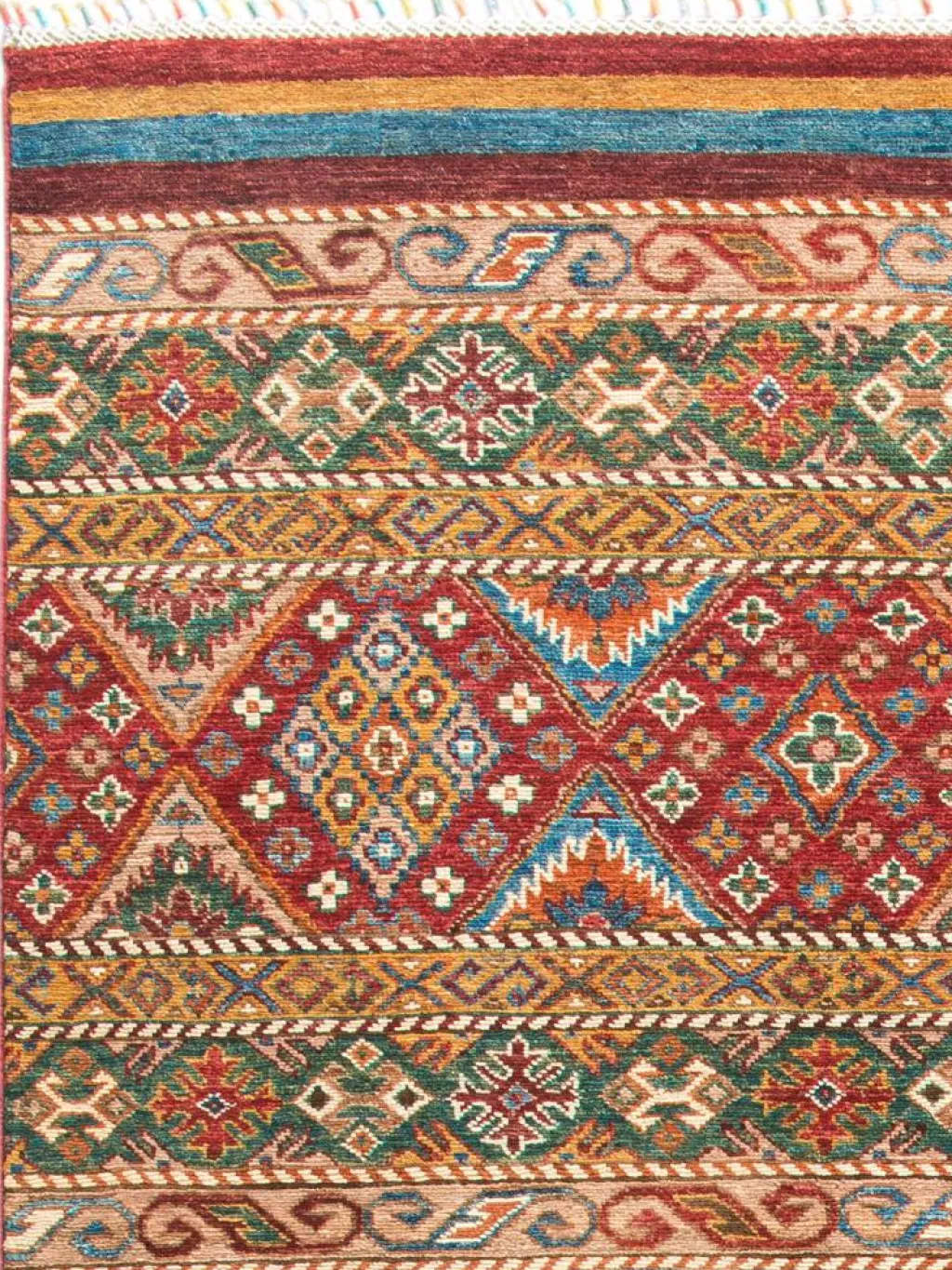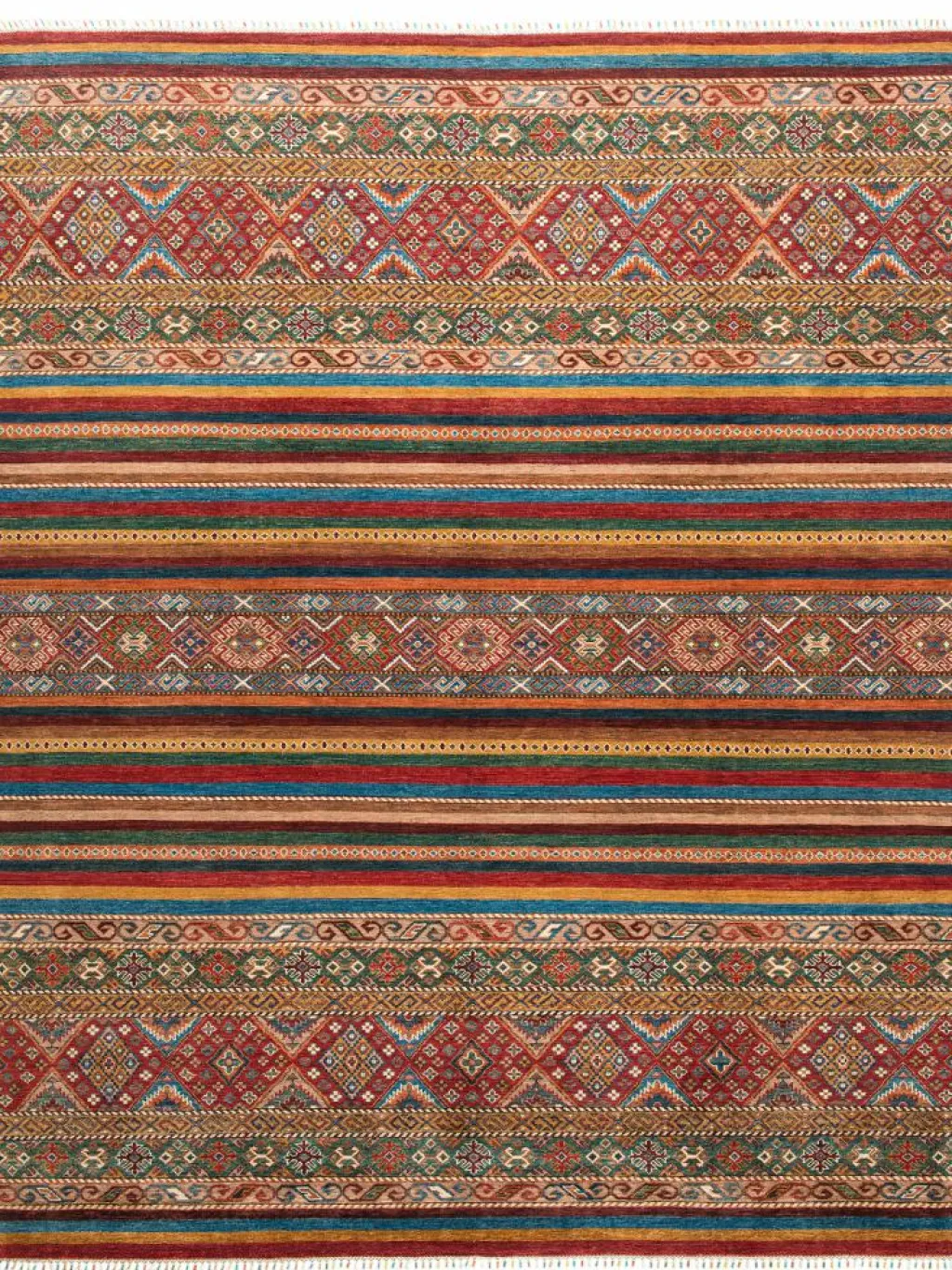 -Muster sind bunte Längsstreifen mit vielen verschiedenen Motiven gefüllt. Durch den flachen und festen Flor ist der Teppich unempfindlich gegenüber den Belastungen des Alltags.- Das Besondere an diesemOrientteppich