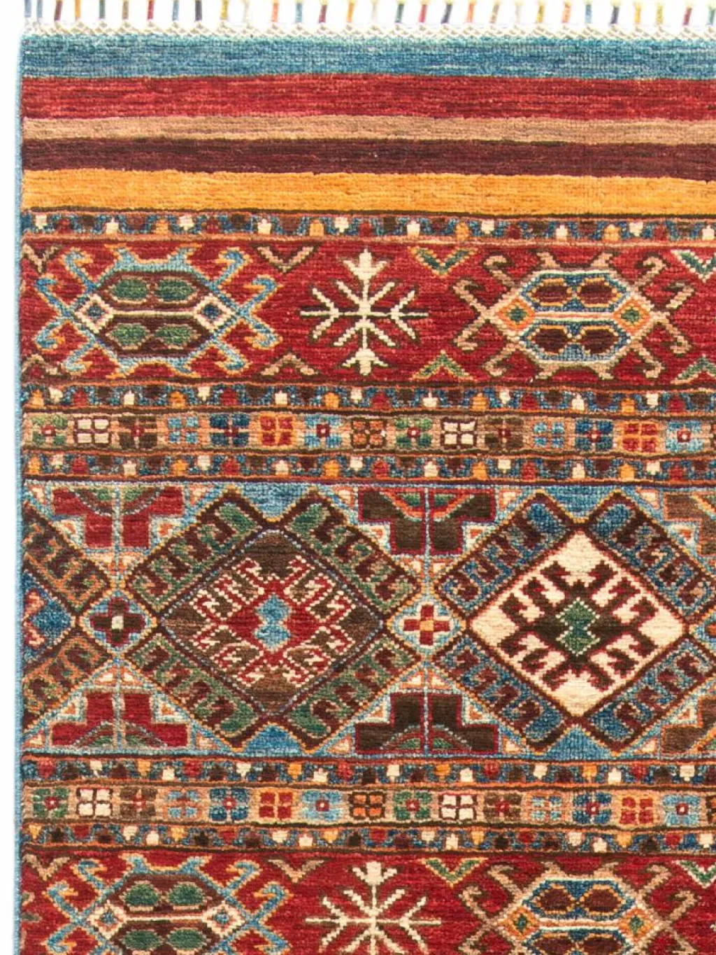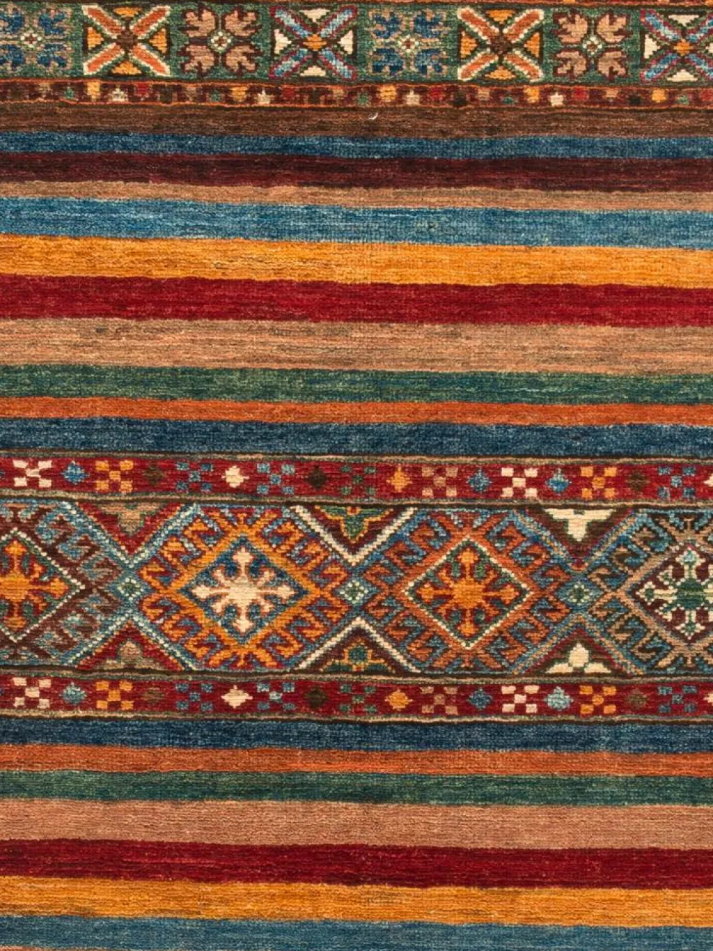 -Muster sind bunte Längsstreifen mit vielen verschiedenen Motiven gefüllt. Durch den flachen und festen Flor ist der Teppich unempfindlich gegenüber den Belastungen des Alltags.- Das Besondere an diesemOrientteppich