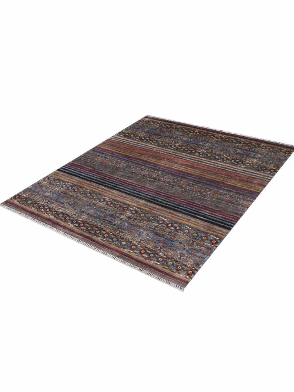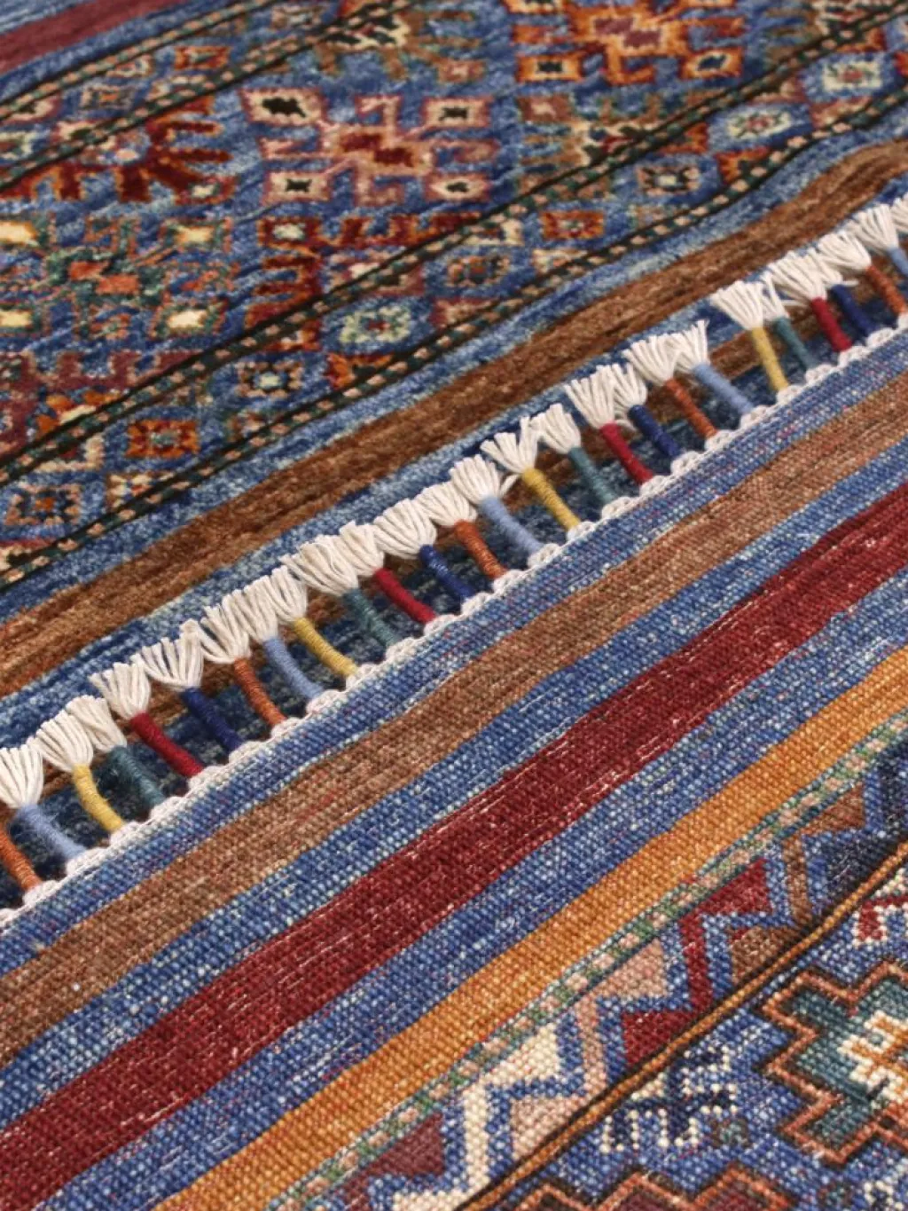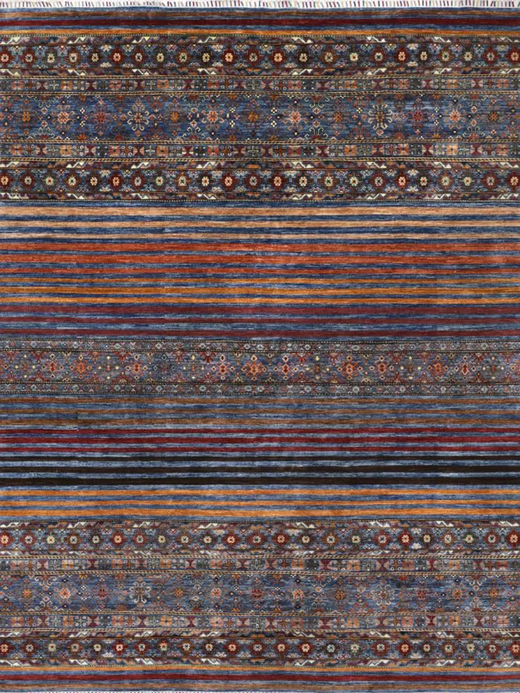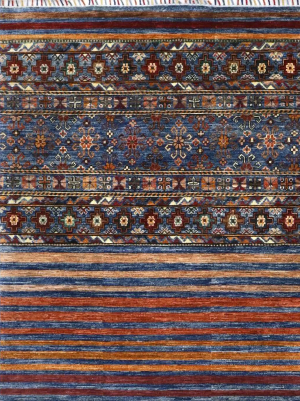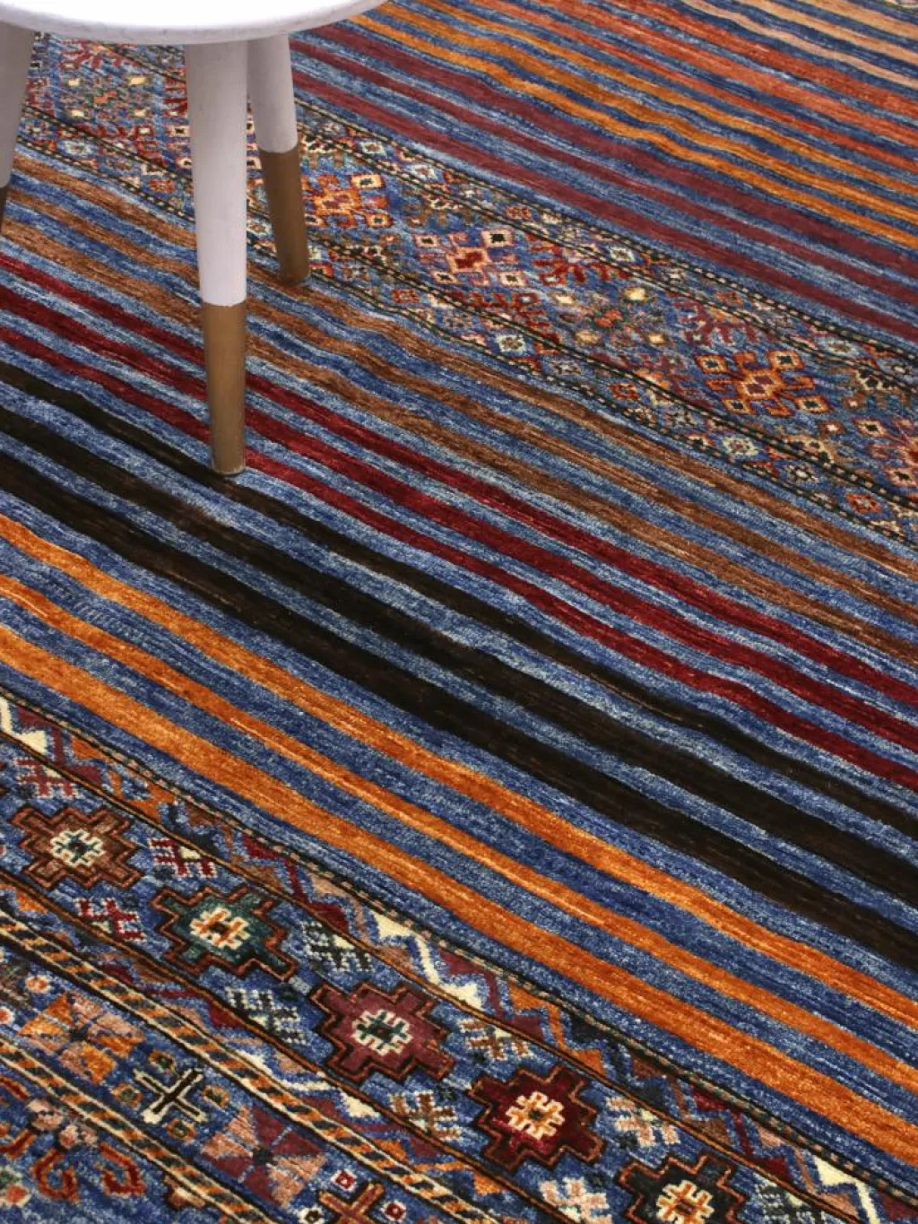 -Muster sind bunte Längsstreifen mit vielen verschiedenen Motiven gefüllt. Durch den flachen und festen Flor ist der Teppich unempfindlich gegenüber den Belastungen des Alltags. – Das Besondere an diesemOrientteppich