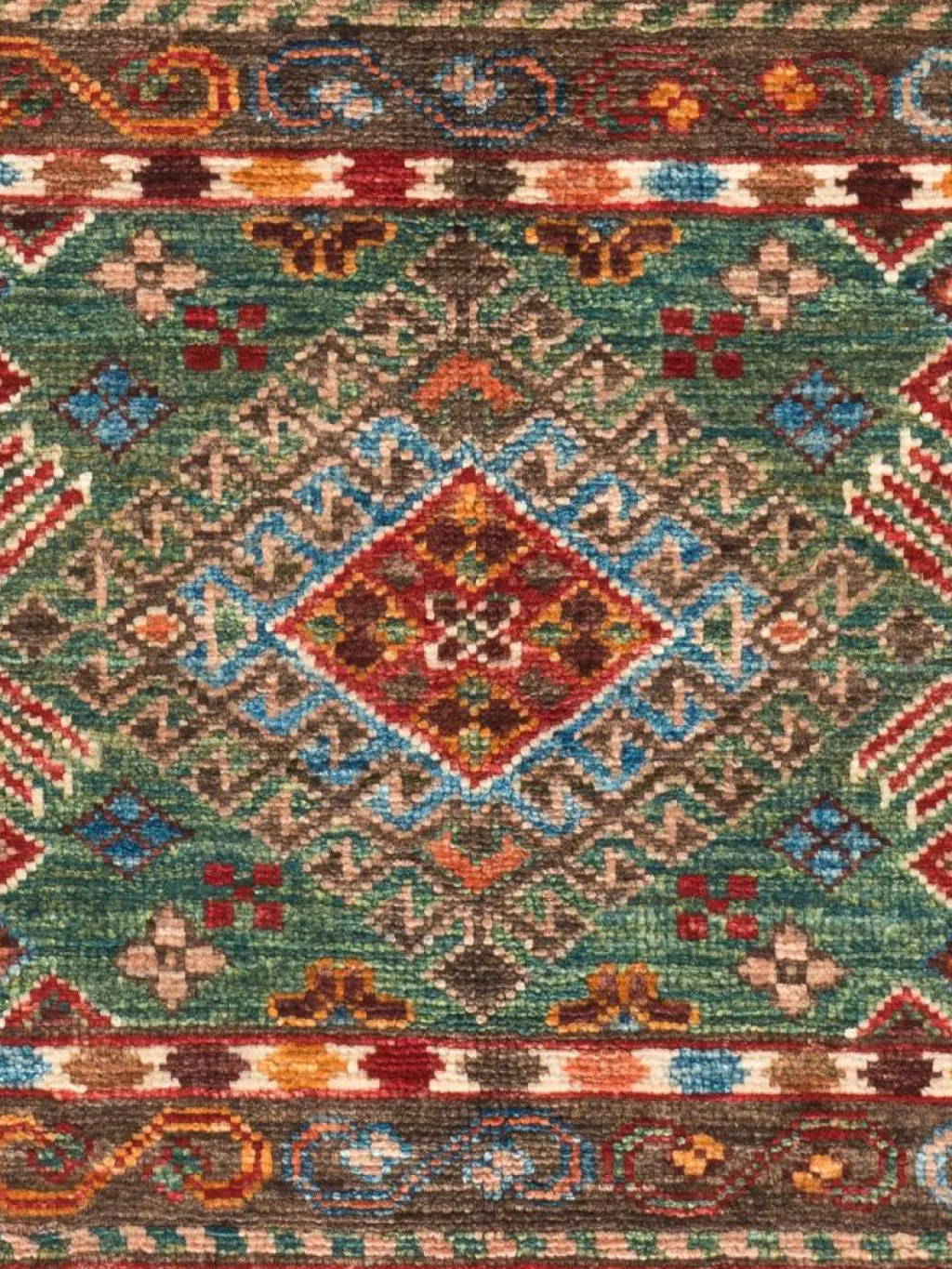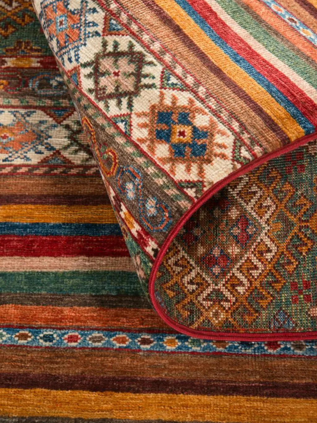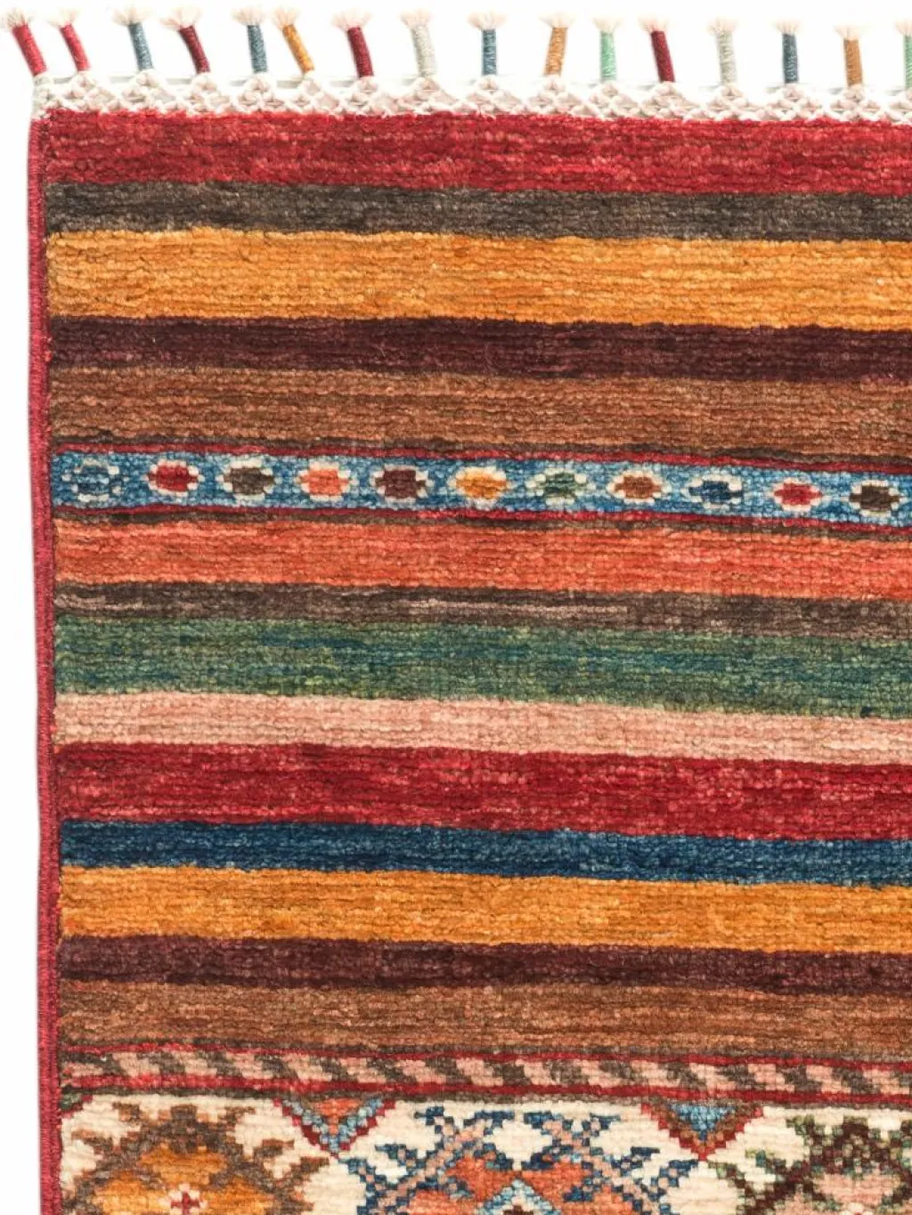 -Muster sind bunte Längsstreifen mit vielen verschiedenen Motiven gefüllt. Durch den flachen und festen Flor ist der Teppich unempfindlich gegenüber den Belastungen des Alltags.- Das Besondere an diesemOrientteppich