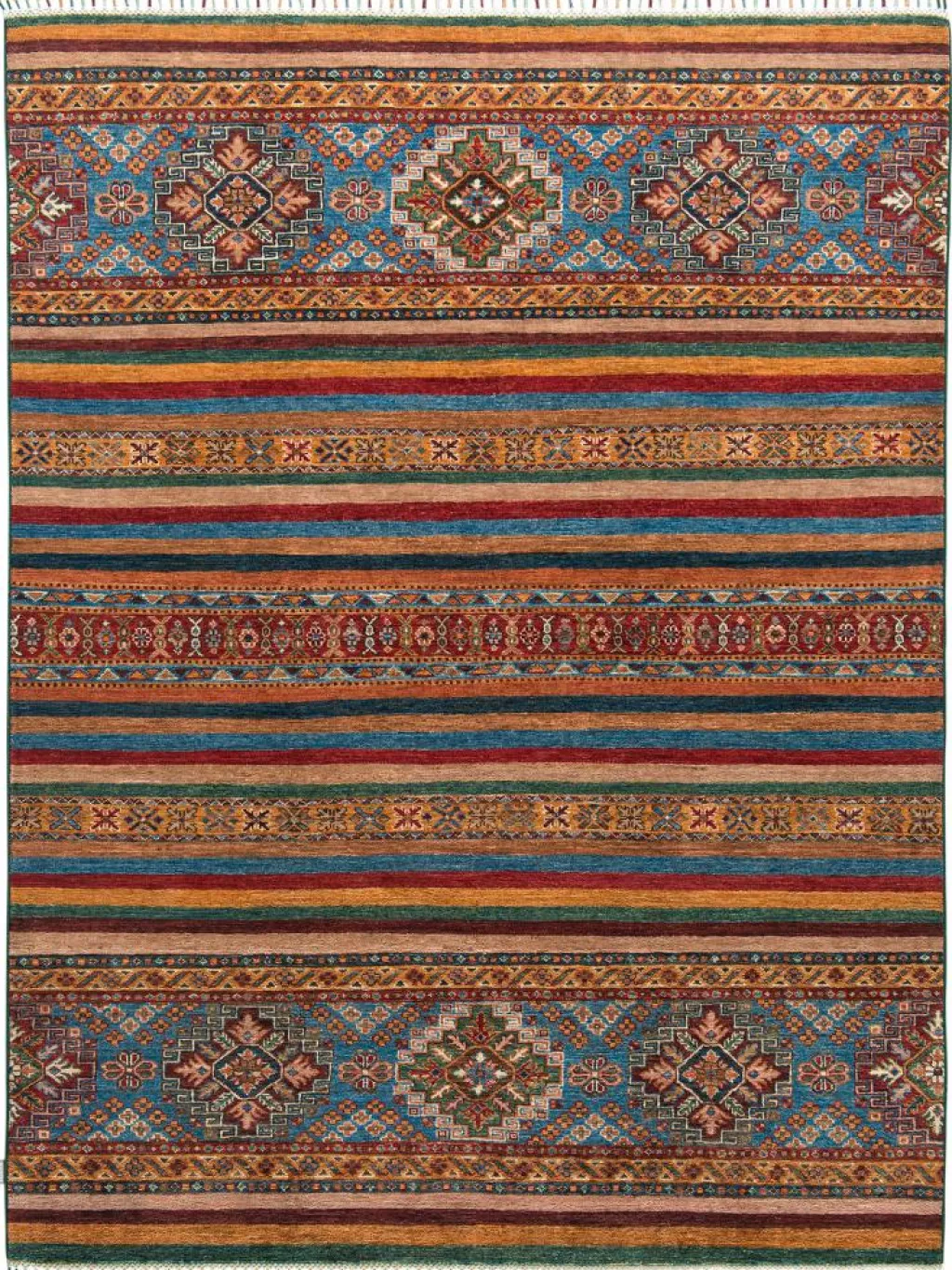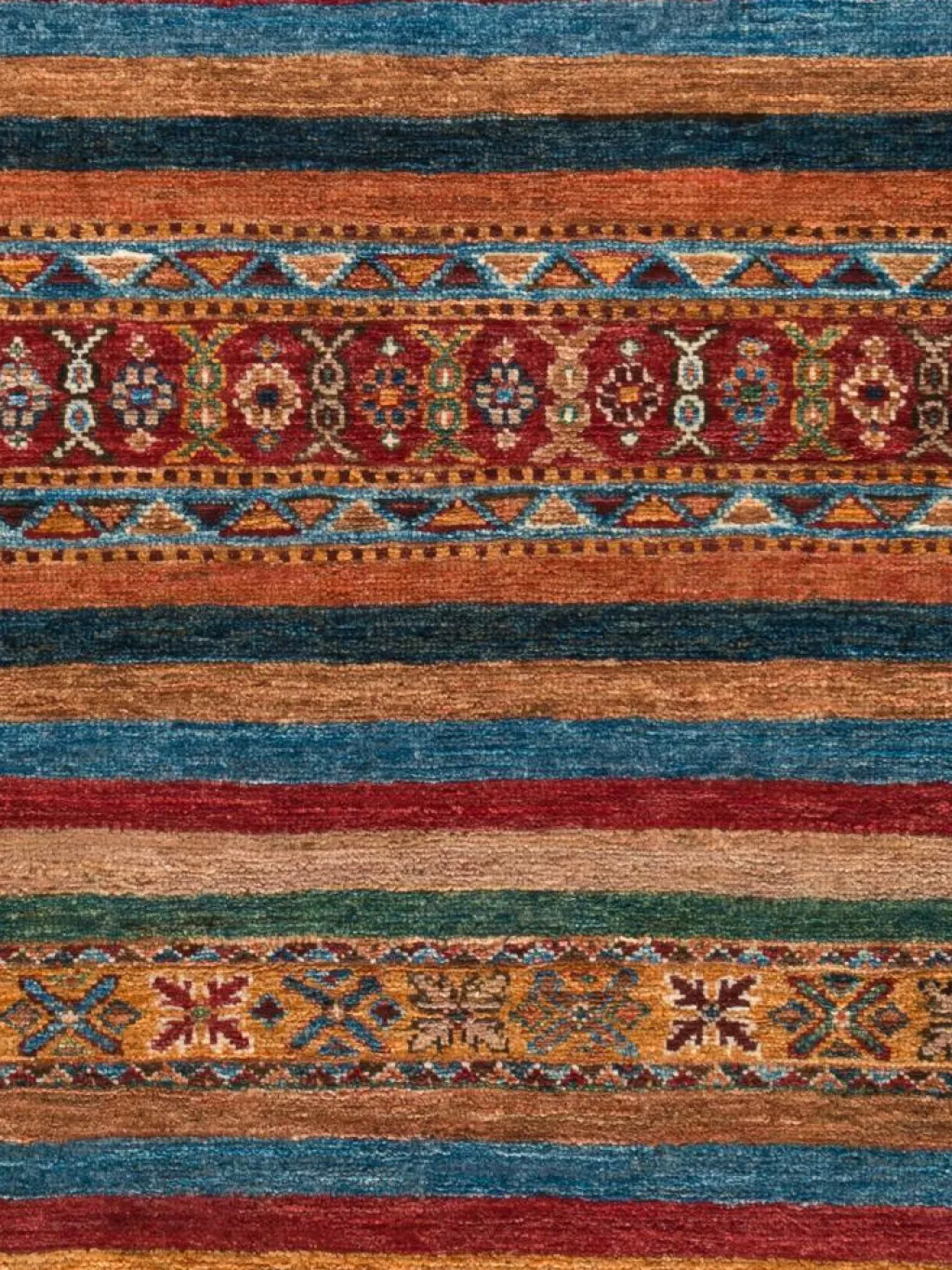 -Muster sind bunte Längsstreifen mit vielen verschiedenen Motiven gefüllt. Durch den flachen und festen Flor ist der Teppich unempfindlich gegenüber den Belastungen des Alltags.- Das Besondere an diesemOrientteppich