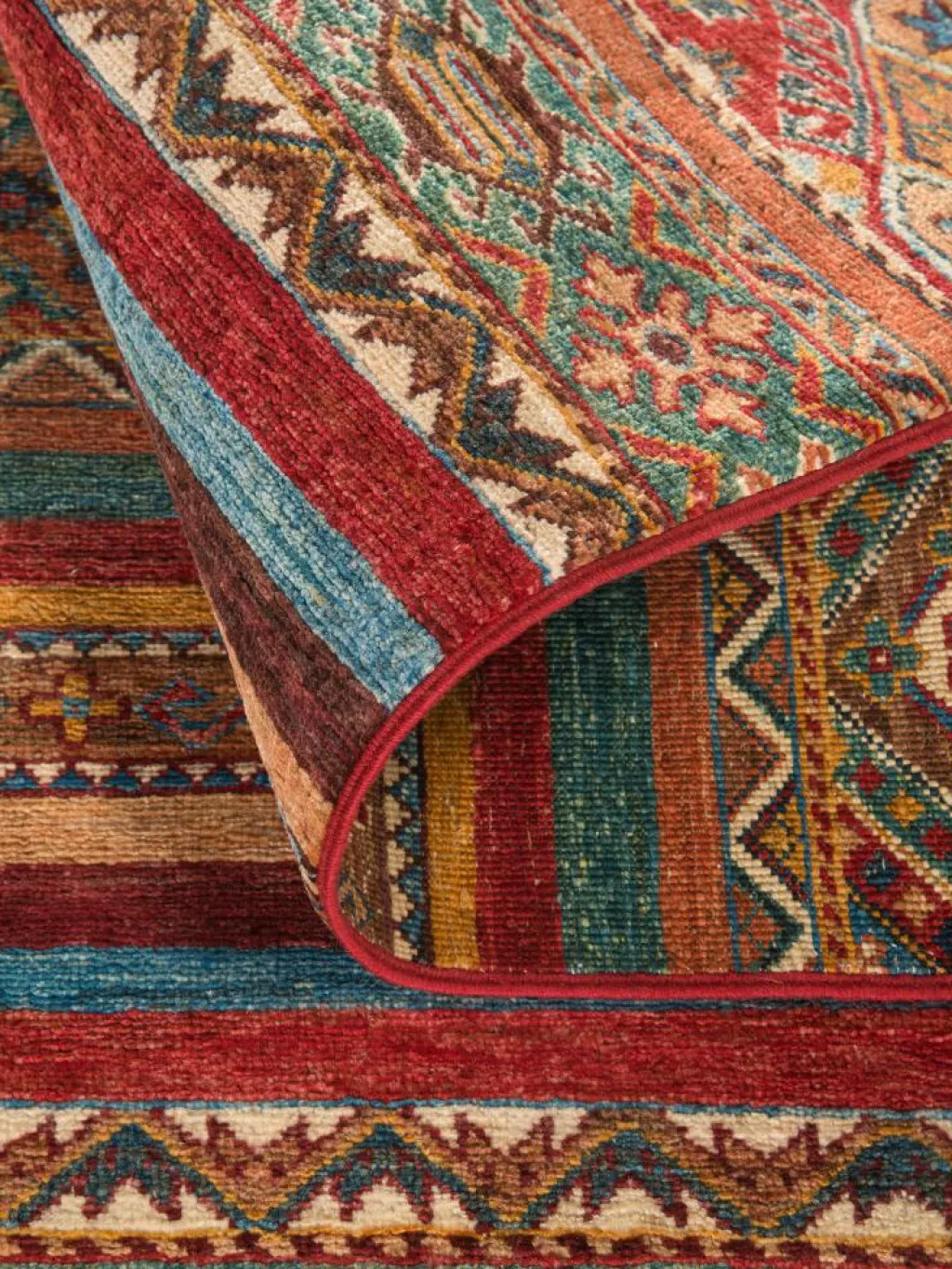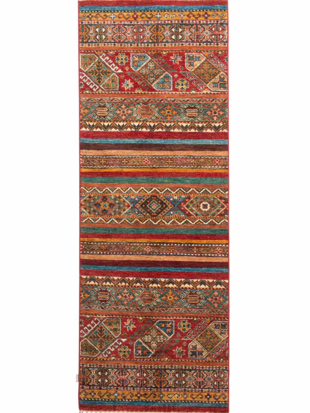 -Muster sind bunte Längsstreifen mit vielen verschiedenen Motiven gefüllt. Durch den flachen und festen Flor ist der Teppich unempfindlich gegenüber den Belastungen des Alltags.- Das Besondere an diesemOrientteppich