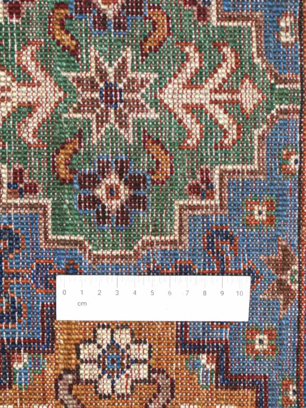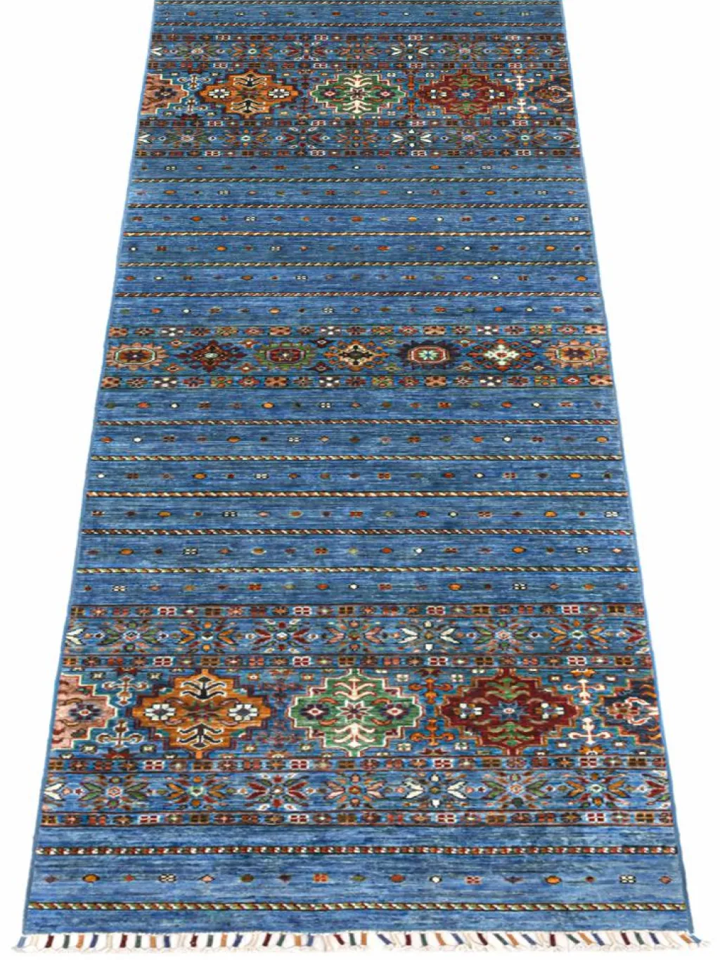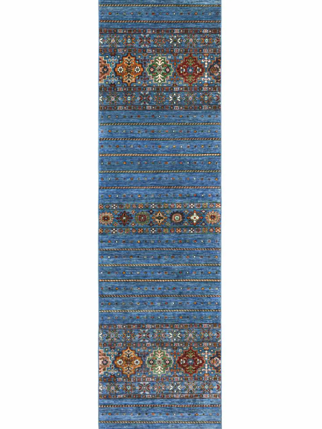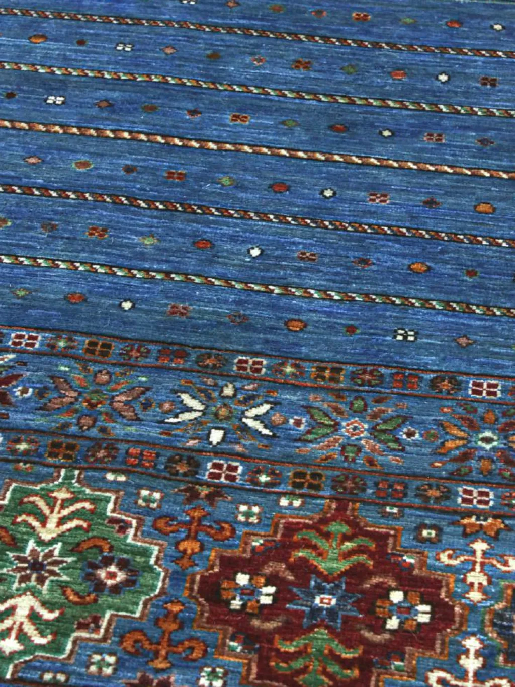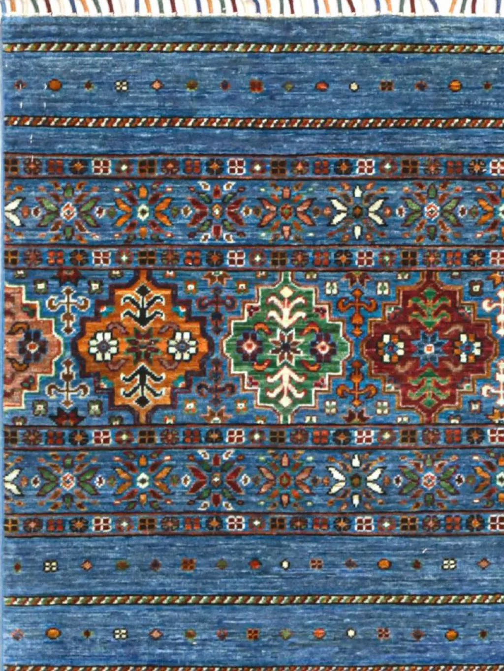-Muster sind bunte Längsstreifen mit vielen verschiedenen Motiven gefüllt. Durch den flachen und festen Flor ist der Teppich unempfindlich gegenüber den Belastungen des Alltags. – Das Besondere an diesemOrientteppich