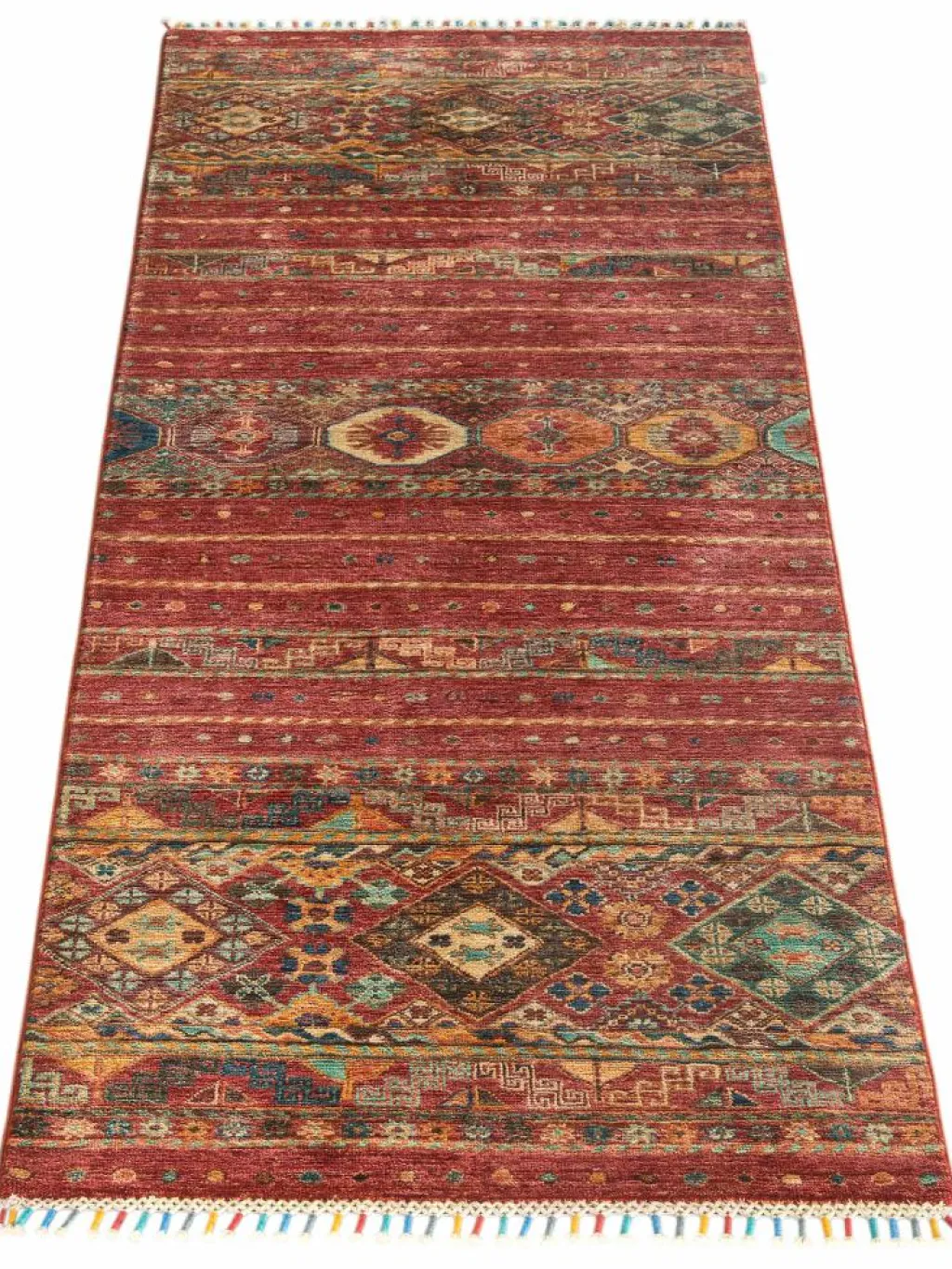 -Muster sind bunte Längsstreifen mit vielen verschiedenen Motiven gefüllt. Durch den flachen und festen Flor ist der Teppich unempfindlich gegenüber den Belastungen des Alltags.- Das Besondere an diesemOrientteppich