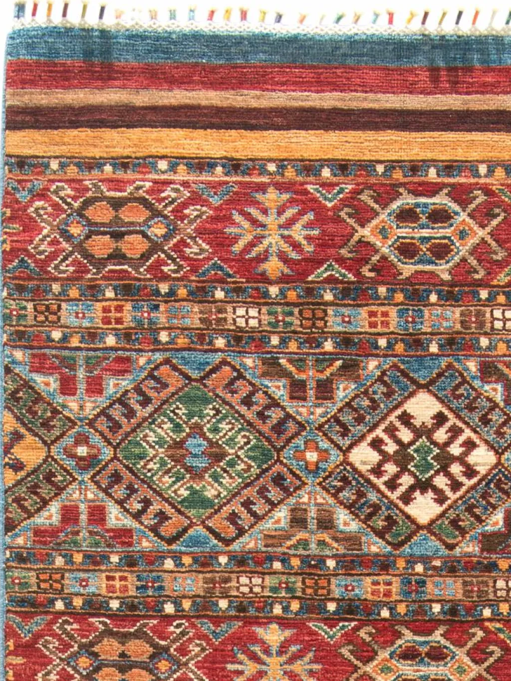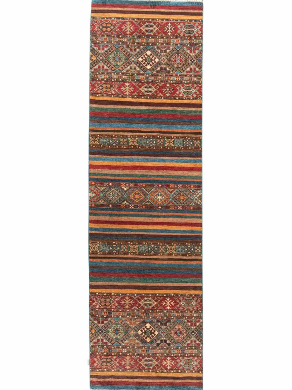 -Muster sind bunte Längsstreifen mit vielen verschiedenen Motiven gefüllt. Durch den flachen und festen Flor ist der Teppich unempfindlich gegenüber den Belastungen des Alltags.- Das Besondere an diesemOrientteppich
