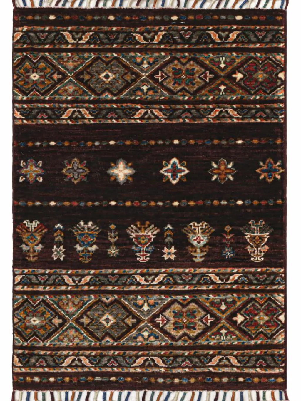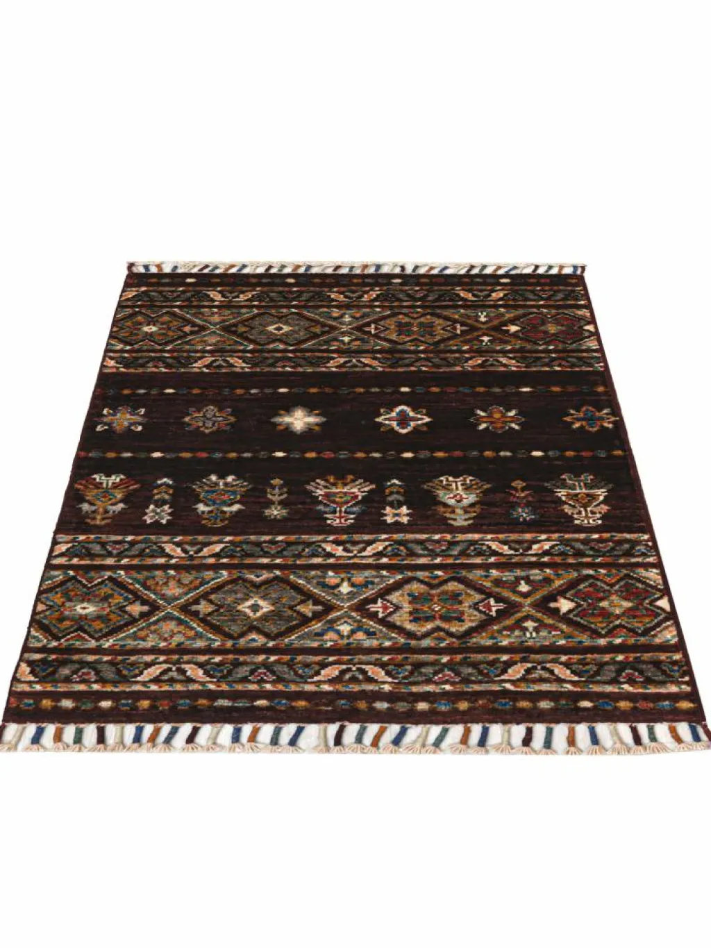 -Muster sind bunte Längsstreifen mit vielen verschiedenen Motiven gefüllt. Durch den flachen und festen Flor ist der Teppich unempfindlich gegenüber den Belastungen des Alltags. – Das Besondere an diesemOrientteppich