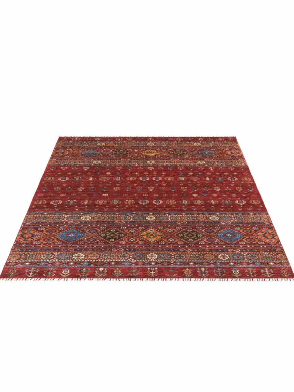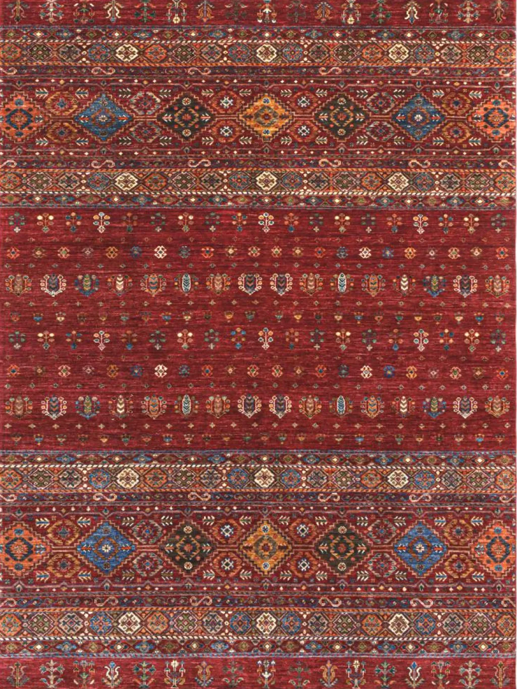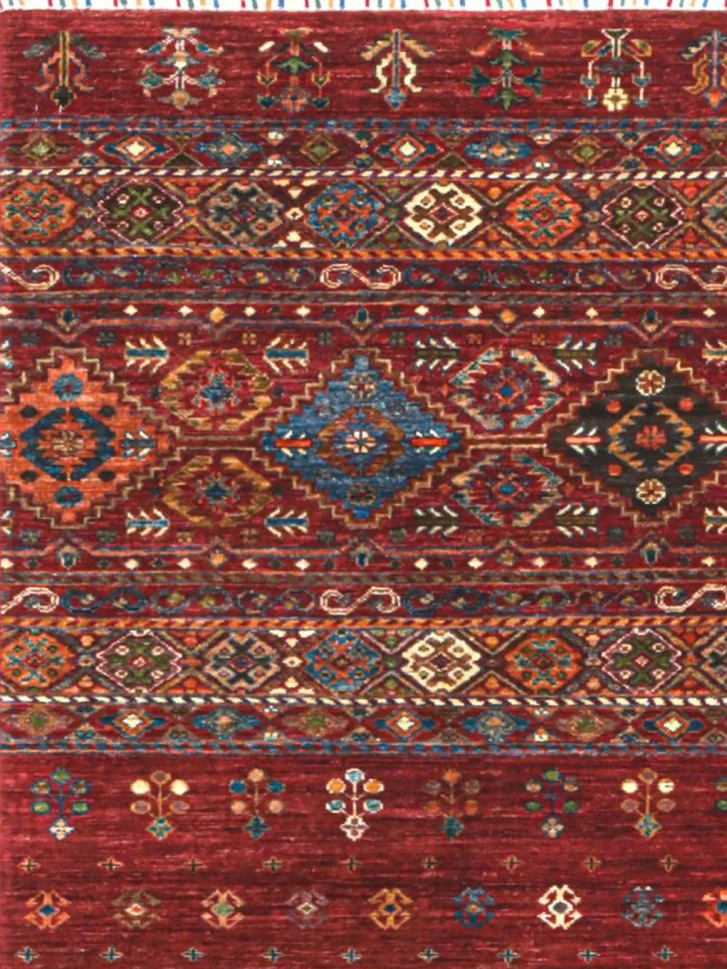 -Muster sind bunte Längsstreifen mit vielen verschiedenen Motiven gefüllt. Durch den flachen und festen Flor ist der Teppich unempfindlich gegenüber den Belastungen des Alltags. – Das Besondere an diesemOrientteppich