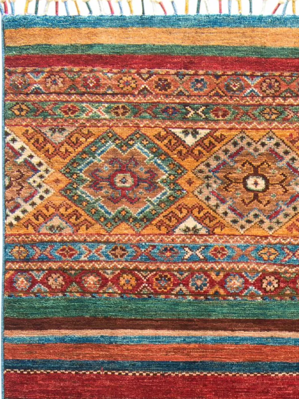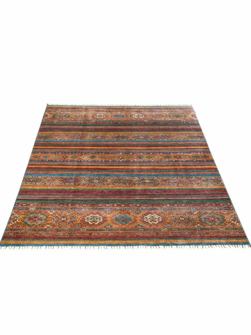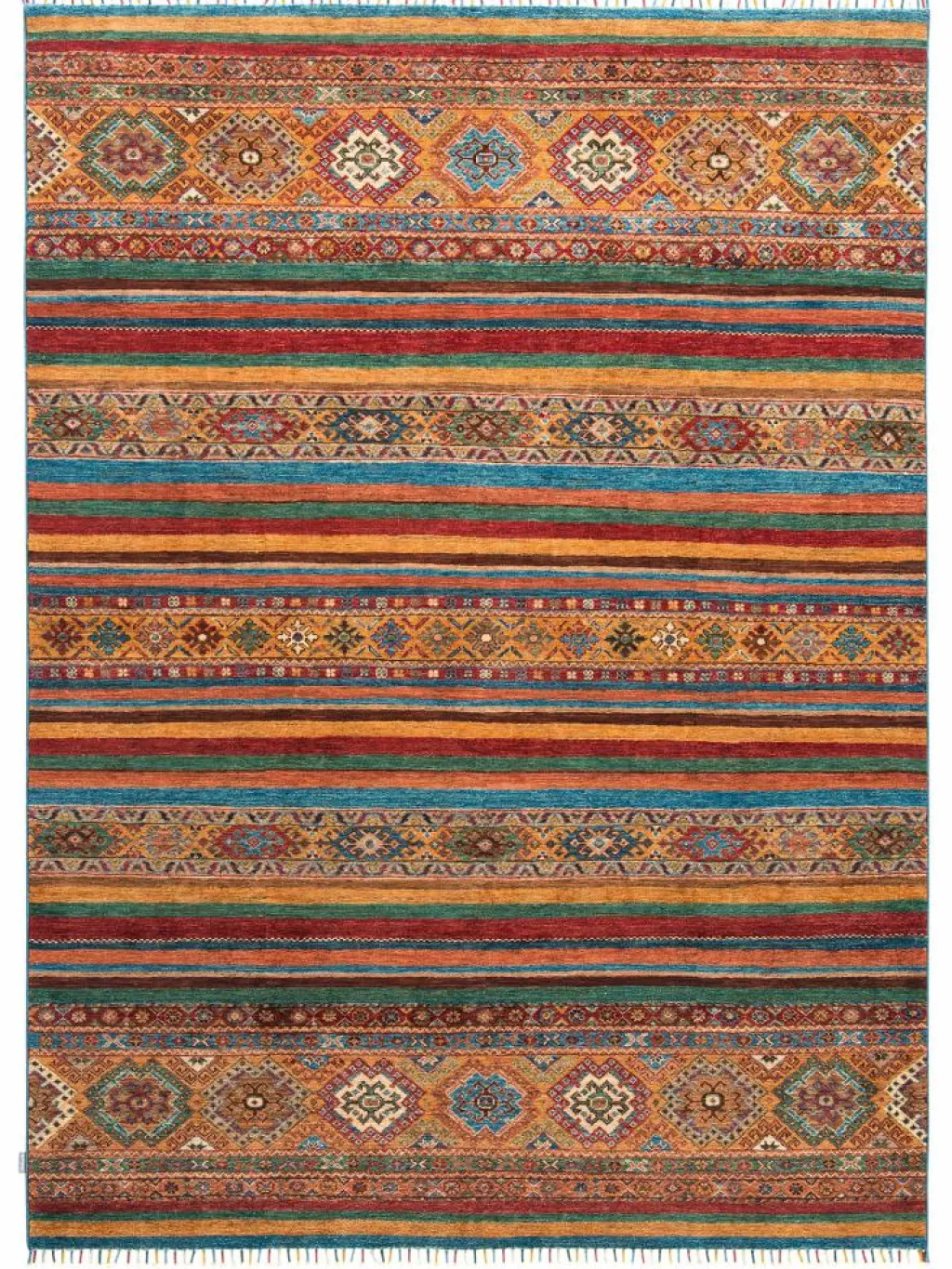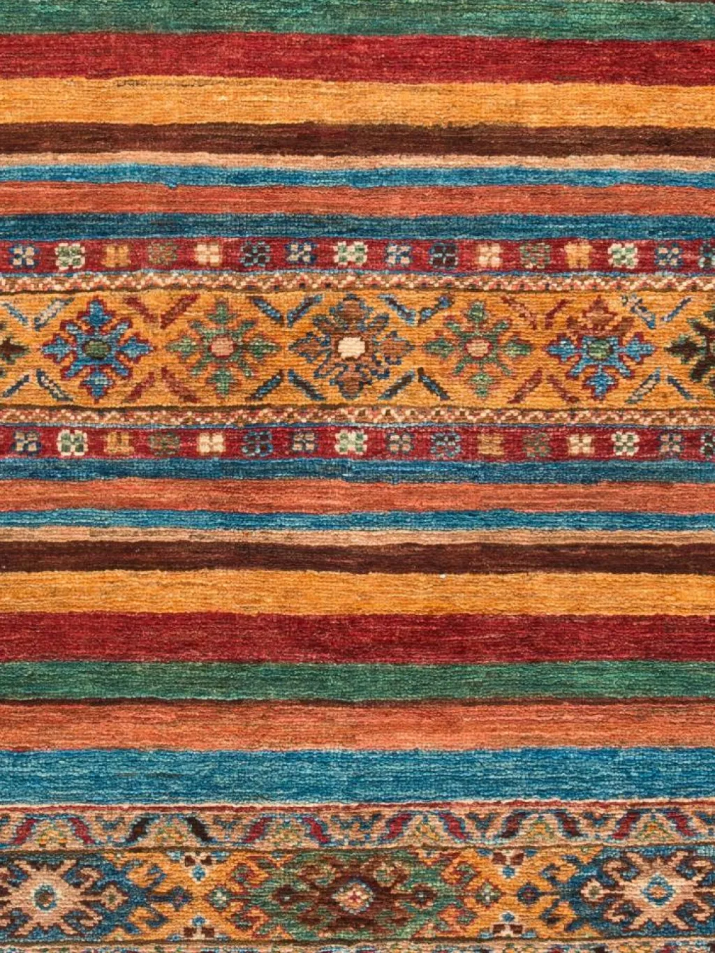-Muster sind bunte Längsstreifen mit vielen verschiedenen Motiven gefüllt. Durch den flachen und festen Flor ist der Teppich unempfindlich gegenüber den Belastungen des Alltags.- Das Besondere an diesemOrientteppich