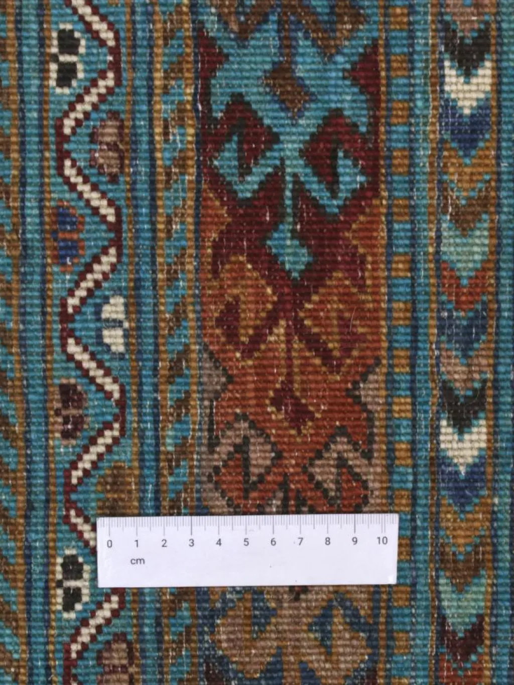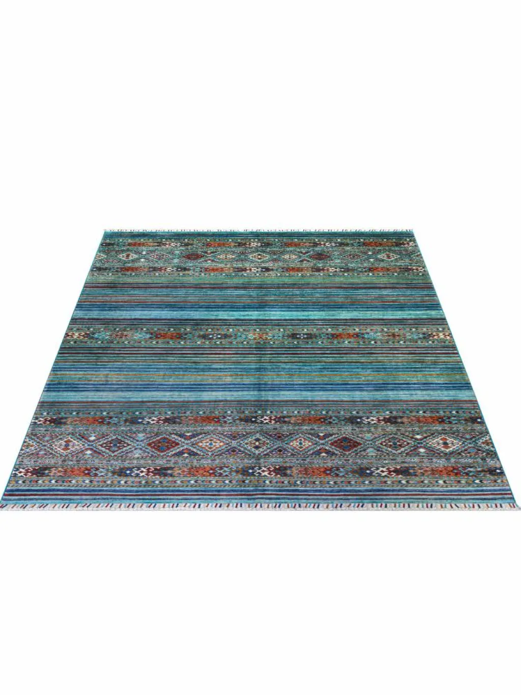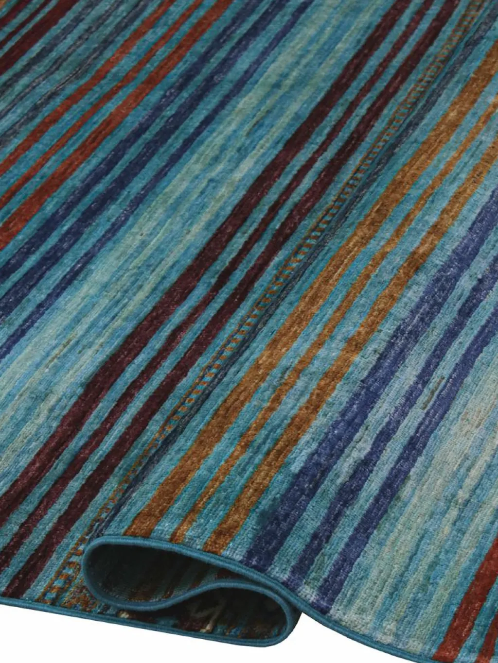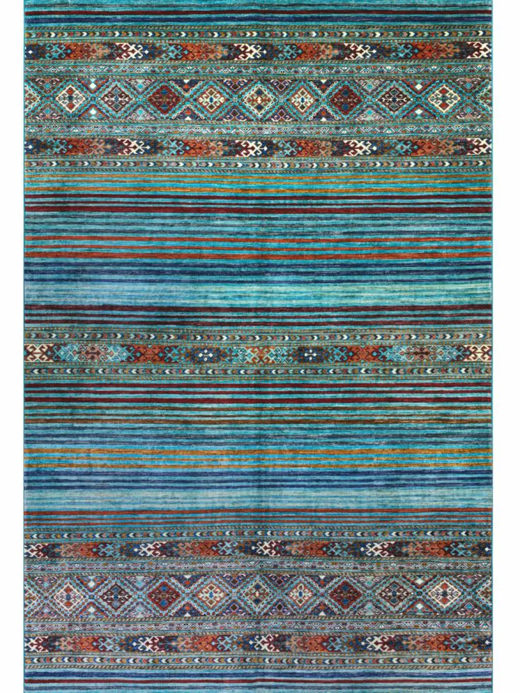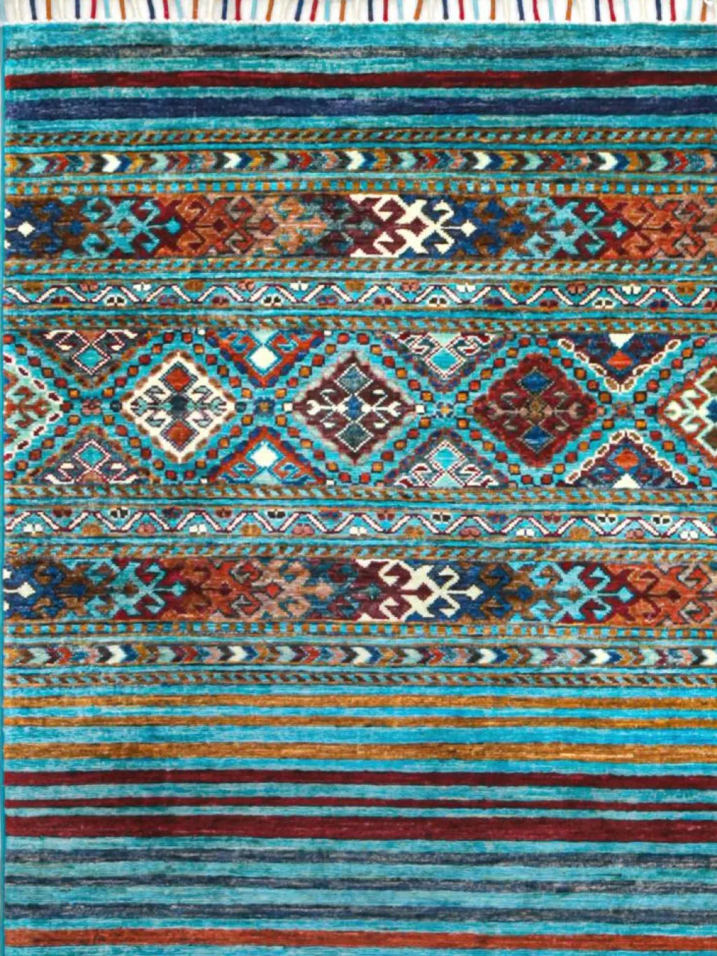 -Muster sind bunte Längsstreifen mit vielen verschiedenen Motiven gefüllt. Durch den flachen und festen Flor ist der Teppich unempfindlich gegenüber den Belastungen des Alltags. – Das Besondere an diesemOrientteppich