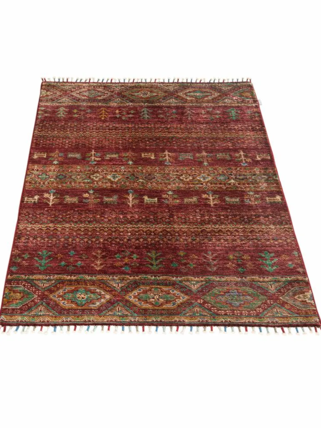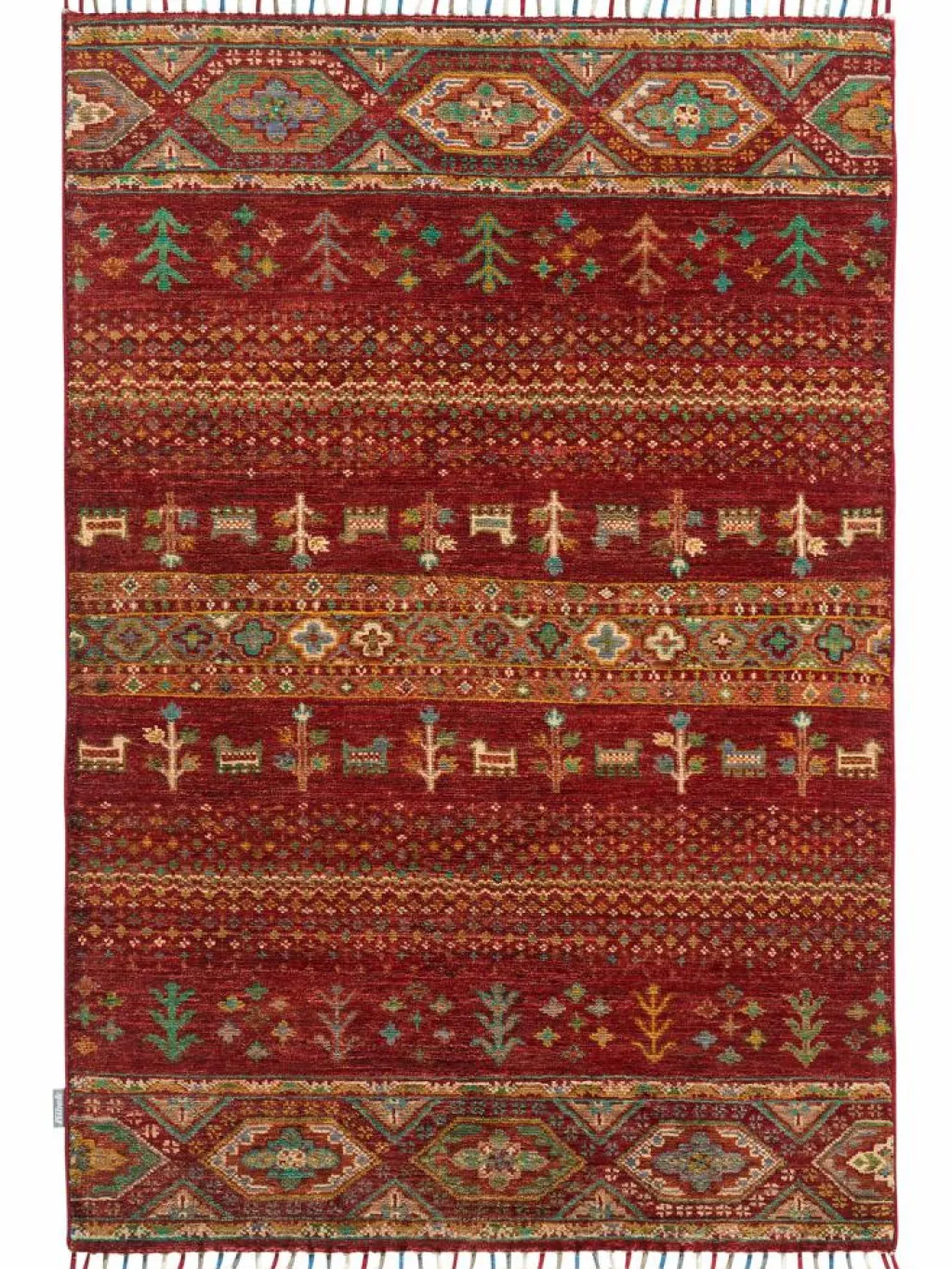 -Muster sind bunte Längsstreifen mit vielen verschiedenen Motiven gefüllt. Durch den flachen und festen Flor ist der Teppich unempfindlich gegenüber den Belastungen des Alltags.- DieserOrientteppich