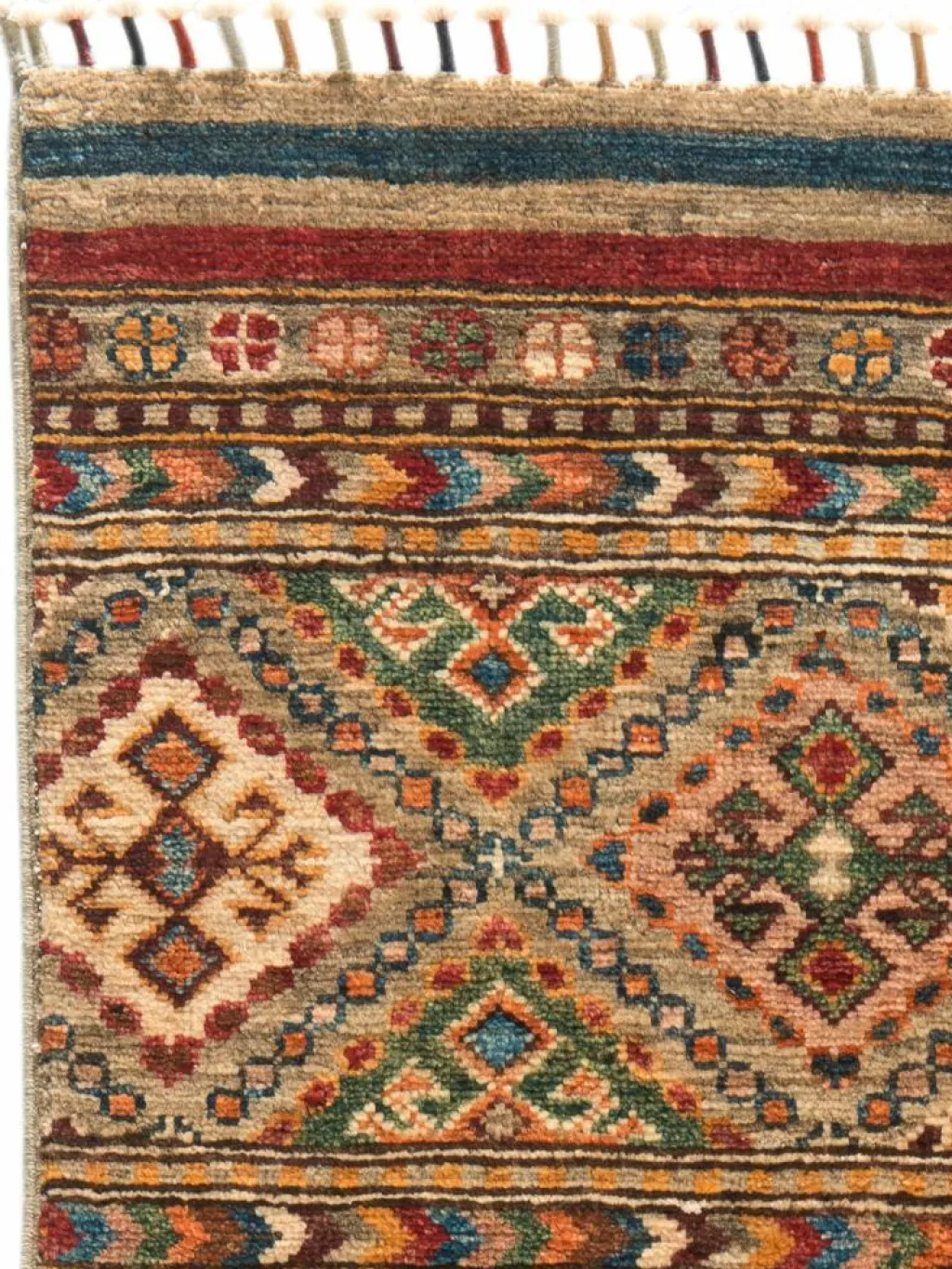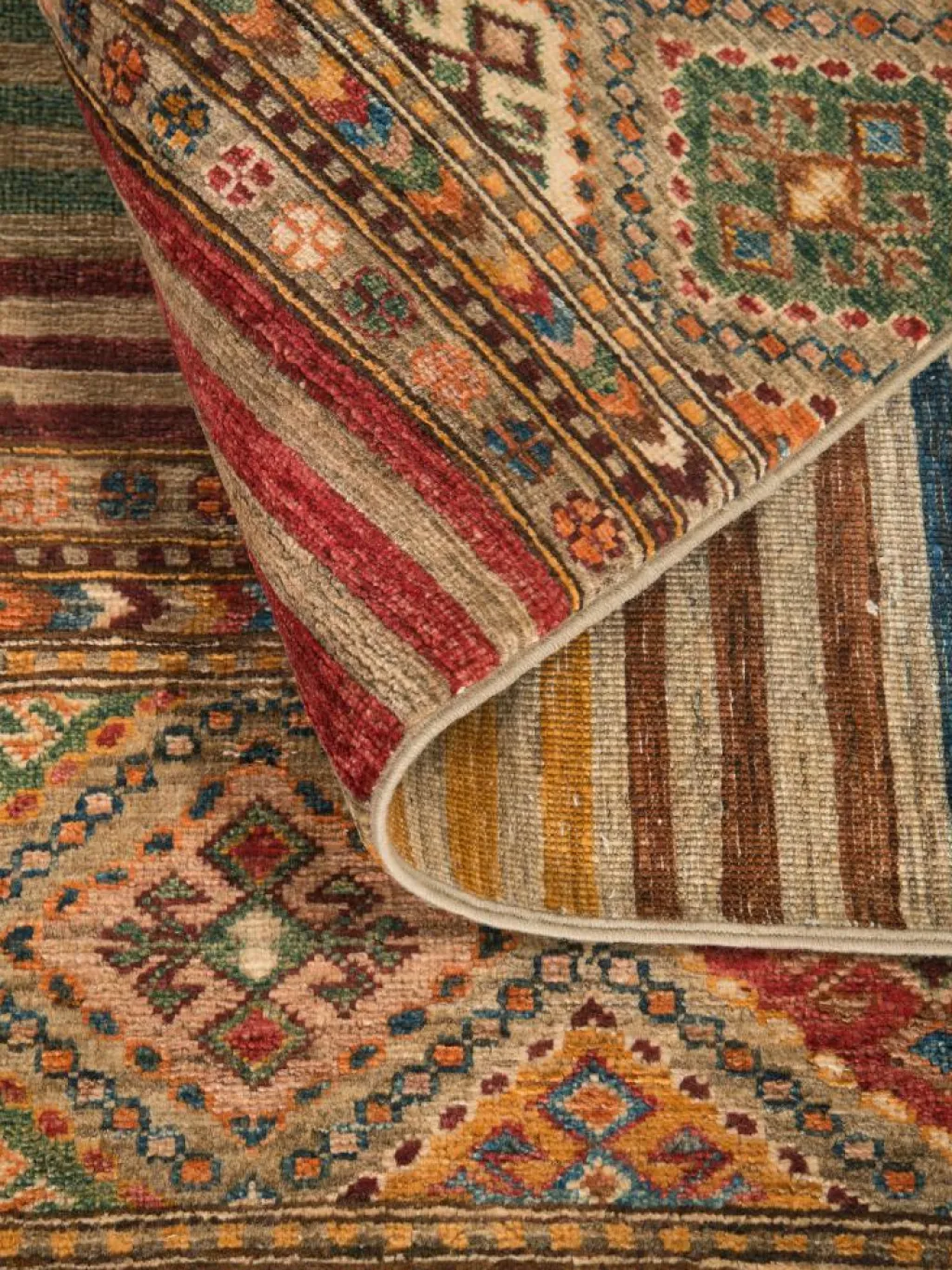 -Muster sind bunte Längsstreifen mit vielen verschiedenen Motiven gefüllt. Durch den flachen und festen Flor ist der Teppich unempfindlich gegenüber den Belastungen des Alltags.- Das Besondere an diesemOrientteppich