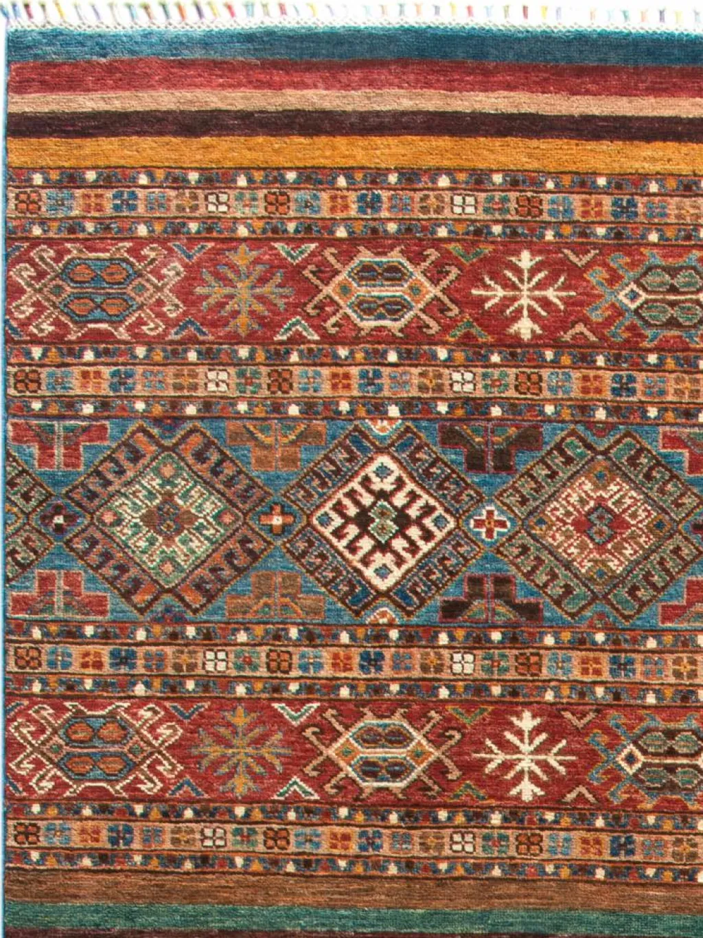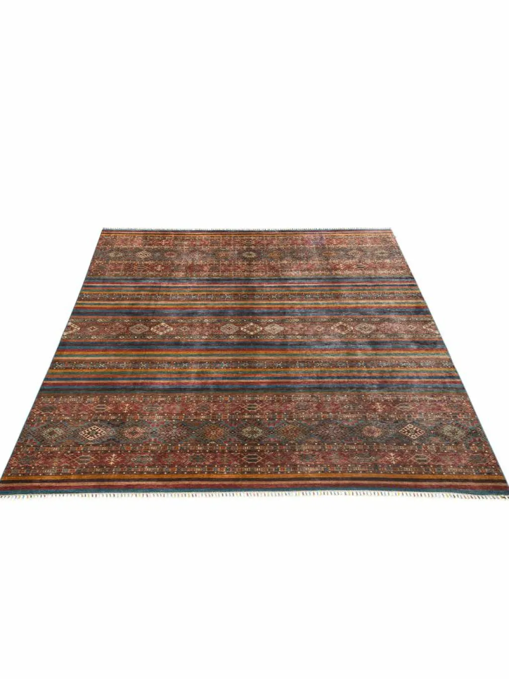 -Muster sind bunte Längsstreifen mit vielen verschiedenen Motiven gefüllt. Durch den flachen und festen Flor ist der Teppich unempfindlich gegenüber den Belastungen des Alltags.- Das Besondere an diesemOrientteppich