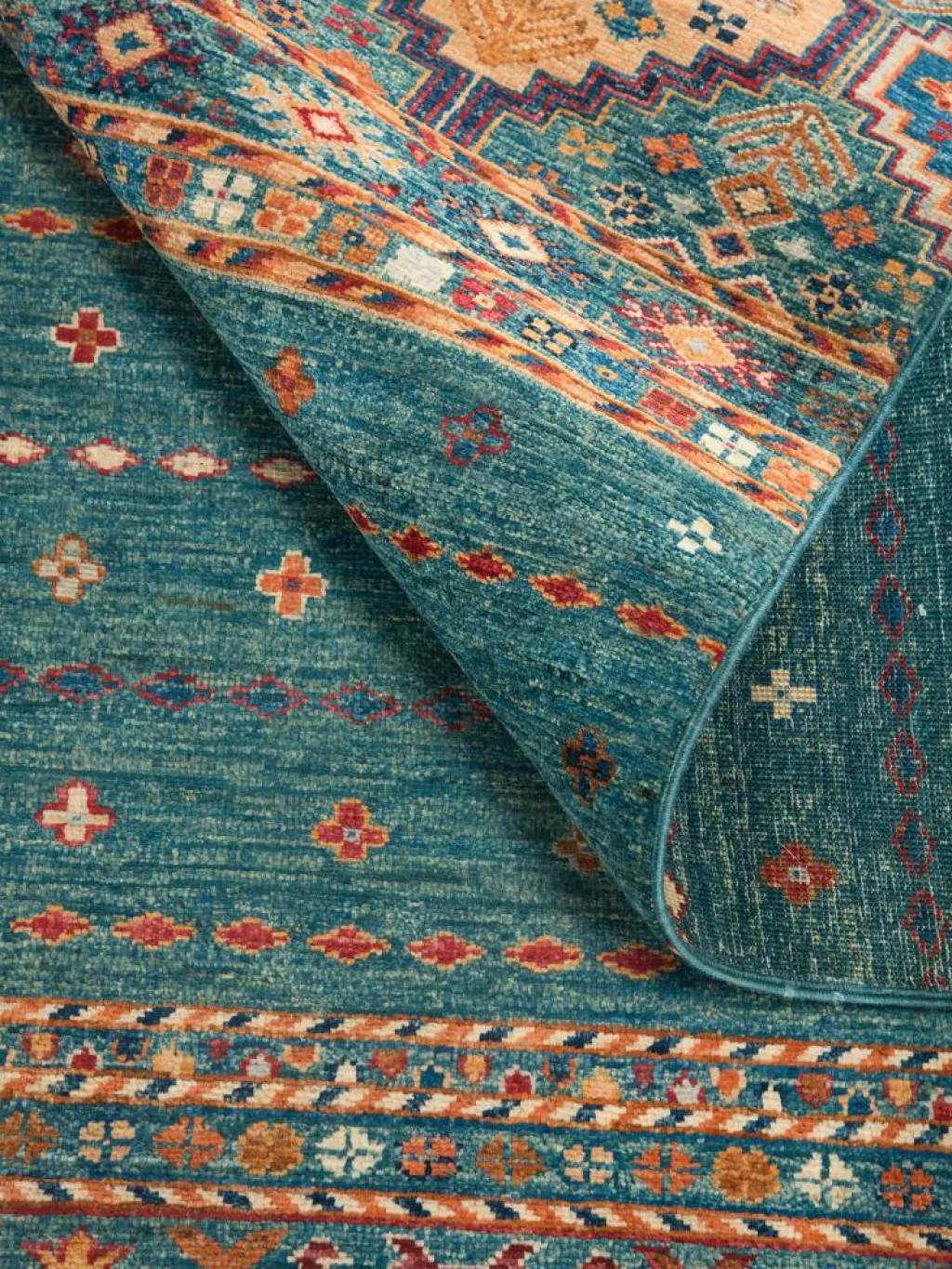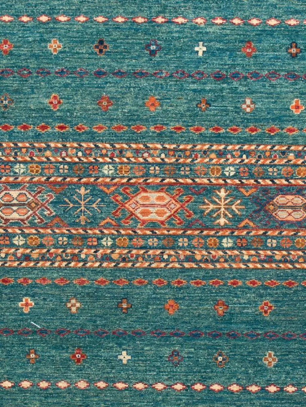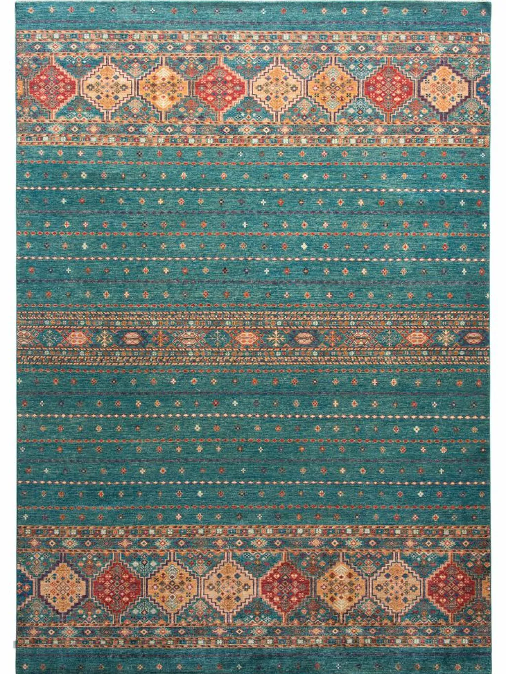-Muster sind bunte Längsstreifen mit vielen verschiedenen Motiven gefüllt. Durch den flachen und festen Flor ist der Teppich unempfindlich gegenüber den Belastungen des Alltags.- Das Besondere an diesemOrientteppich