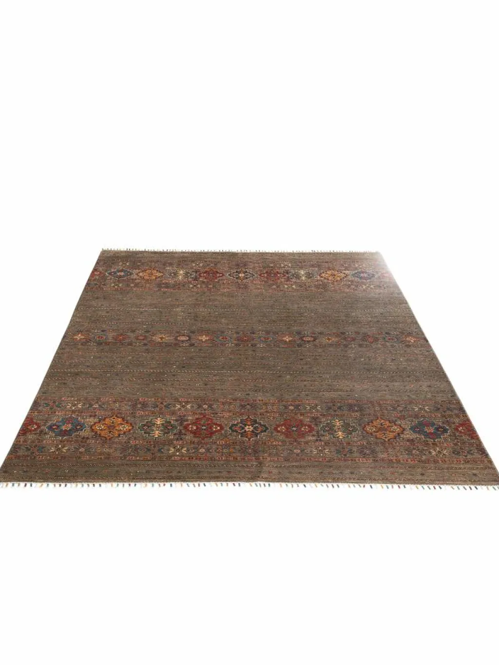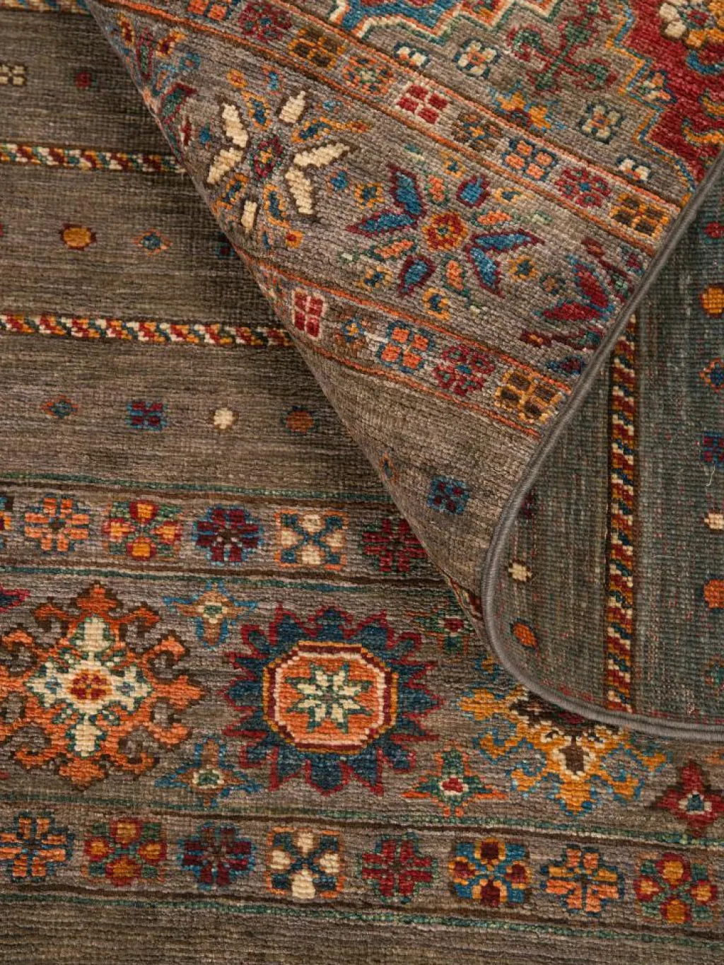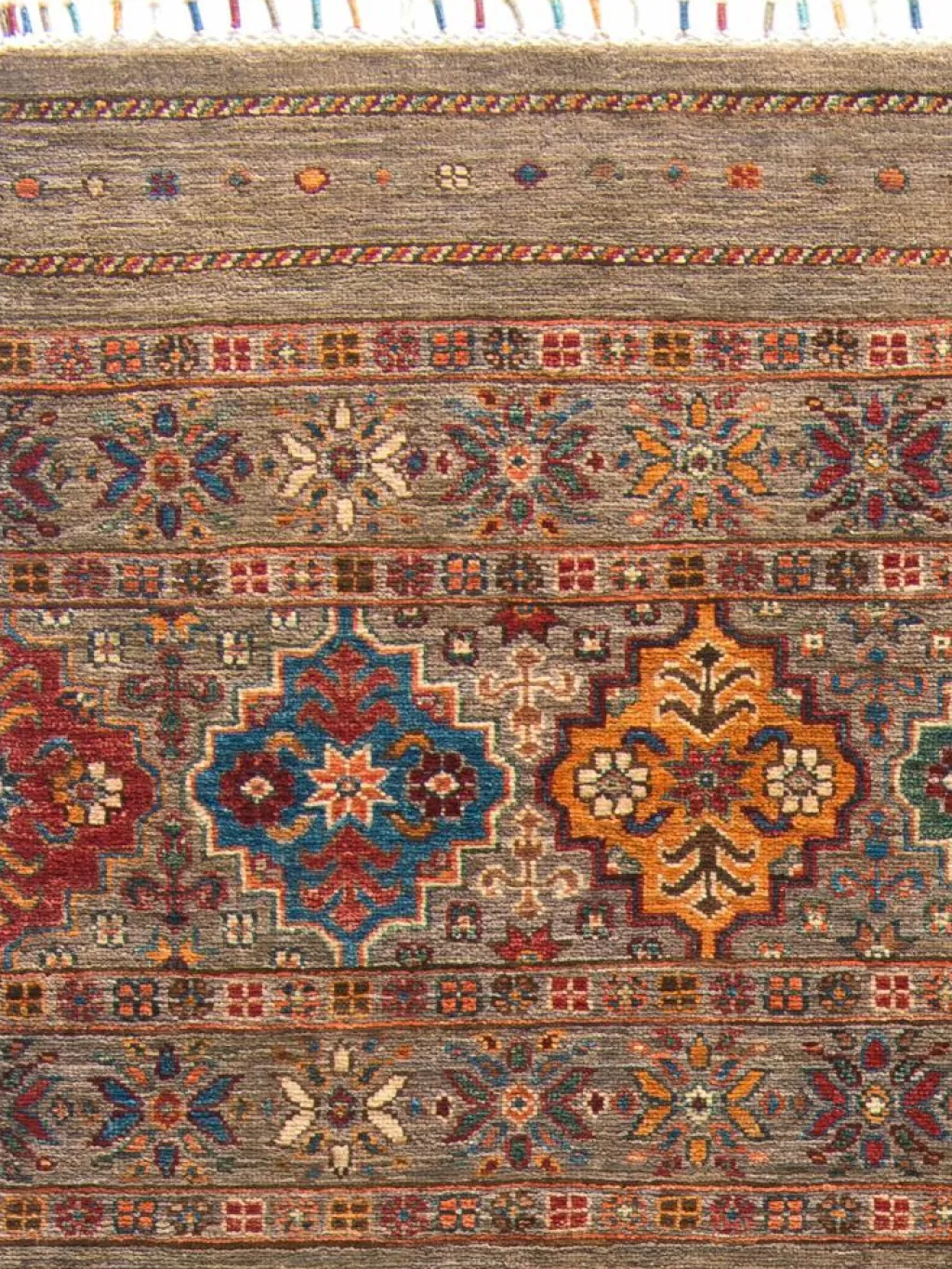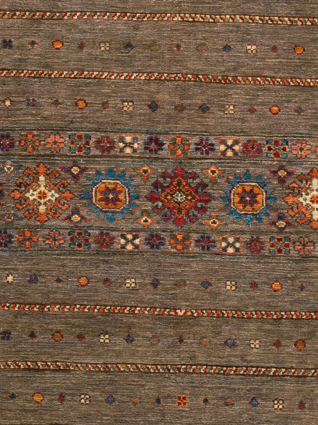 -Muster sind bunte Längsstreifen mit vielen verschiedenen Motiven gefüllt. Durch den flachen und festen Flor ist der Teppich unempfindlich gegenüber den Belastungen des Alltags.- Das Besondere an diesemOrientteppich