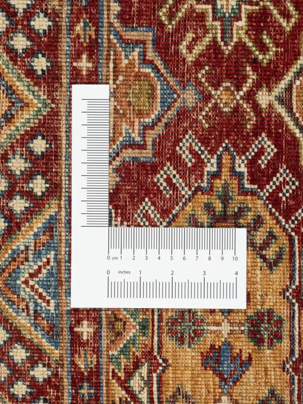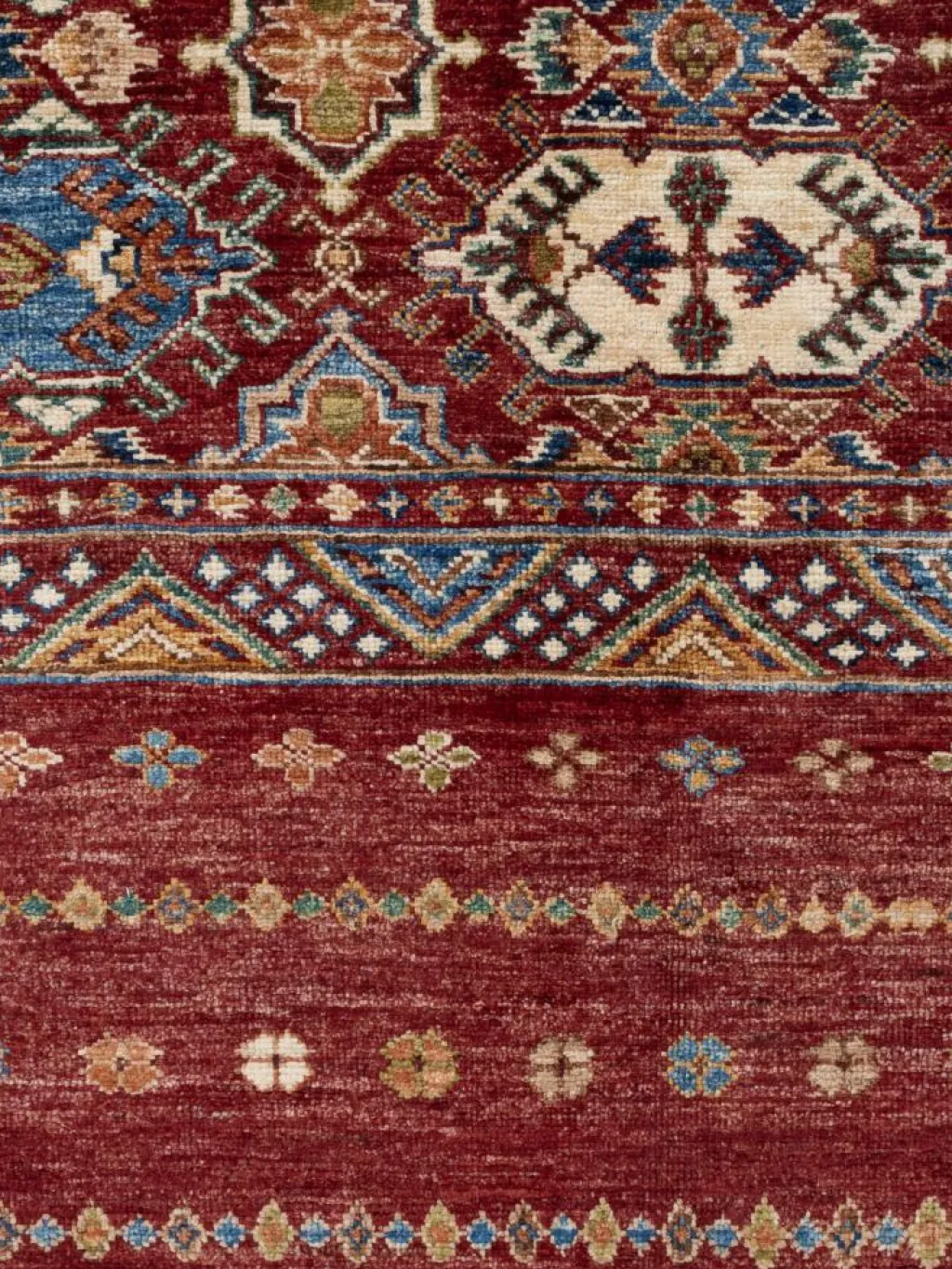 -Muster sind bunte Längsstreifen mit vielen verschiedenen Motiven gefüllt. Durch den flachen und festen Flor ist der Teppich unempfindlich gegenüber den Belastungen des Alltags. – Das Besondere an diesemOrientteppich