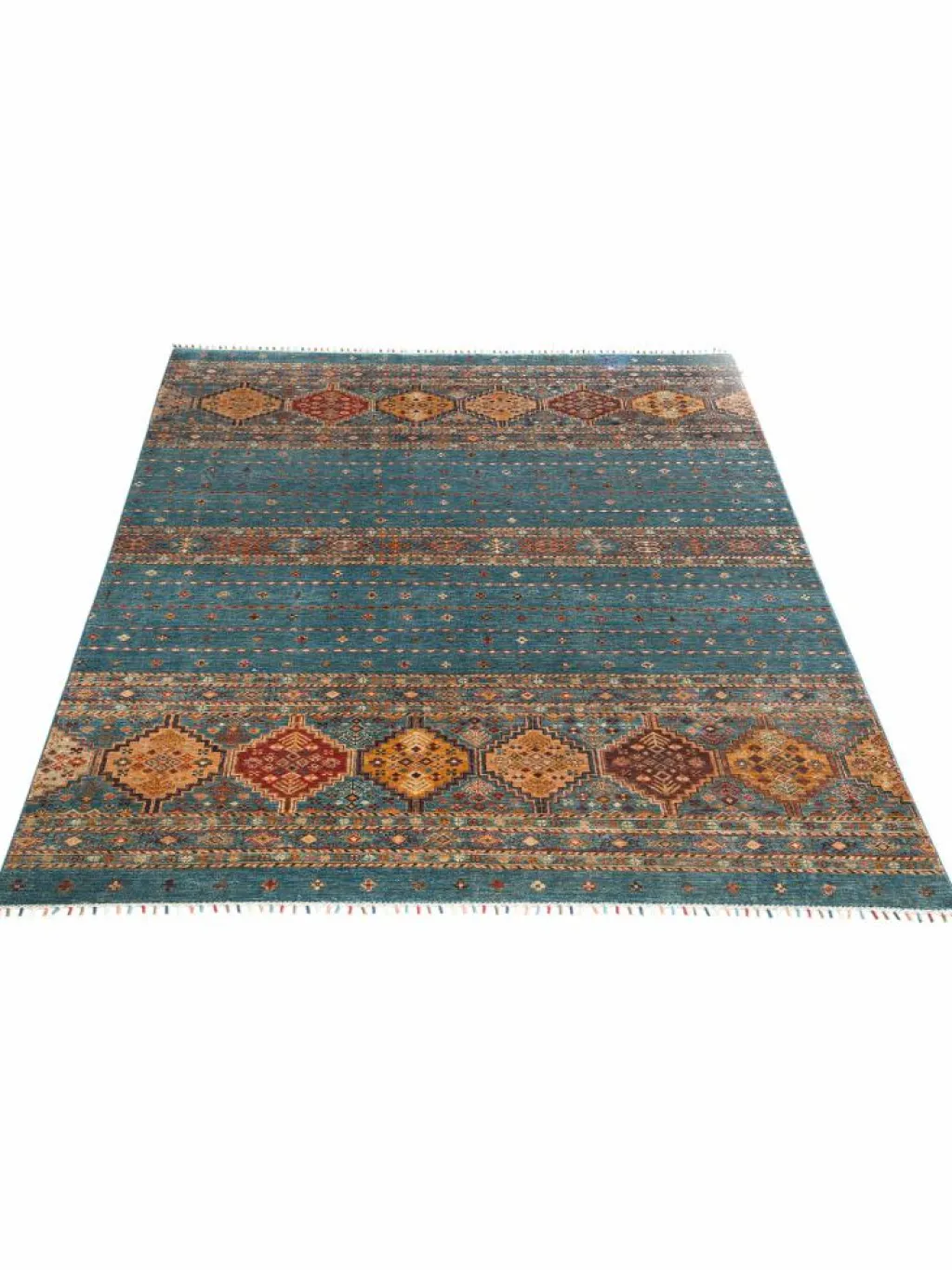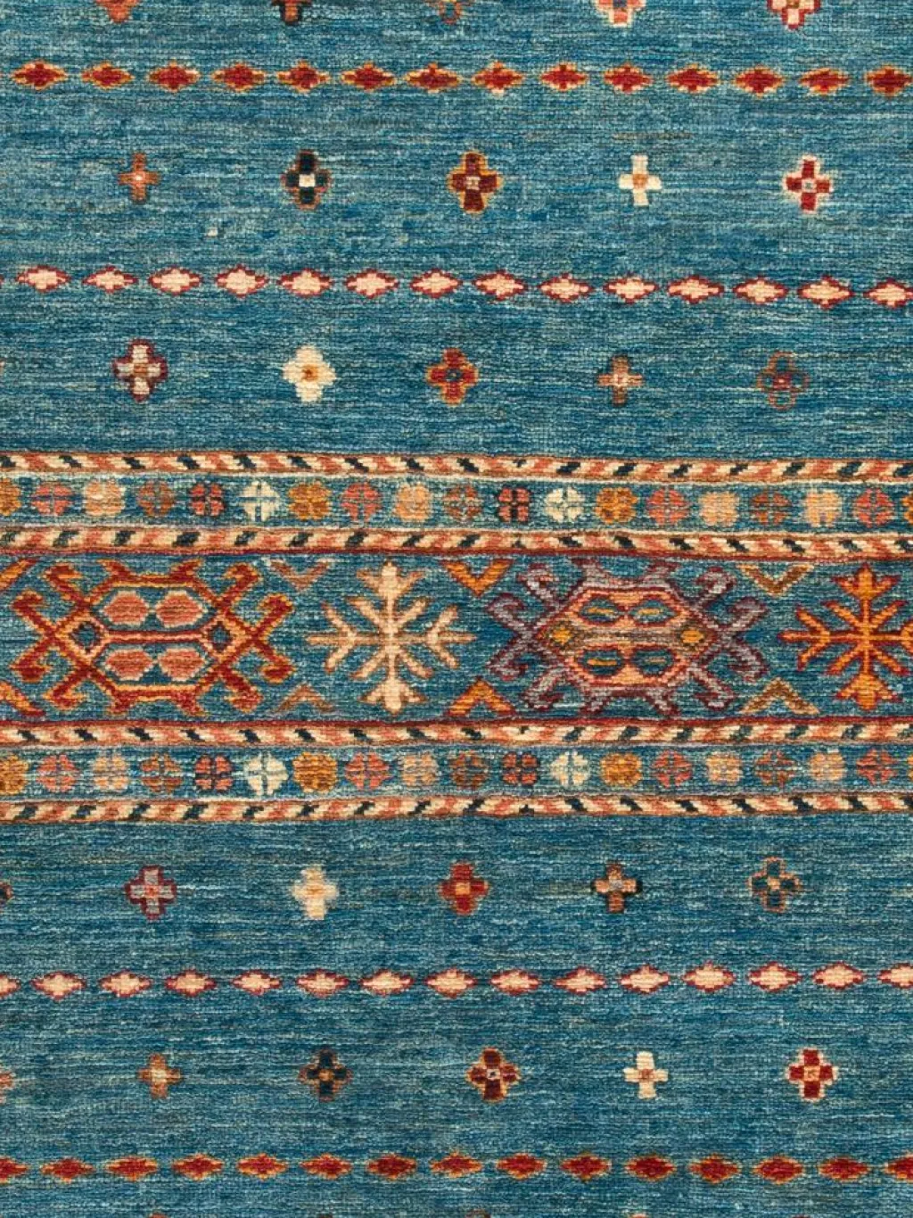 -Muster sind bunte Längsstreifen mit vielen verschiedenen Motiven gefüllt. Durch den flachen und festen Flor ist der Teppich unempfindlich gegenüber den Belastungen des Alltags.- Das Besondere an diesemOrientteppich