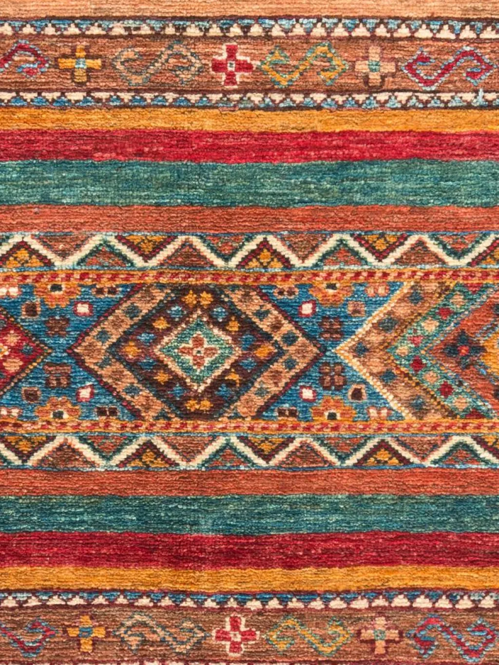 -Muster sind bunte Längsstreifen mit vielen verschiedenen Motiven gefüllt. Durch den flachen und festen Flor ist der Teppich unempfindlich gegenüber den Belastungen des Alltags.- Das Besondere an diesemOrientteppich