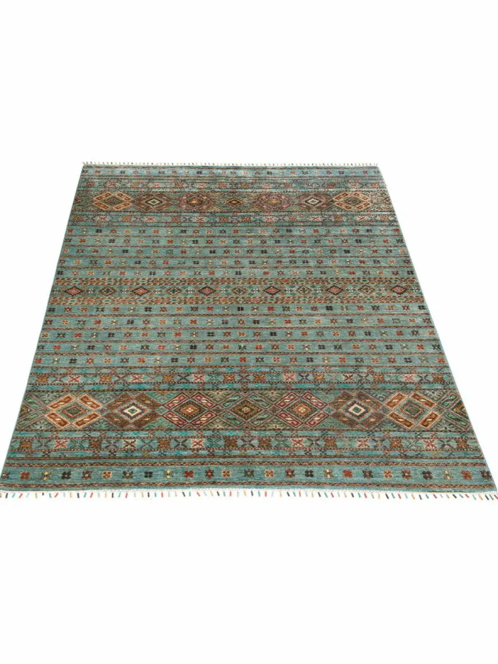 -Muster sind bunte Längsstreifen mit vielen verschiedenen Motiven gefüllt. Durch den flachen und festen Flor ist der Teppich unempfindlich gegenüber den Belastungen des Alltags.- Das Besondere an diesemOrientteppich