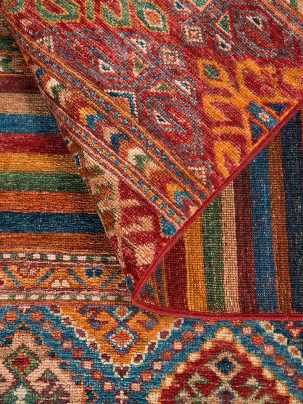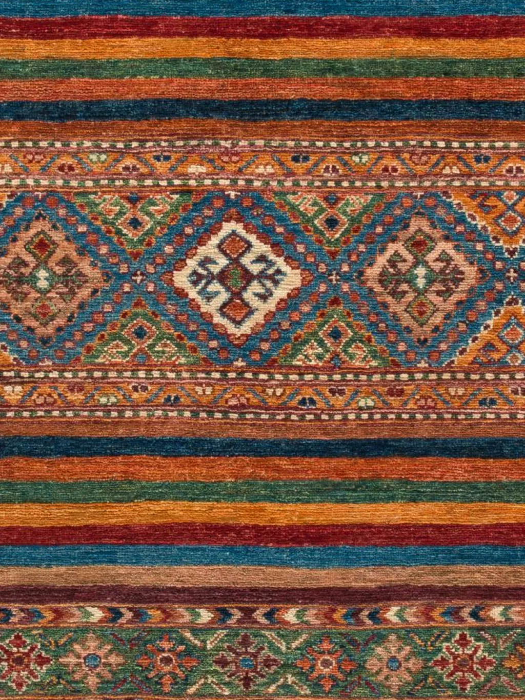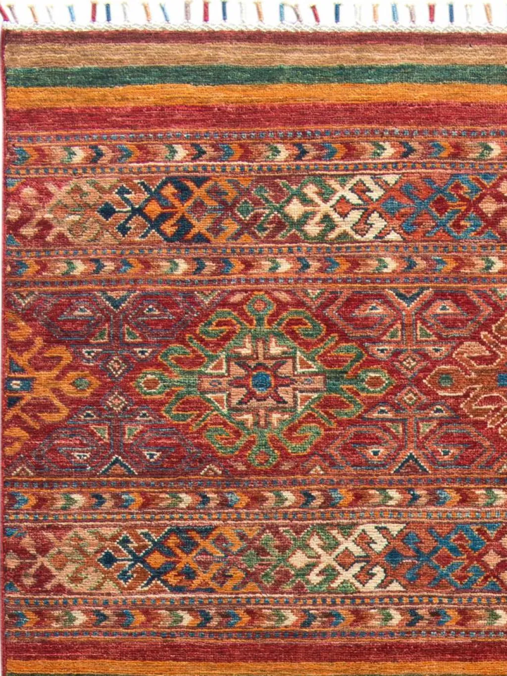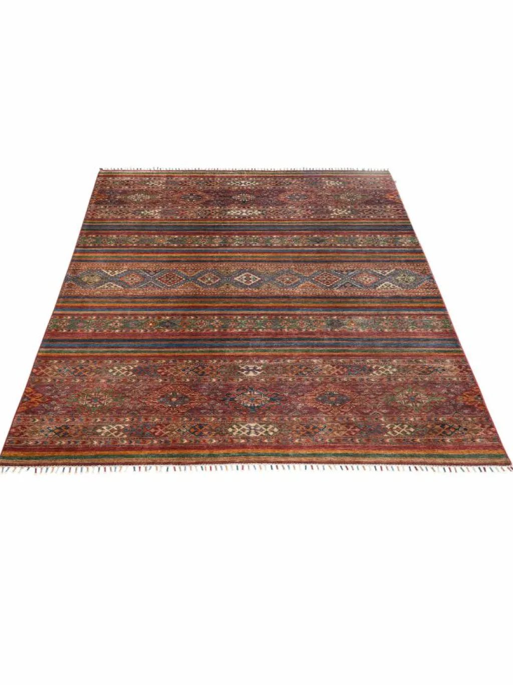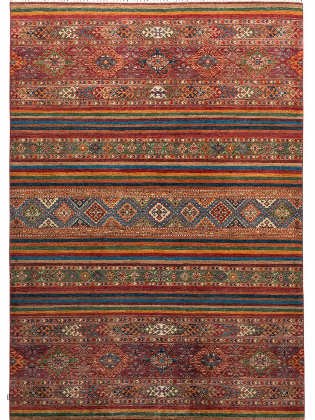-Muster sind bunte Längsstreifen mit vielen verschiedenen Motiven gefüllt. Durch den flachen und festen Flor ist der Teppich unempfindlich gegenüber den Belastungen des Alltags.- Das Besondere an diesemOrientteppich