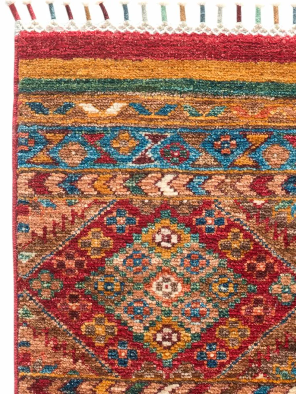 -Muster sind bunte Längsstreifen mit vielen verschiedenen Motiven gefüllt. Durch den flachen und festen Flor ist der Teppich unempfindlich gegenüber den Belastungen des Alltags.- Das Besondere an diesemOrientteppich
