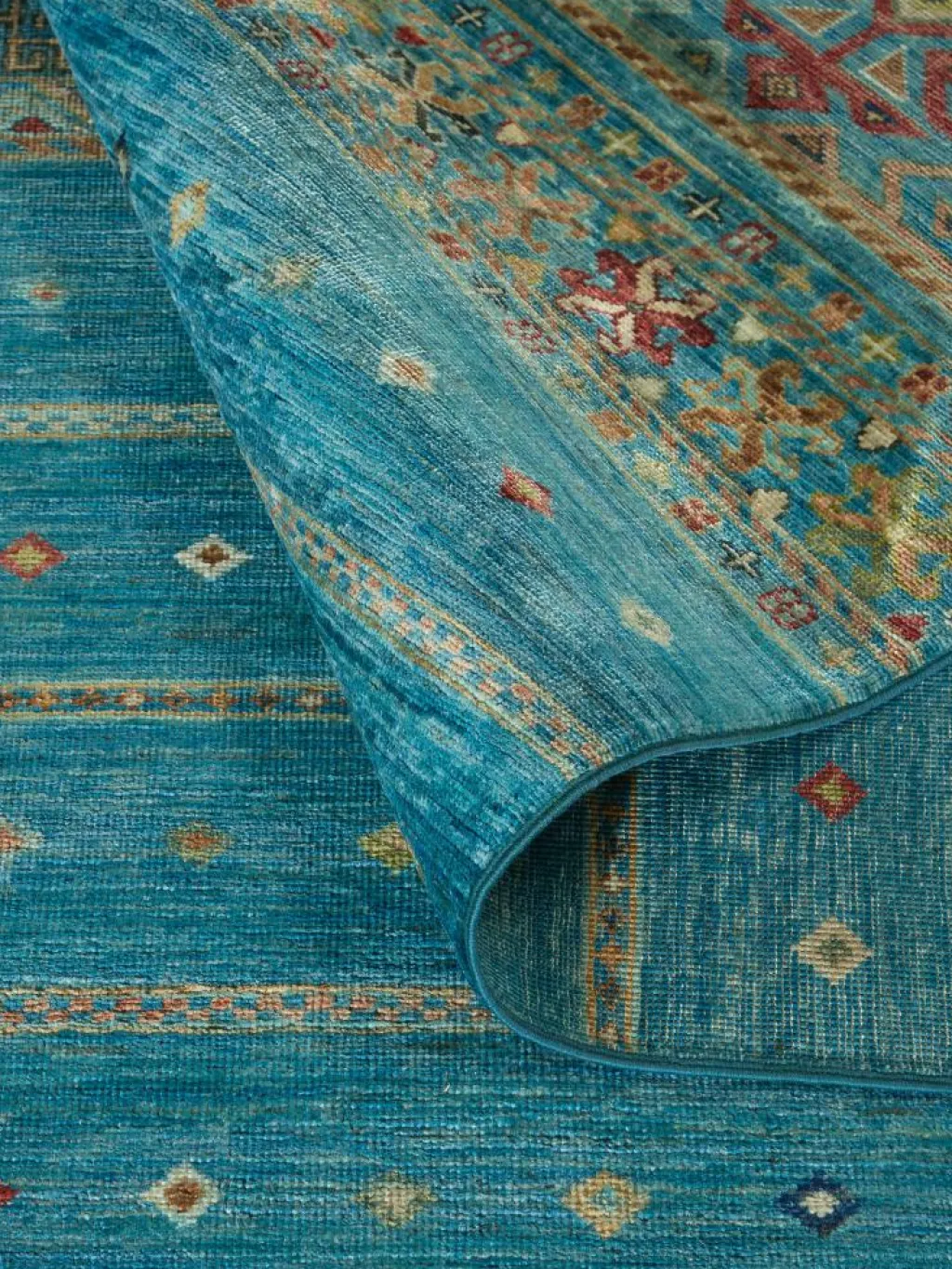 mit bunten Fäden zusammen gebunden. Durch den flachen und festen Flor ist der Teppich unempfindlich gegenüber den Belastungen des Alltags.| Gesamthöhe: | ca. 6 mm |