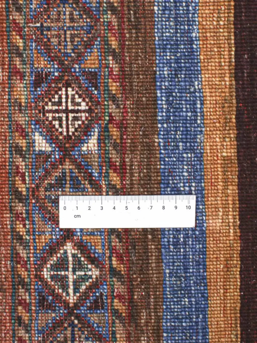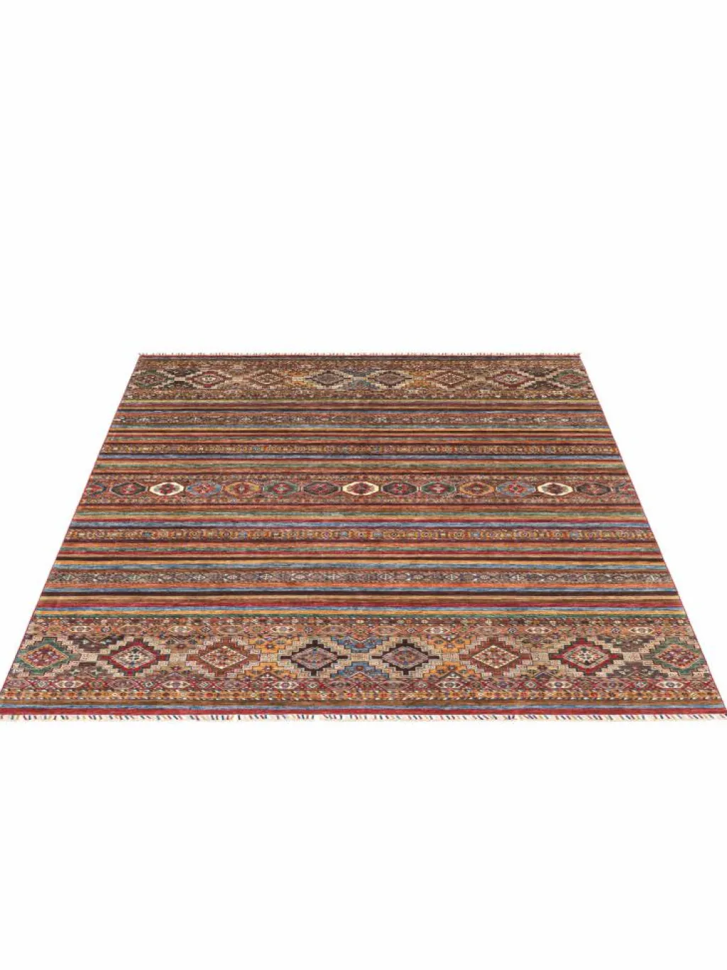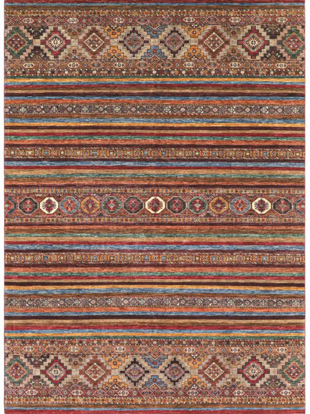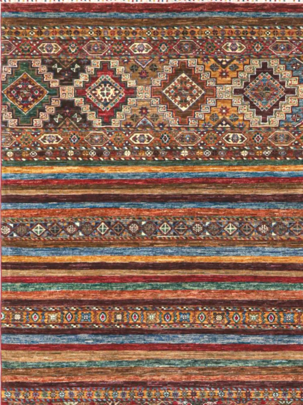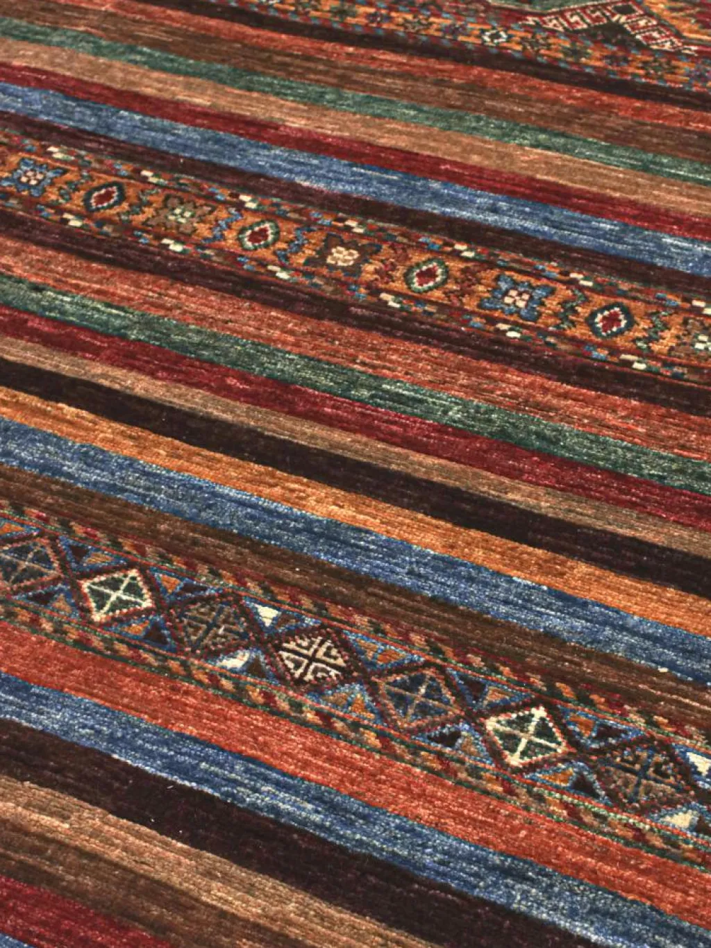 -Muster sind bunte Längsstreifen mit vielen verschiedenen Motiven gefüllt. Durch den flachen und festen Flor ist der Teppich unempfindlich gegenüber den Belastungen des Alltags. – Das Besondere an diesemOrientteppich