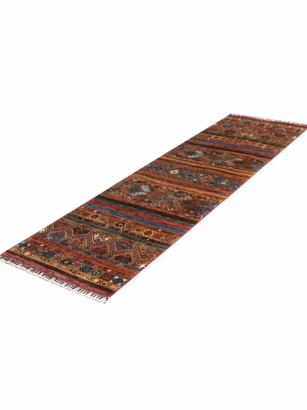 -Muster sind bunte Längsstreifen mit vielen verschiedenen Motiven gefüllt. Durch den flachen und festen Flor ist der Teppich unempfindlich gegenüber den Belastungen des Alltags. – Das Besondere an diesemOrientteppich