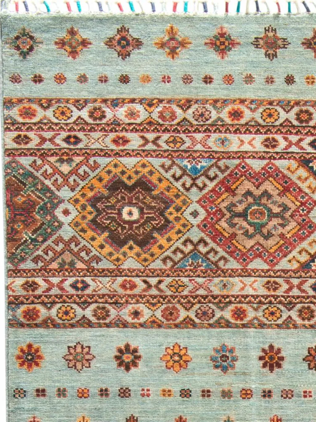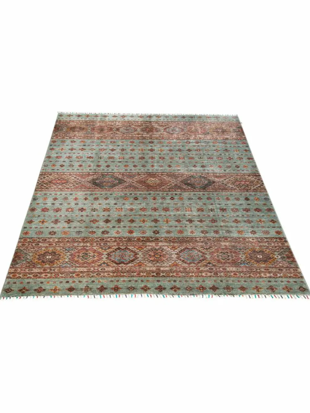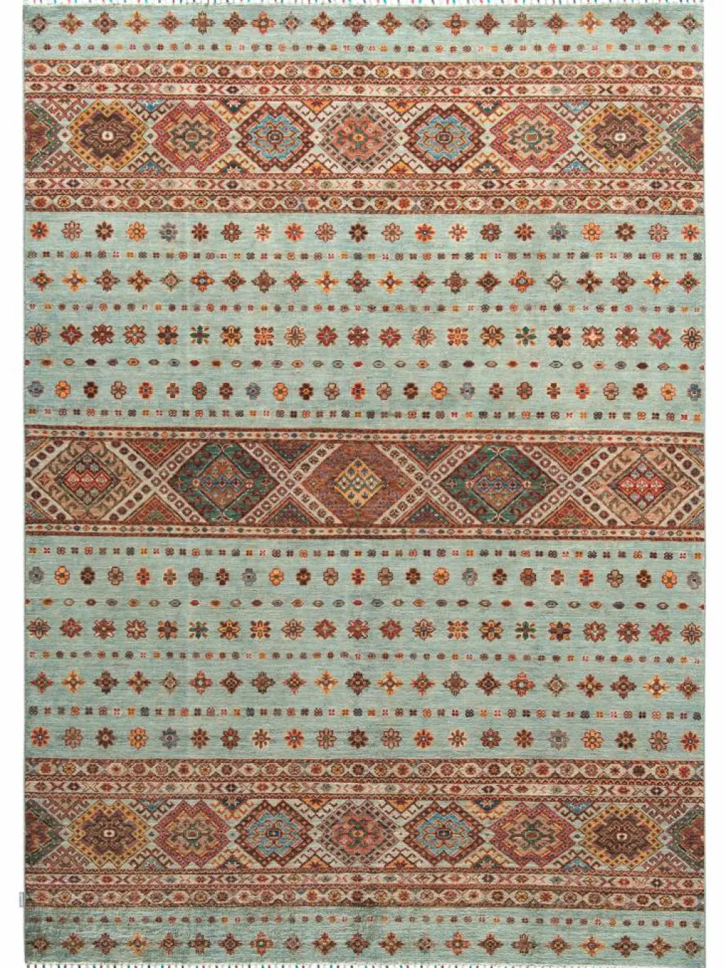 -Muster sind bunte Längsstreifen mit vielen verschiedenen Motiven gefüllt. Durch den flachen und festen Flor ist der Teppich unempfindlich gegenüber den Belastungen des Alltags.- Das Besondere an diesemOrientteppich