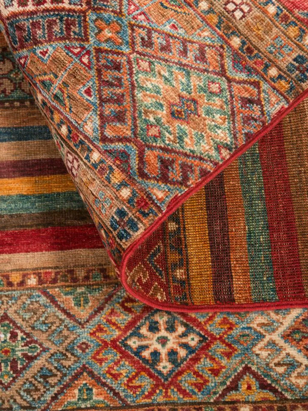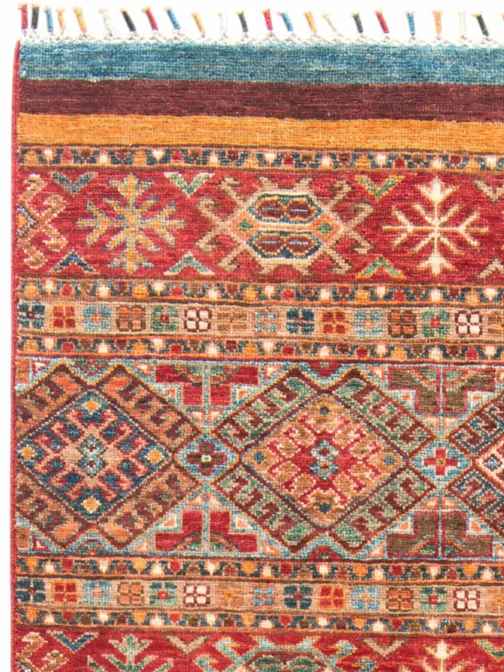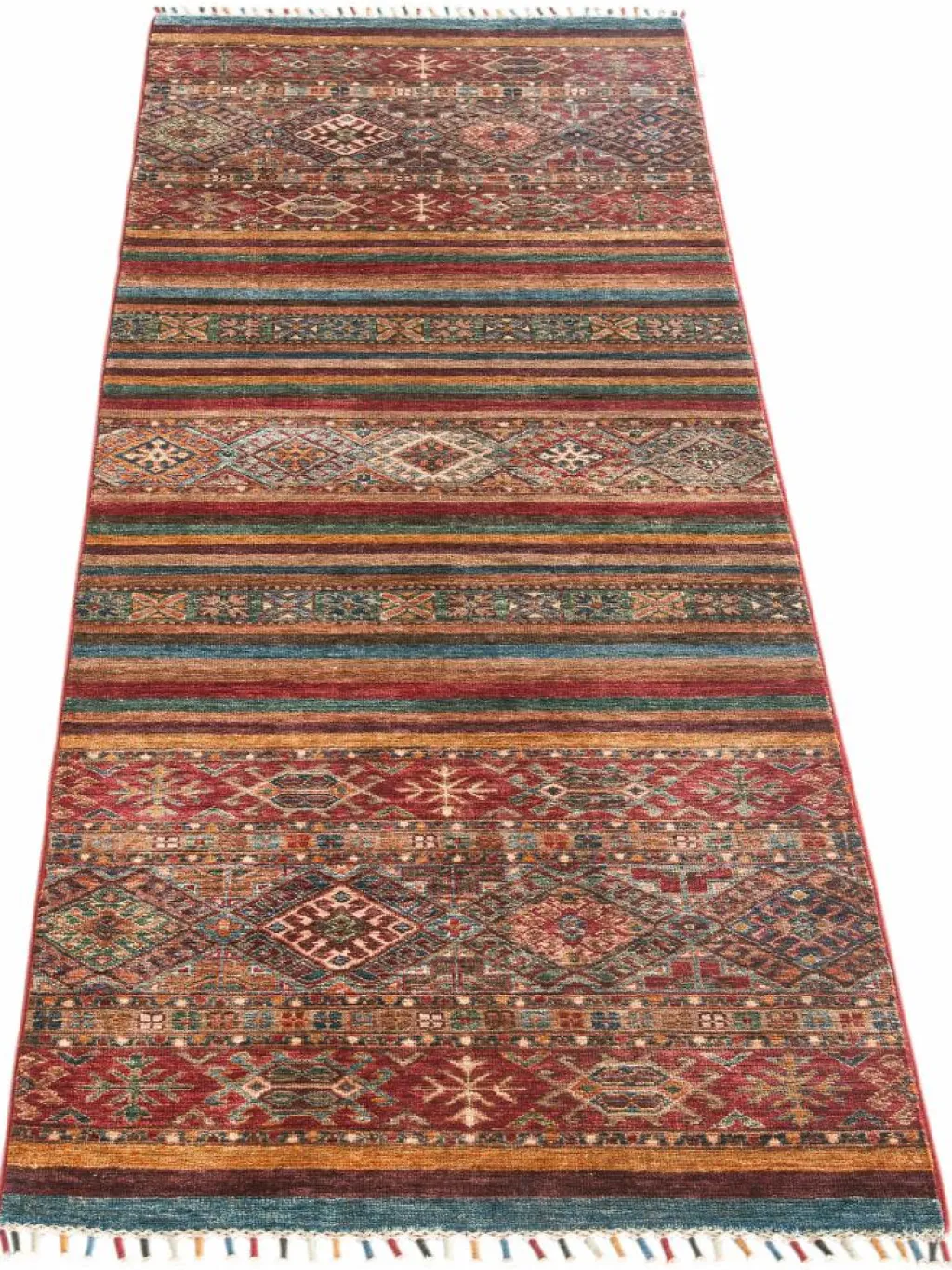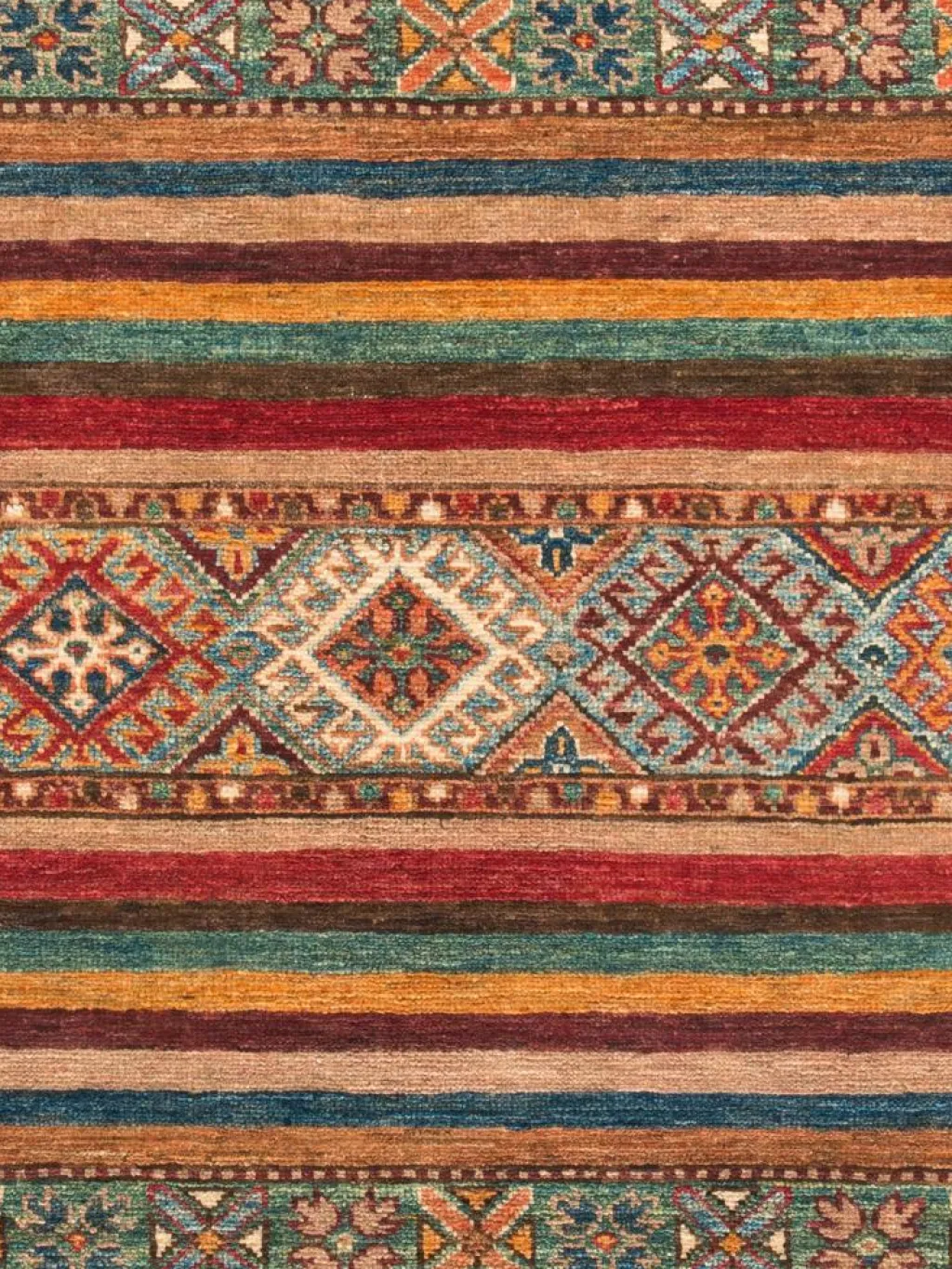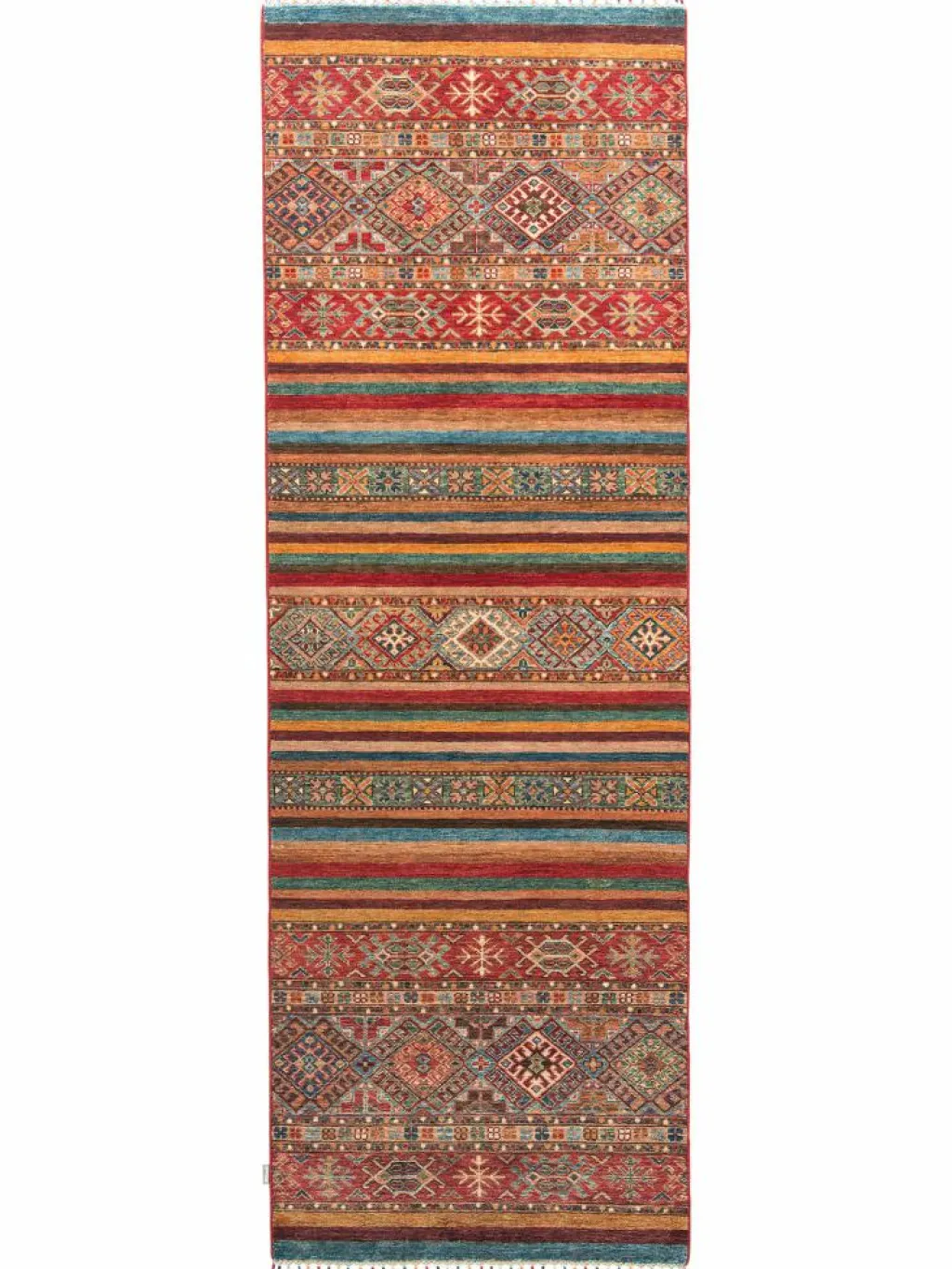-Muster sind bunte Längsstreifen mit vielen verschiedenen Motiven gefüllt. Durch den flachen und festen Flor ist der Teppich unempfindlich gegenüber den Belastungen des Alltags.- Das Besondere an diesemOrientteppich