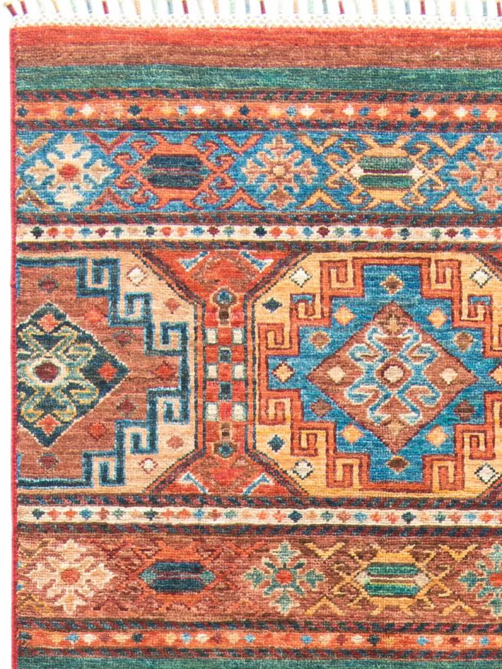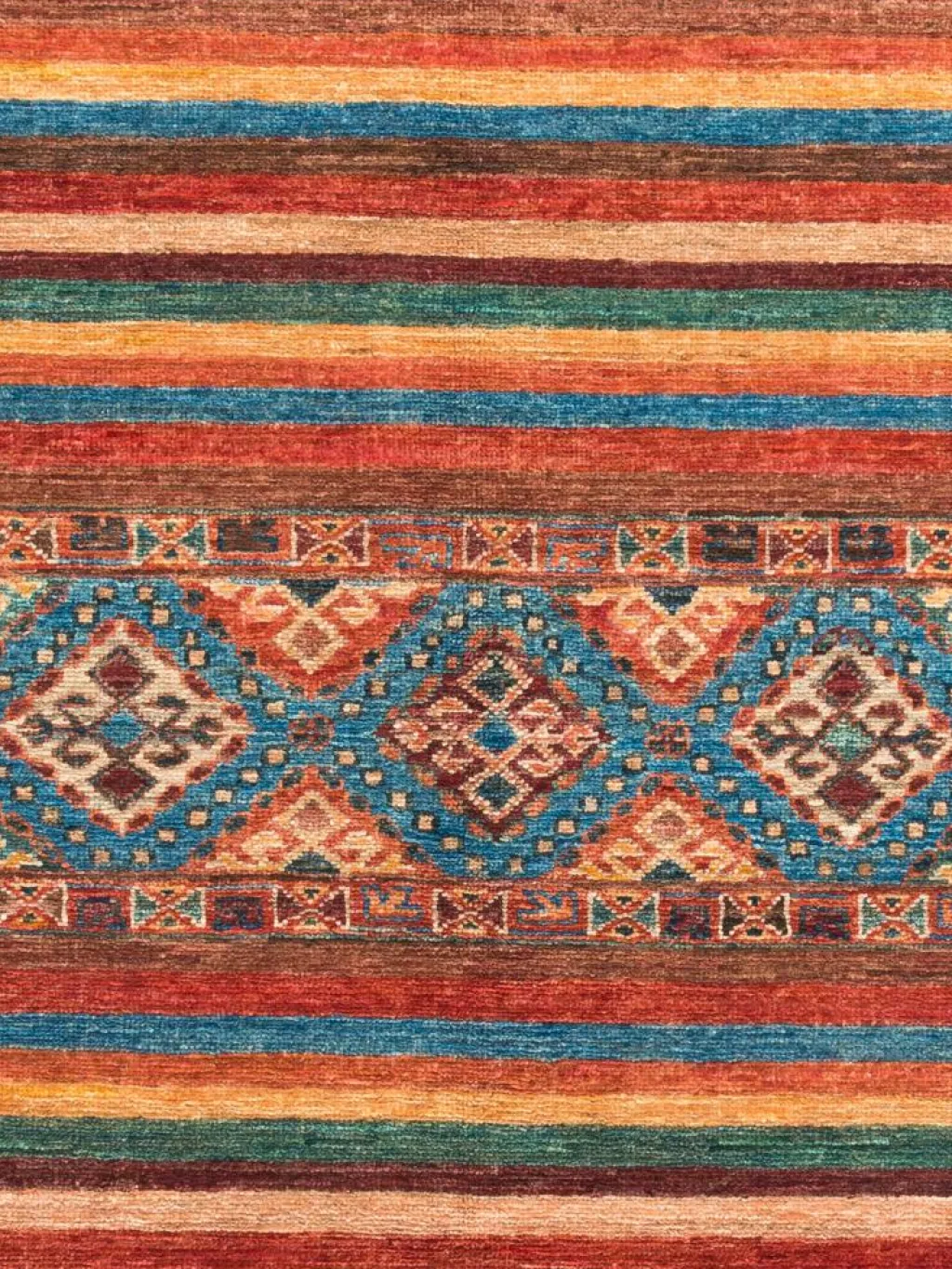 -Muster sind bunte Längsstreifen mit vielen verschiedenen Motiven gefüllt. Durch den flachen und festen Flor ist der Teppich unempfindlich gegenüber den Belastungen des Alltags.- Das Besondere an diesemOrientteppich
