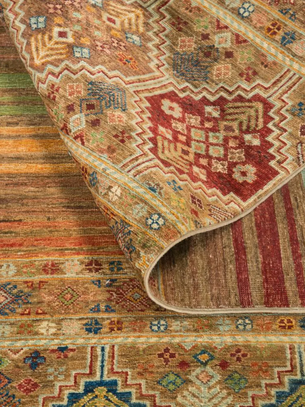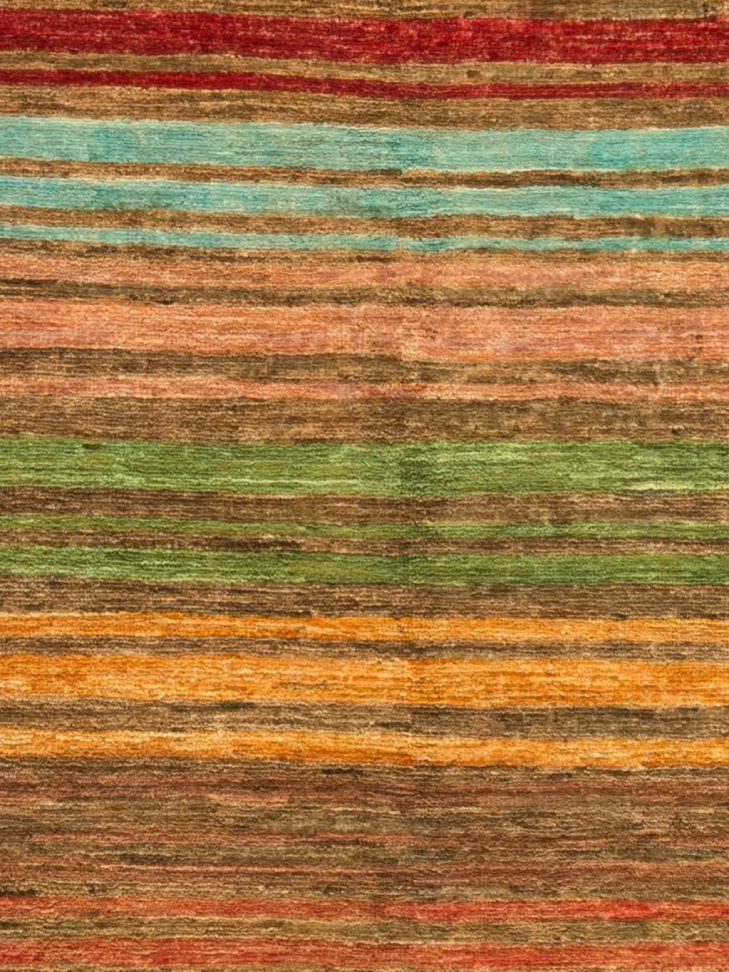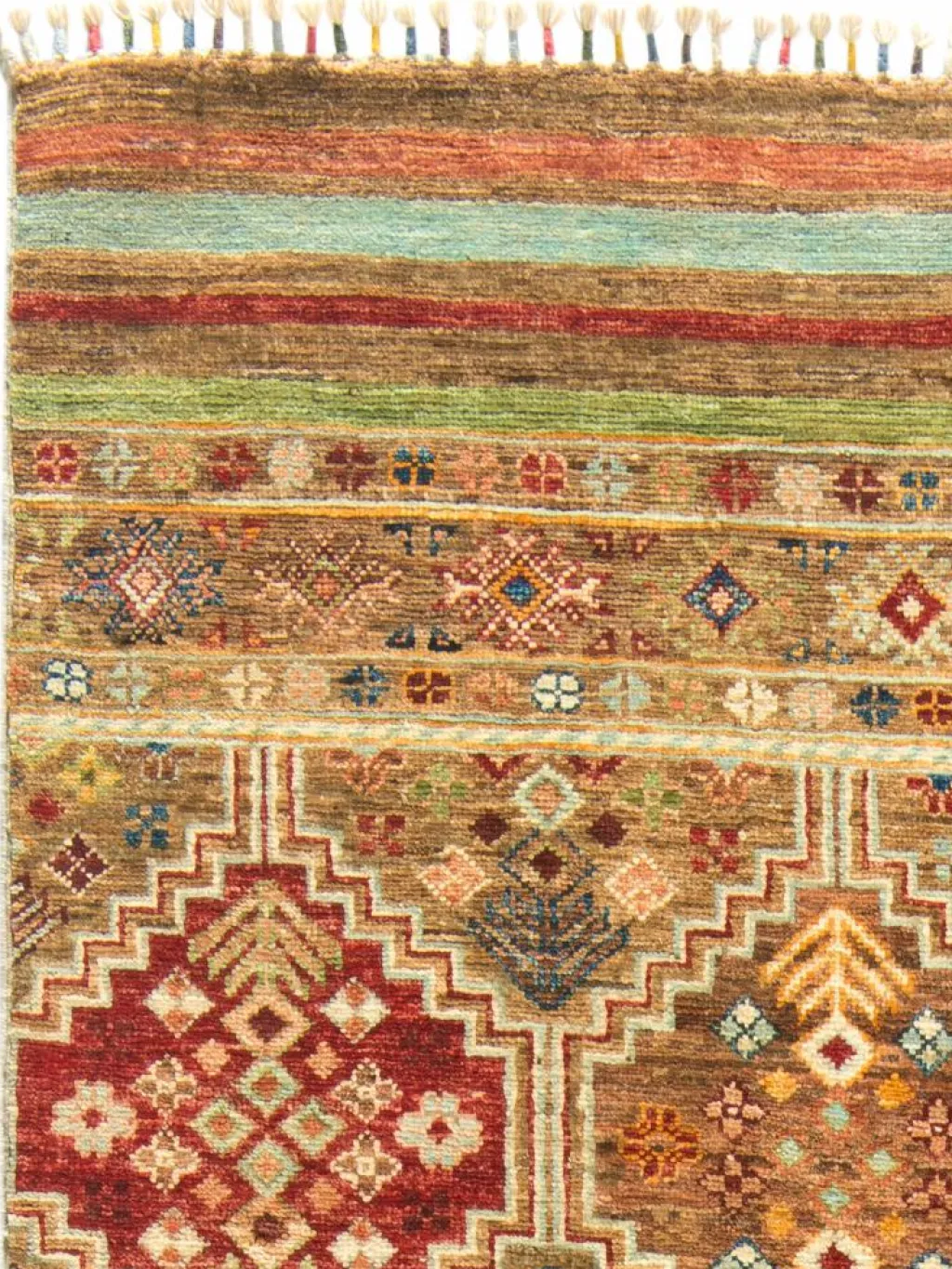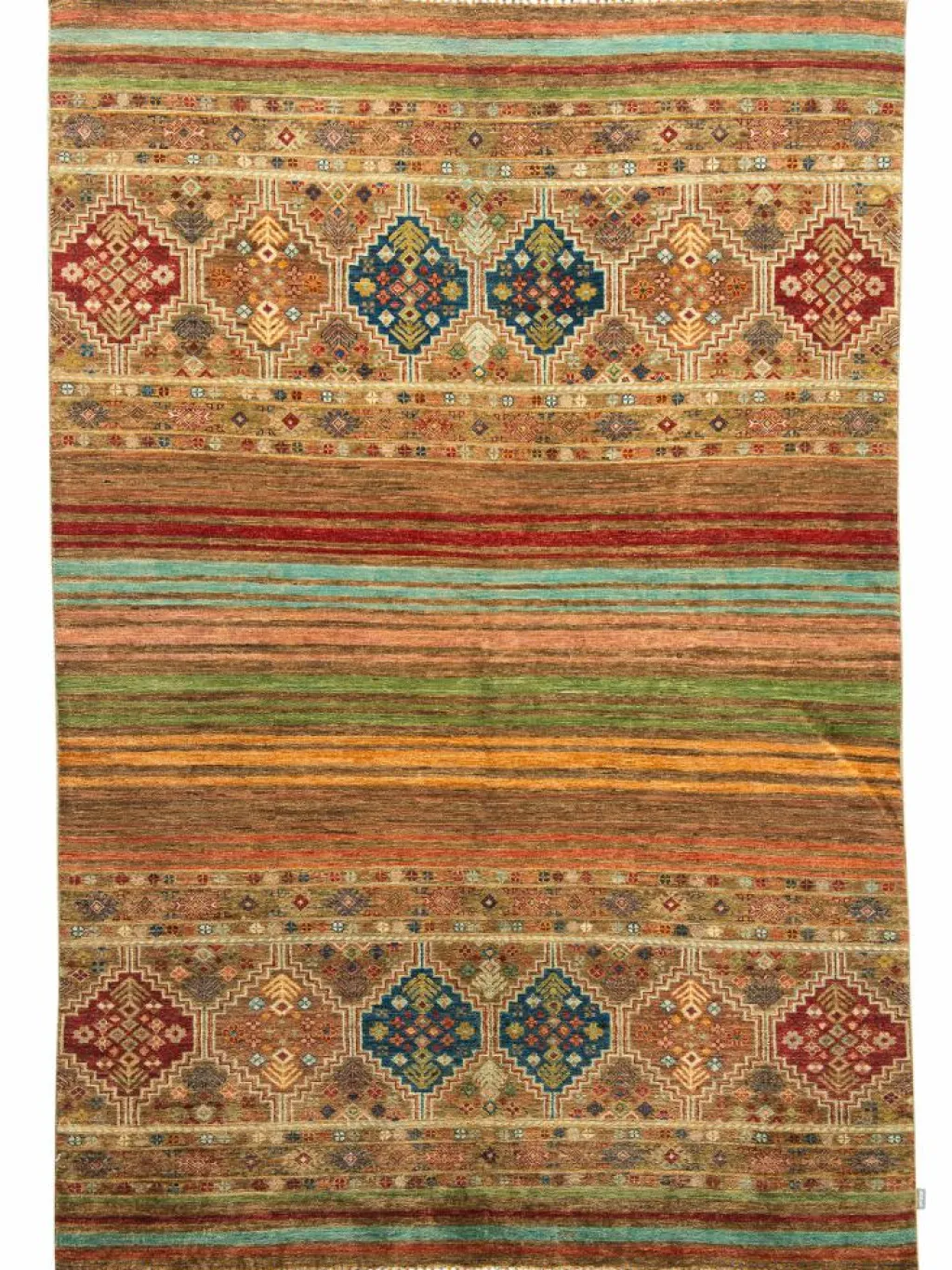 -Muster sind bunte Längsstreifen mit vielen verschiedenen Motiven gefüllt. Durch den flachen und festen Flor ist der Teppich unempfindlich gegenüber den Belastungen des Alltags.- Das Besondere an diesemOrientteppich