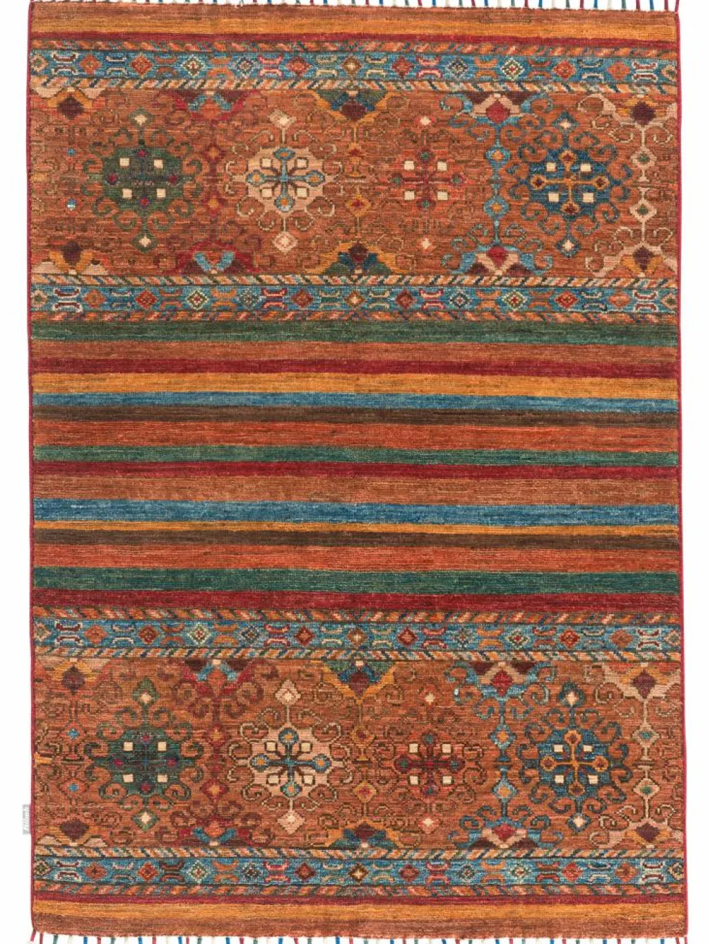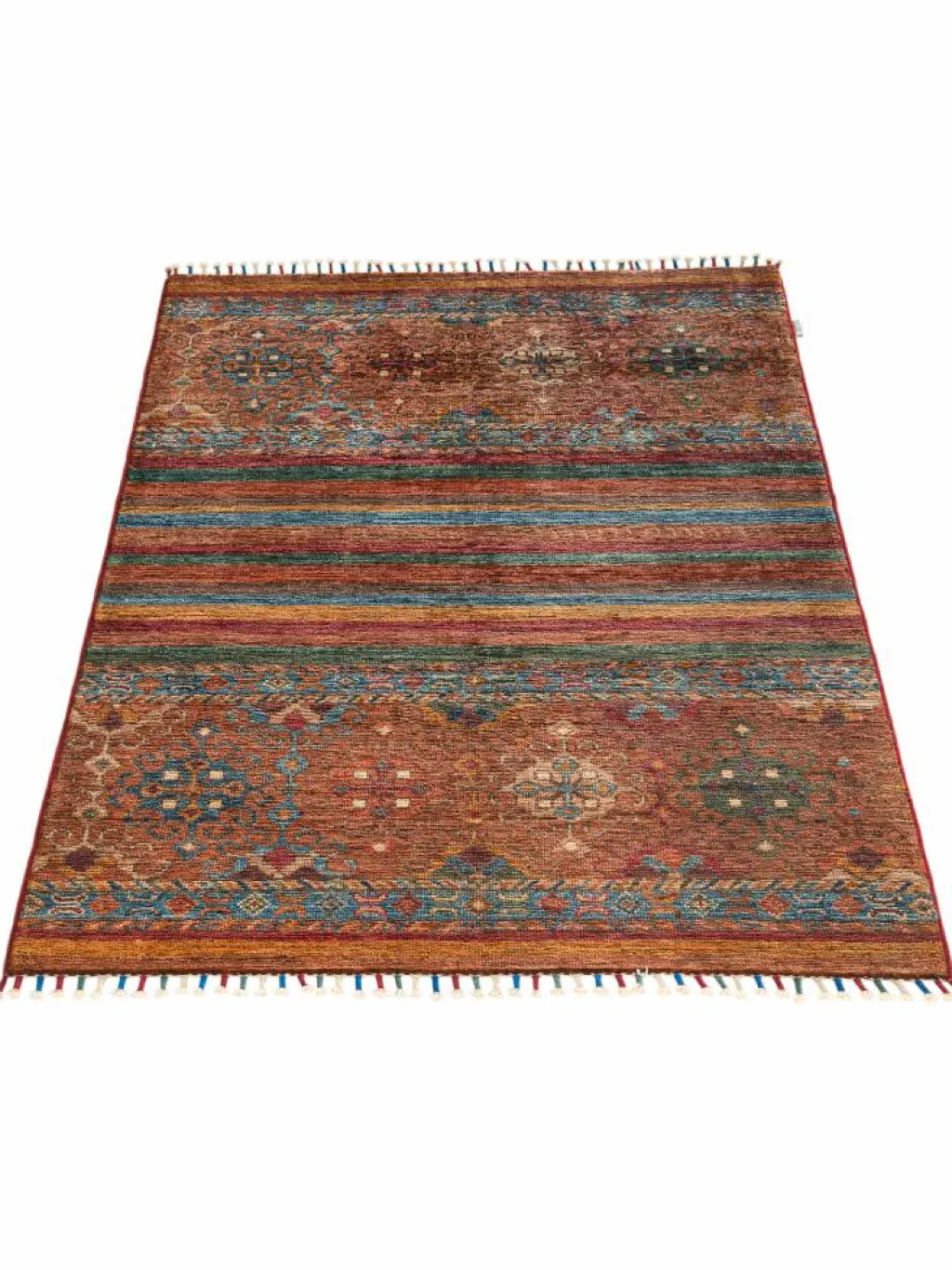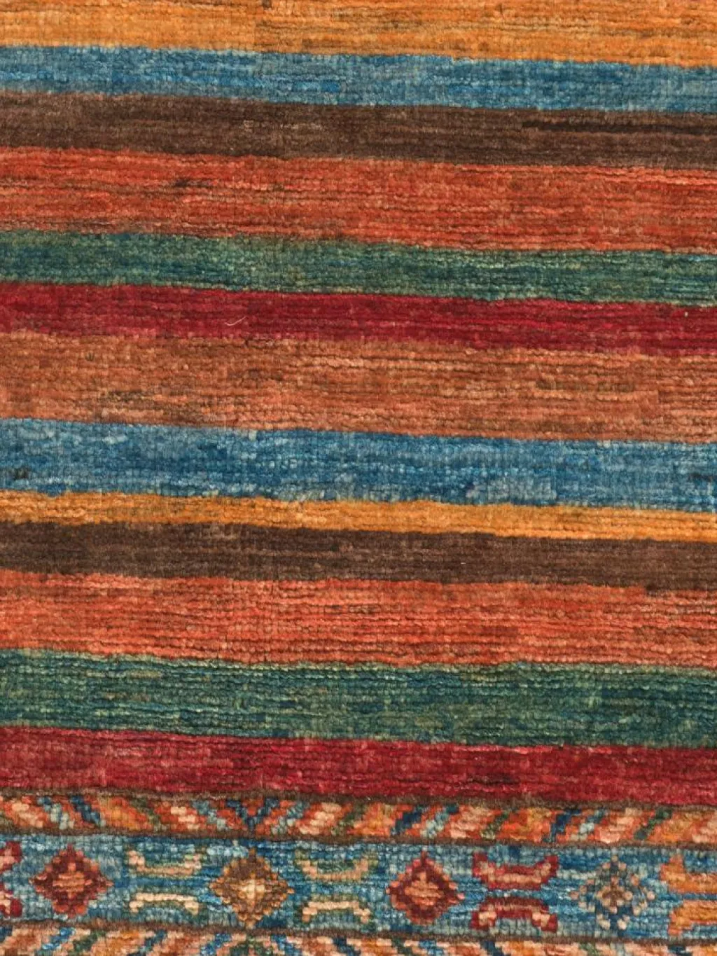 -Muster sind bunte Längsstreifen mit vielen verschiedenen Motiven gefüllt. Durch den flachen und festen Flor ist der Teppich unempfindlich gegenüber den Belastungen des Alltags.- Das Besondere an diesemOrientteppich