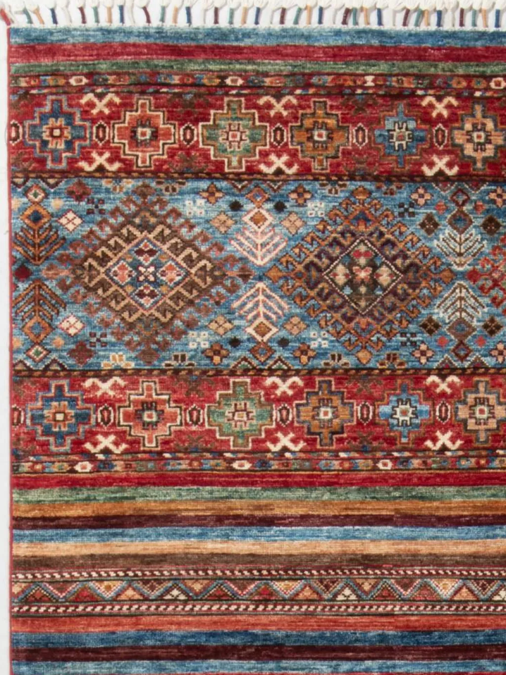 -Muster sind bunte Längsstreifen mit vielen verschiedenen Motiven gefüllt. Durch den flachen und festen Flor ist der Teppich unempfindlich gegenüber den Belastungen des Alltags. – Das Besondere an diesemOrientteppich
