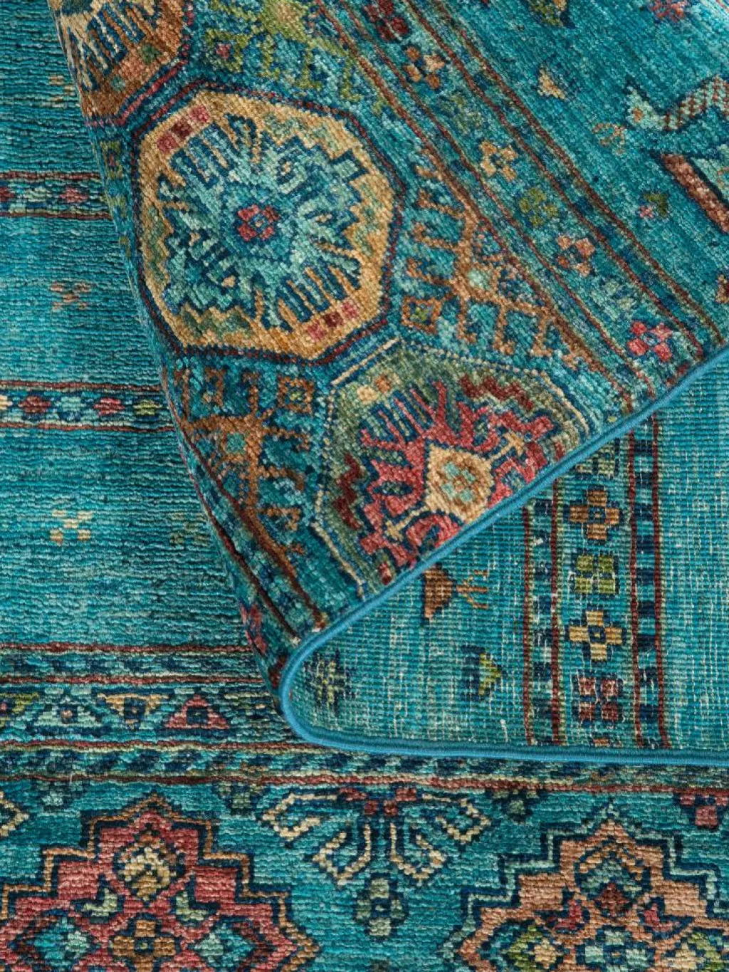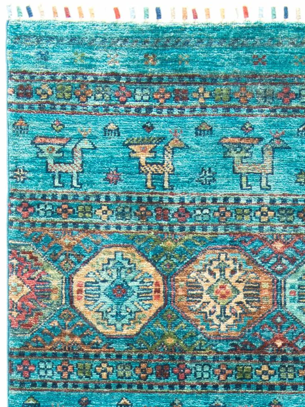 -Muster sind bunte Längsstreifen mit vielen verschiedenen Motiven gefüllt. Durch den flachen und festen Flor ist der Teppich unempfindlich gegenüber den Belastungen des Alltags.- Das Besondere an diesemOrientteppich