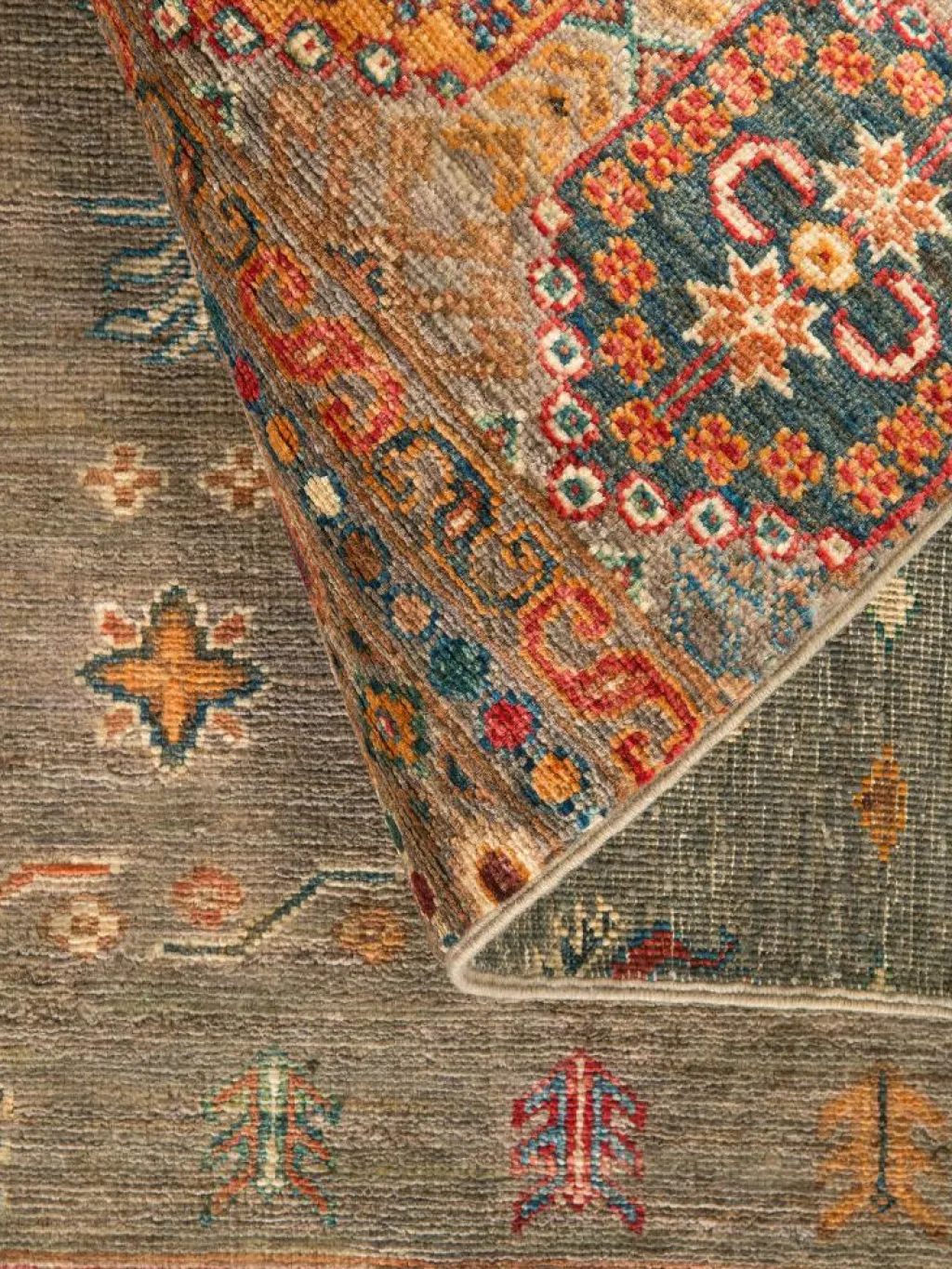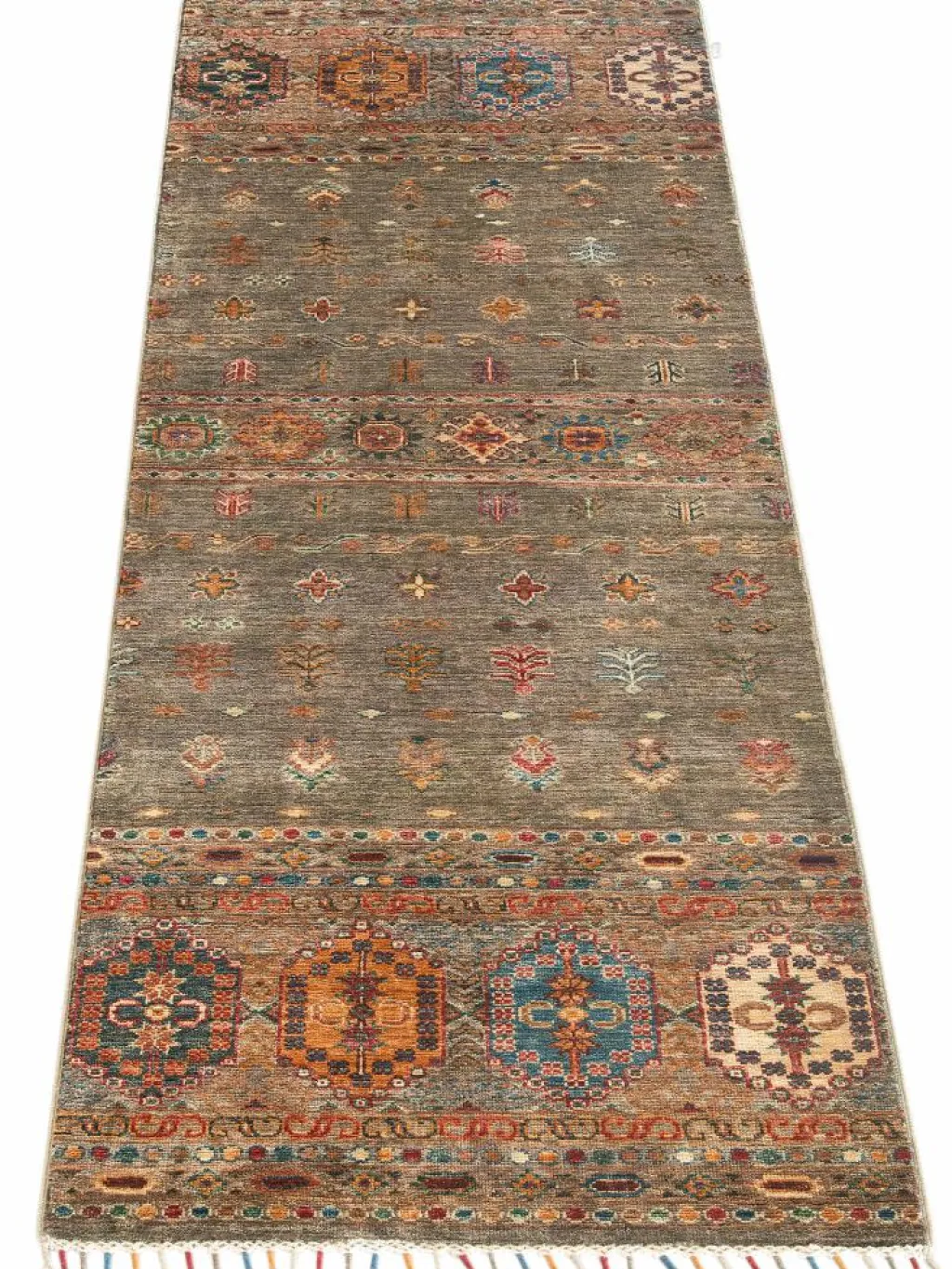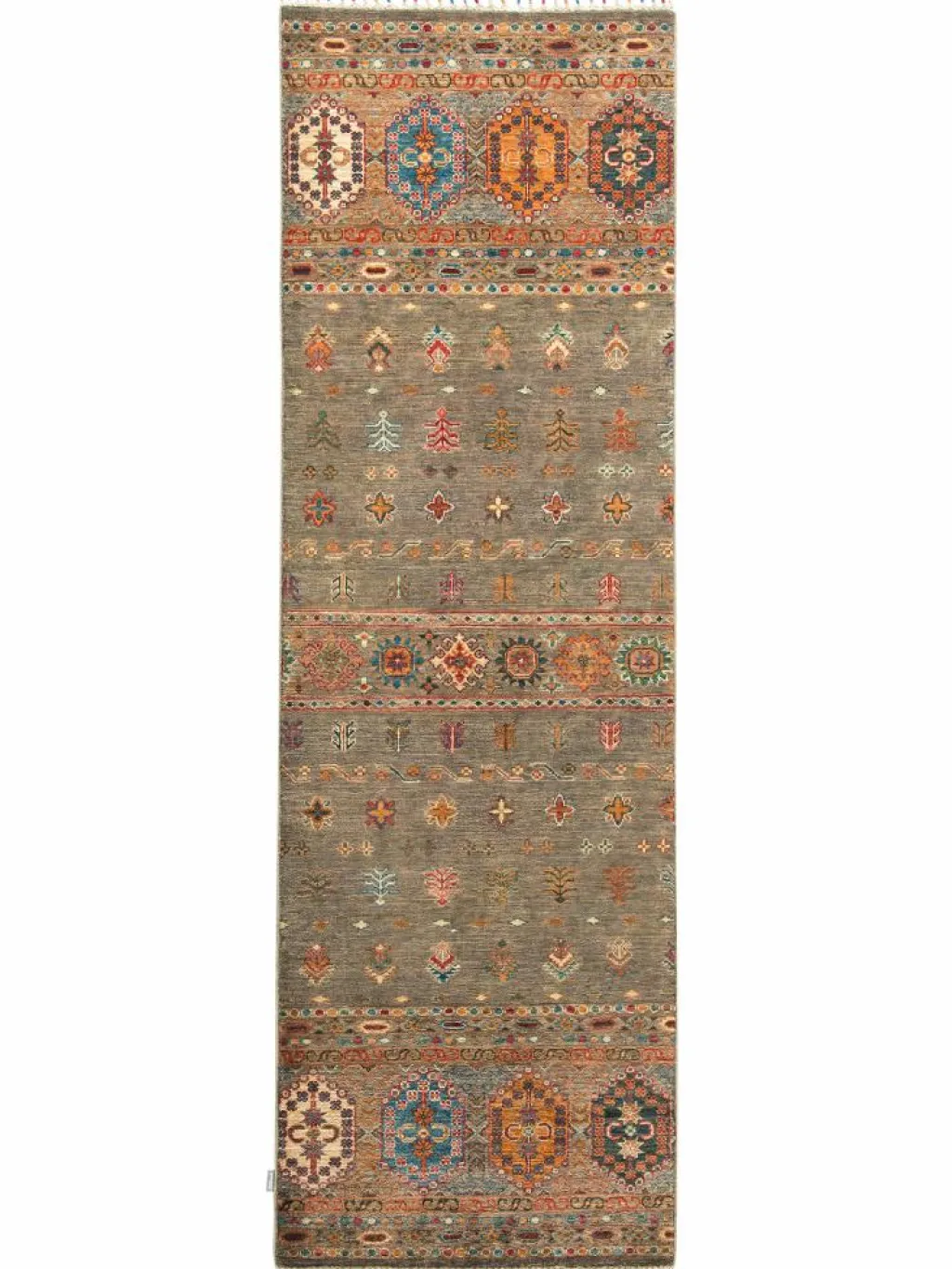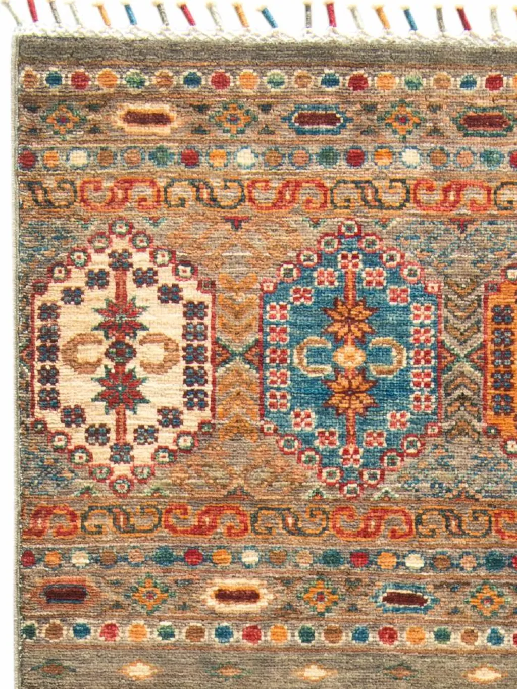 -Muster sind bunte Längsstreifen mit vielen verschiedenen Motiven gefüllt. Durch den flachen und festen Flor ist der Teppich unempfindlich gegenüber den Belastungen des Alltags.- Das Besondere an diesemOrientteppich