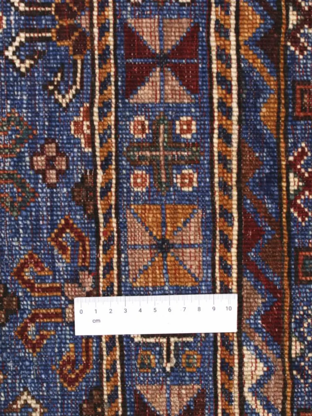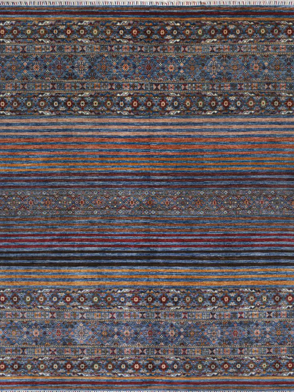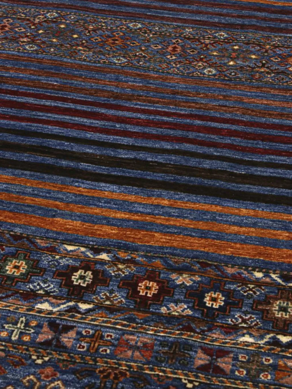 -Muster sind bunte Längsstreifen mit vielen verschiedenen Motiven gefüllt. Durch den flachen und festen Flor ist der Teppich unempfindlich gegenüber den Belastungen des Alltags. – Das Besondere an diesemOrientteppich