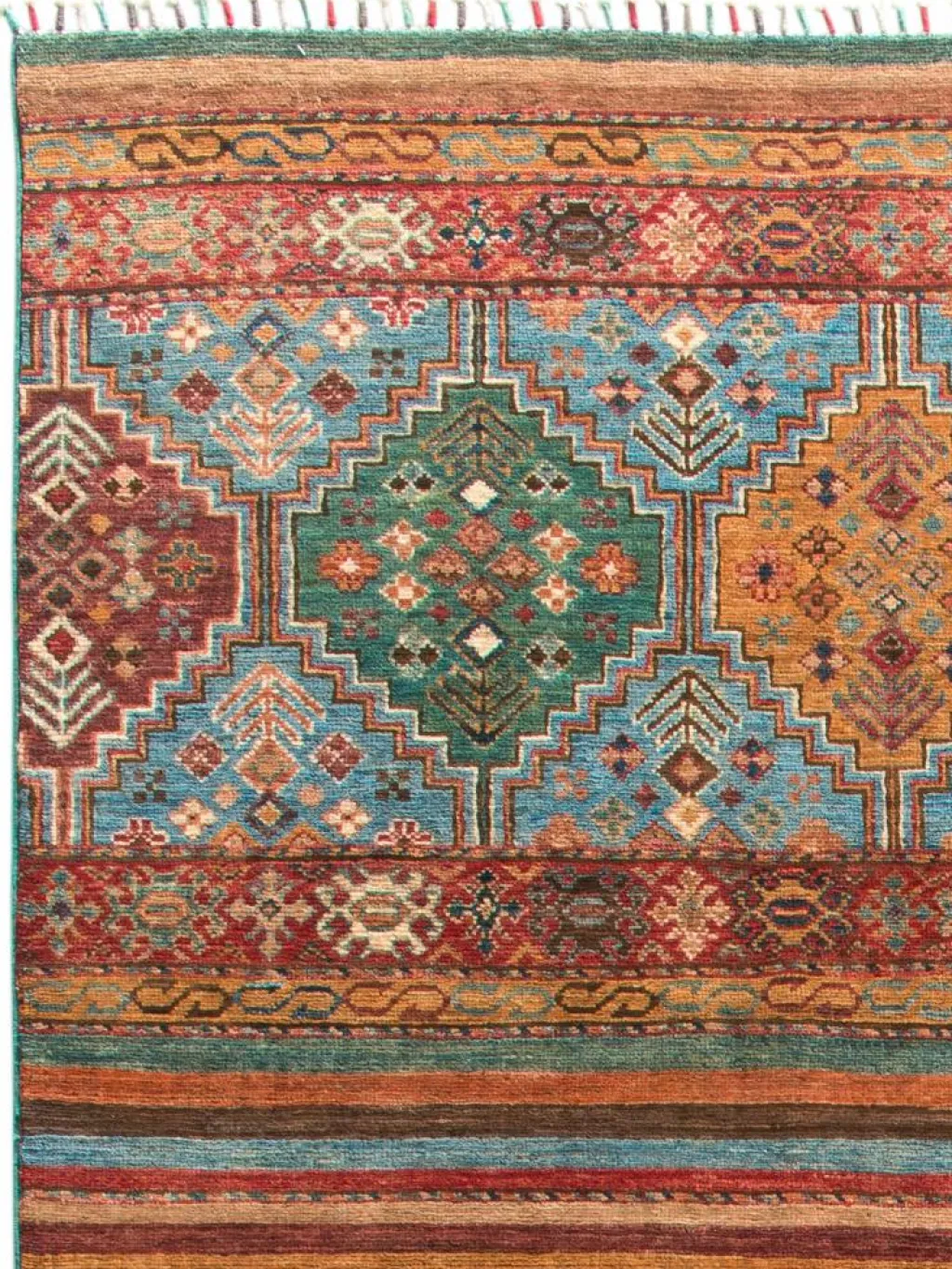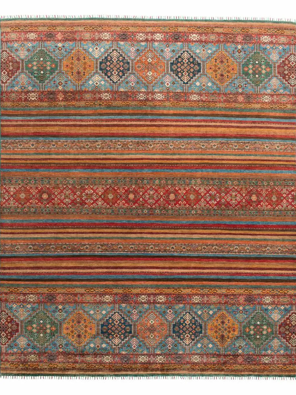 -Muster sind bunte Längsstreifen mit vielen verschiedenen Motiven gefüllt. Durch den flachen und festen Flor ist der Teppich unempfindlich gegenüber den Belastungen des Alltags.- Das Besondere an diesemOrientteppich