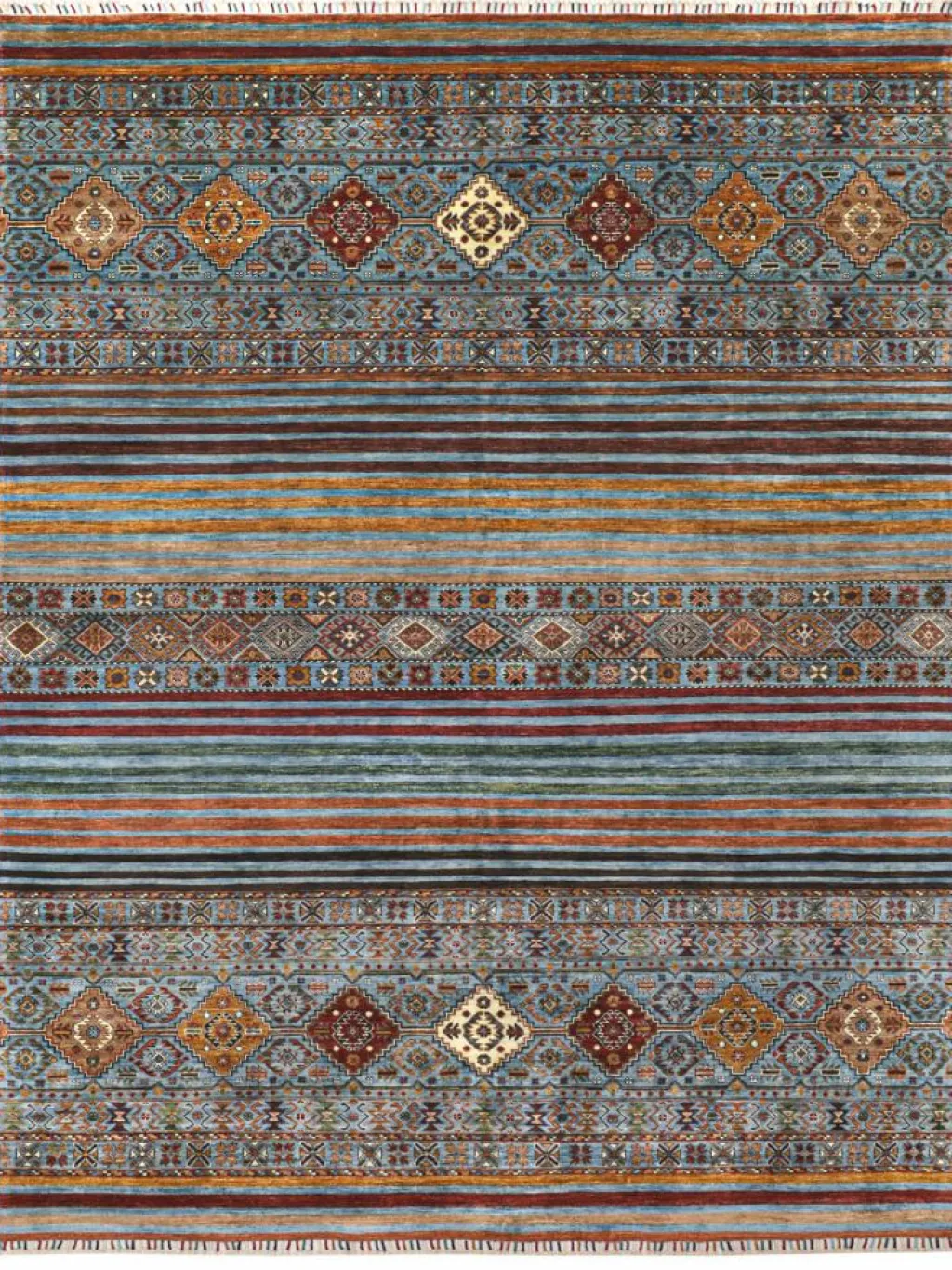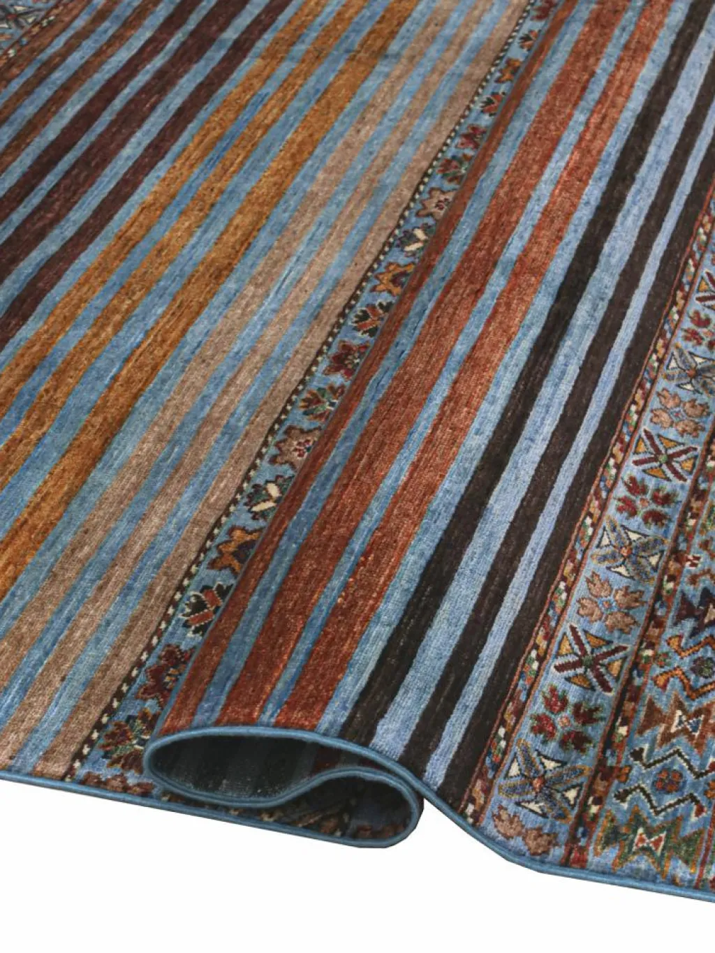 -Muster sind bunte Längsstreifen mit vielen verschiedenen Motiven gefüllt. Durch den flachen und festen Flor ist der Teppich unempfindlich gegenüber den Belastungen des Alltags. – Das Besondere an diesemOrientteppich
