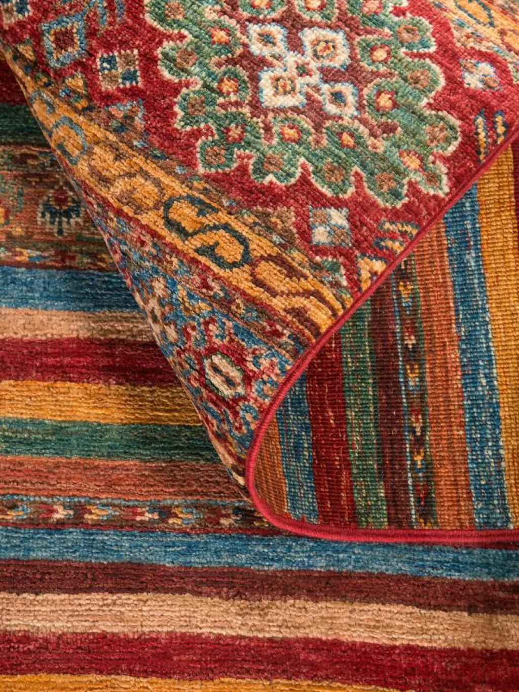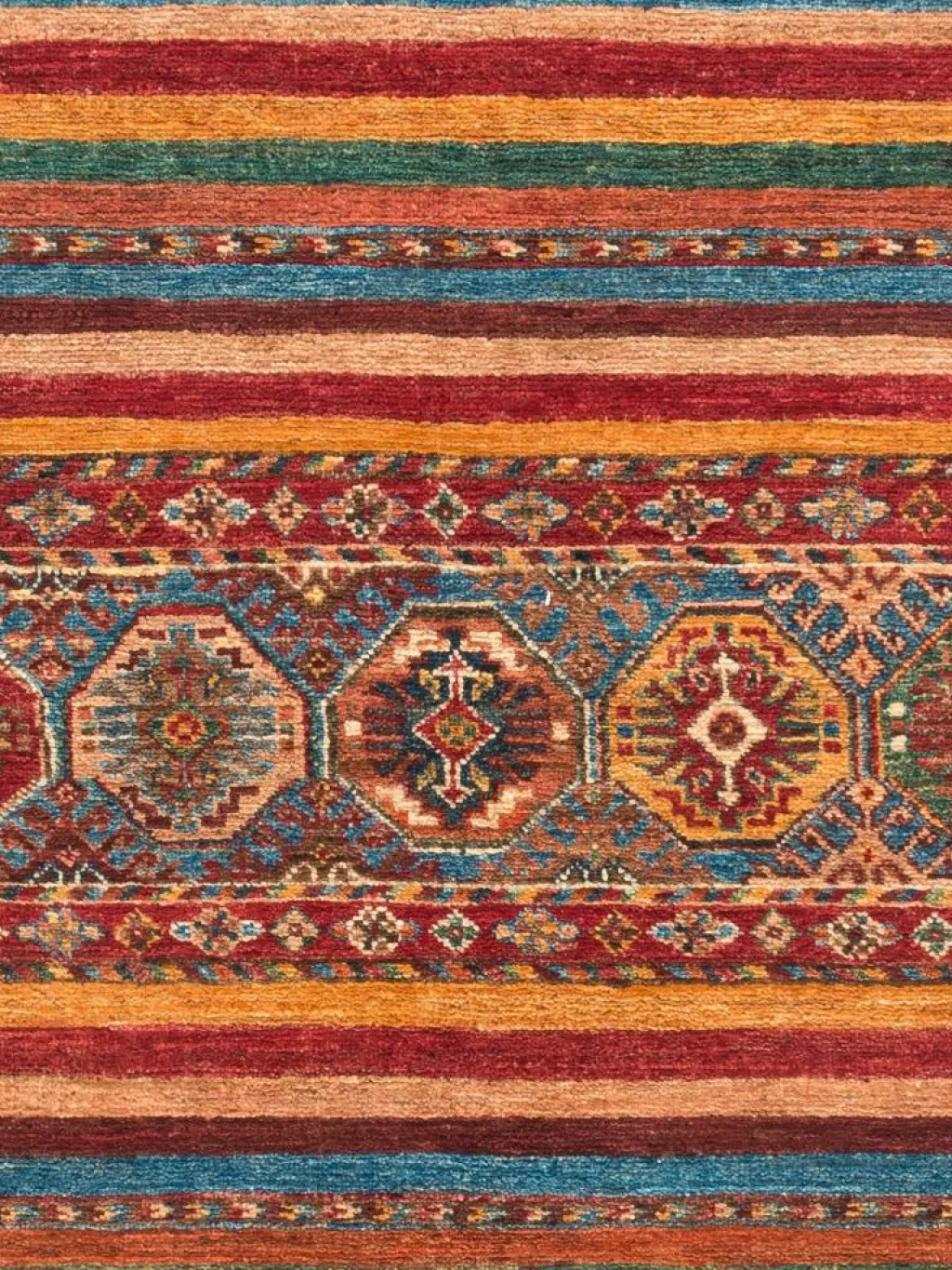 -Muster sind bunte Längsstreifen mit vielen verschiedenen Motiven gefüllt. Durch den flachen und festen Flor ist der Teppich unempfindlich gegenüber den Belastungen des Alltags.- Das Besondere an diesemOrientteppich
