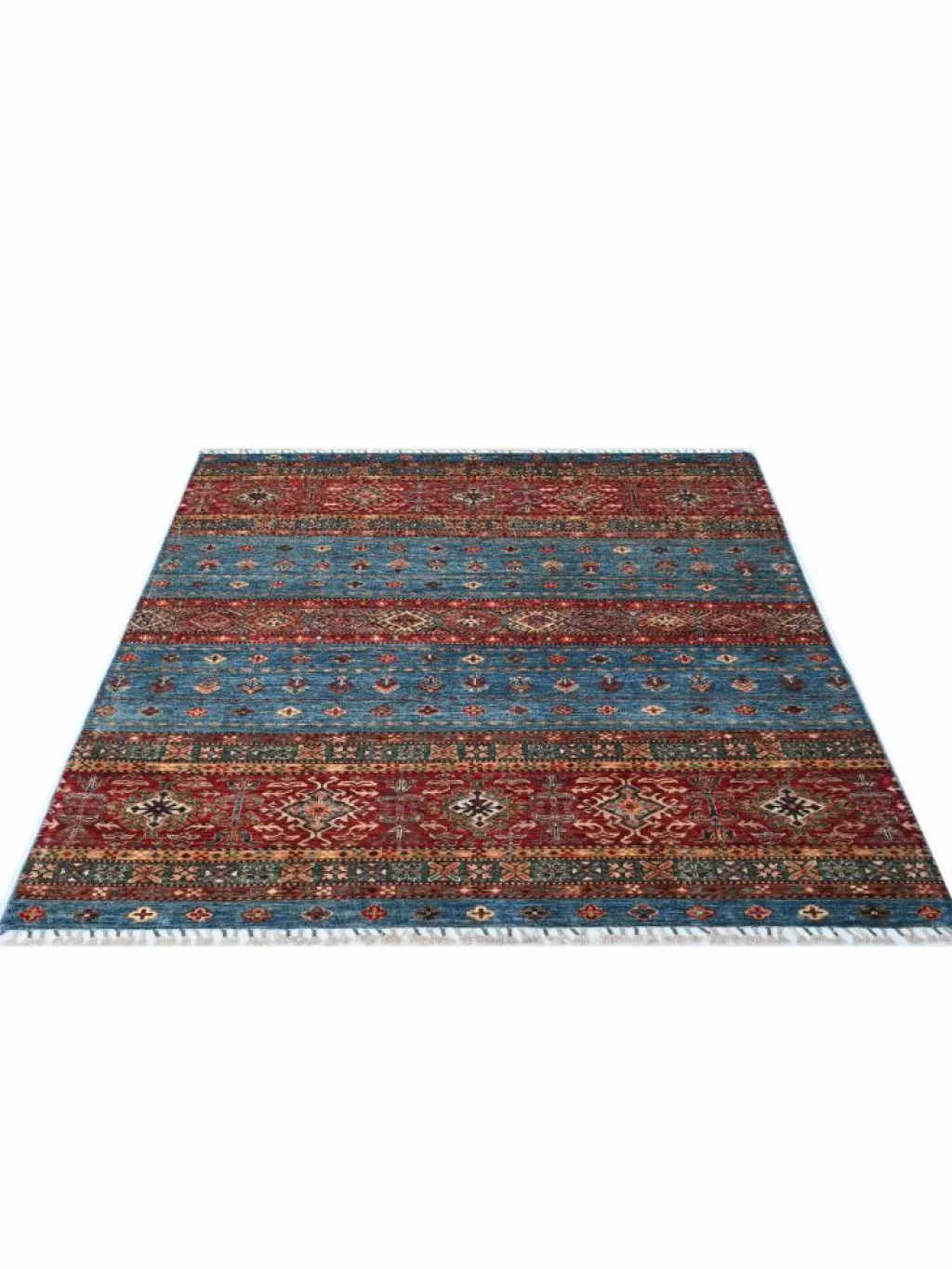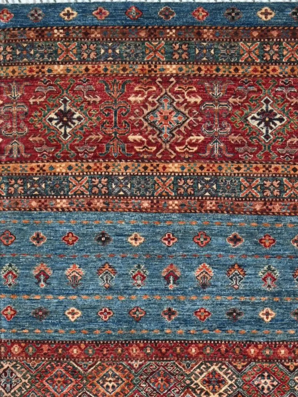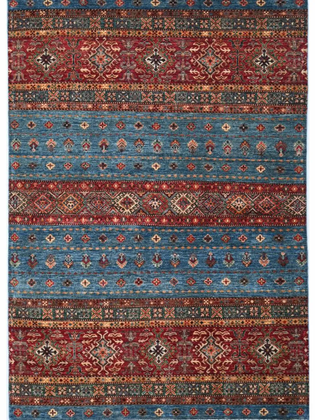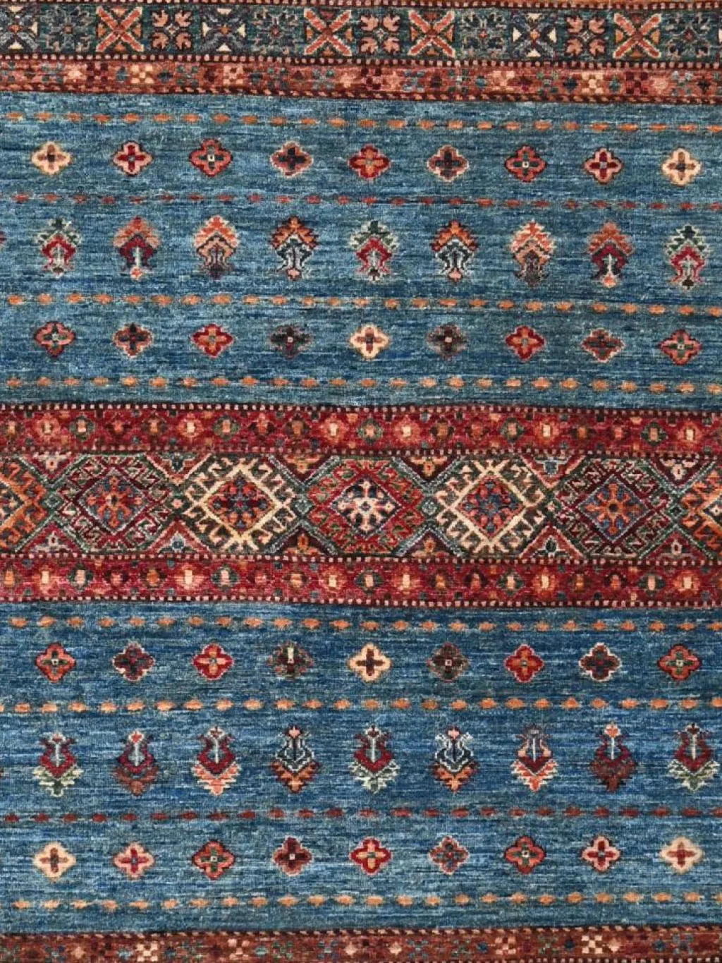 -Muster sind bunte Längsstreifen mit vielen verschiedenen Motiven gefüllt. Durch den flachen und festen Flor ist der Teppich unempfindlich gegenüber den Belastungen des Alltags. – Das Besondere an diesemOrientteppich