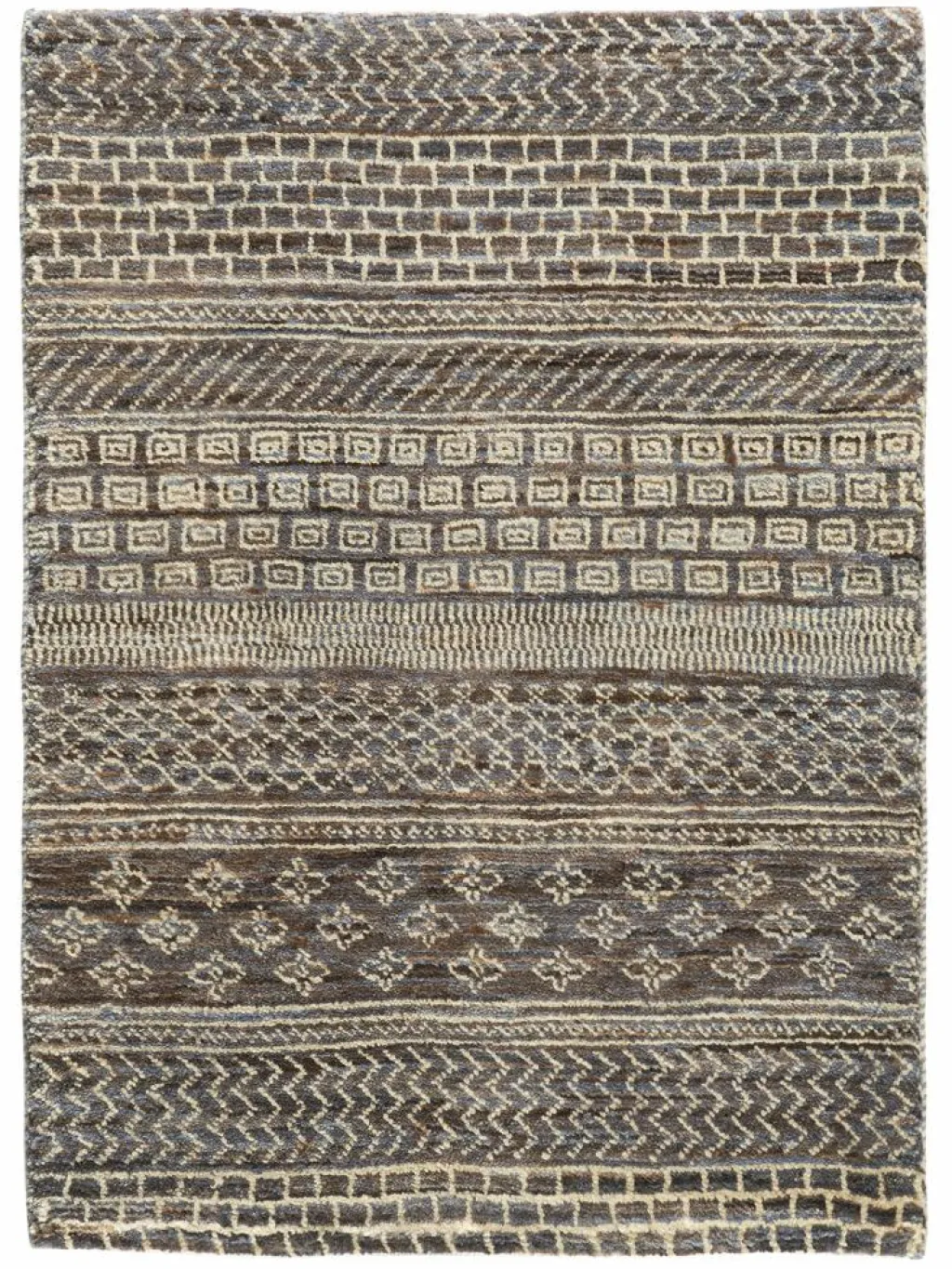 ist eine ungewöhnliche moderne Variation des traditionellen persichen Gabbehs. Er ist kürzer im Flor und feiner geknüpft. Es gibt zahllose Neukreationen in individuellen und einzigartigen Farben und Mustern.| Gesamthöhe: | ca. 10 mm |