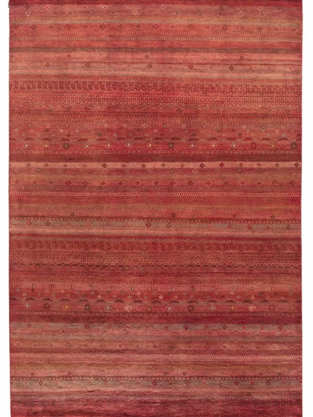 ist eine ungewöhnliche moderne Variation des traditionellen persichen Gabbehs. Er ist kürzer im Flor und feiner geknüpft. Es gibt zahllose Neukreationen in individuellen und einzigartigen Farben und Mustern.| Gesamthöhe: | ca. 7 mm |