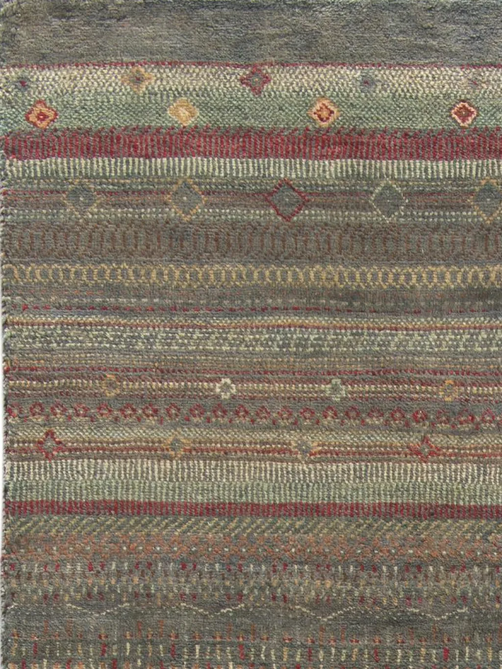 ist eine ungewöhnliche moderne Variation des traditionellen persichen Gabbehs. Er ist kürzer im Flor und feiner geknüpft. Es gibt zahllose Neukreationen in individuellen und einzigartigen Farben und Mustern.| Gesamthöhe: | ca. 8 mm |