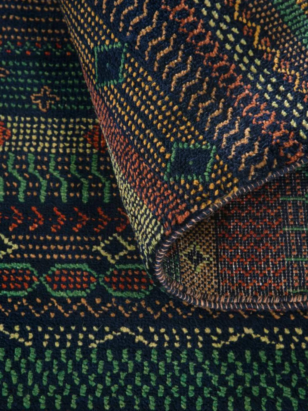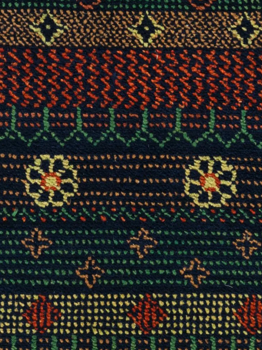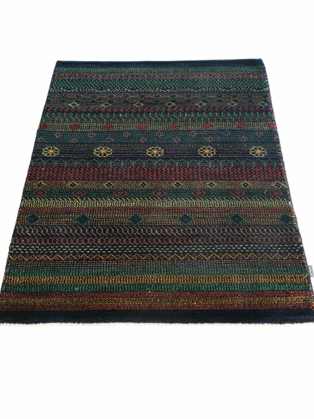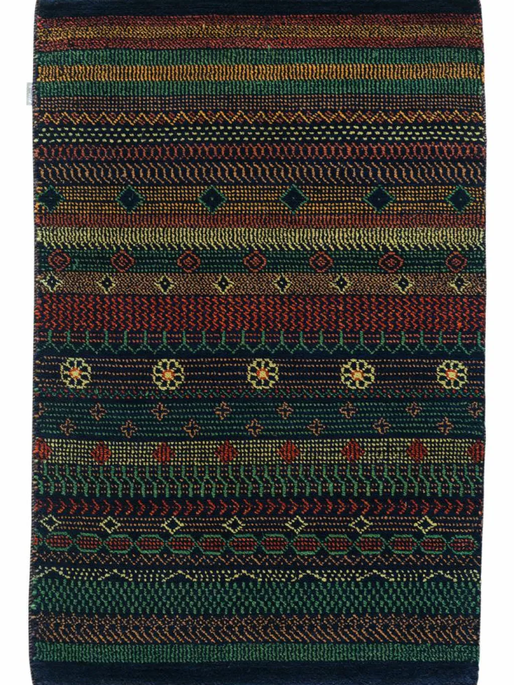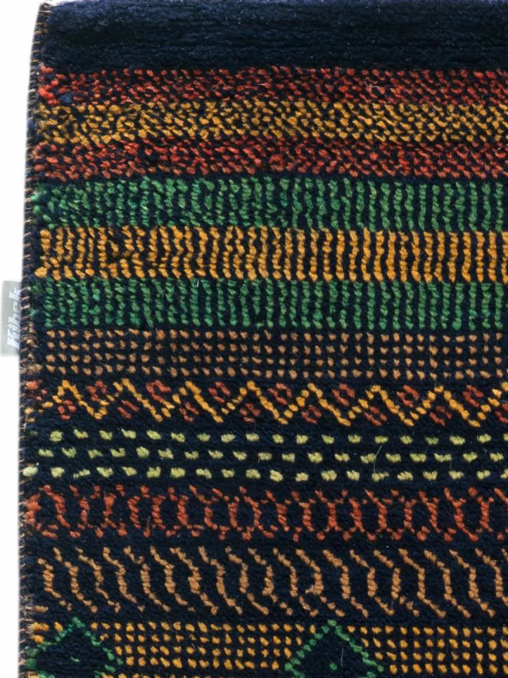 ist eine ungewöhnliche moderne Variation des traditionellen persichen Gabbehs. Er ist kürzer im Flor und feiner geknüpft. Es gibt zahllose Neukreationen in individuellen und einzigartigen Farben und Mustern.| Gesamthöhe: | ca. 10 mm |